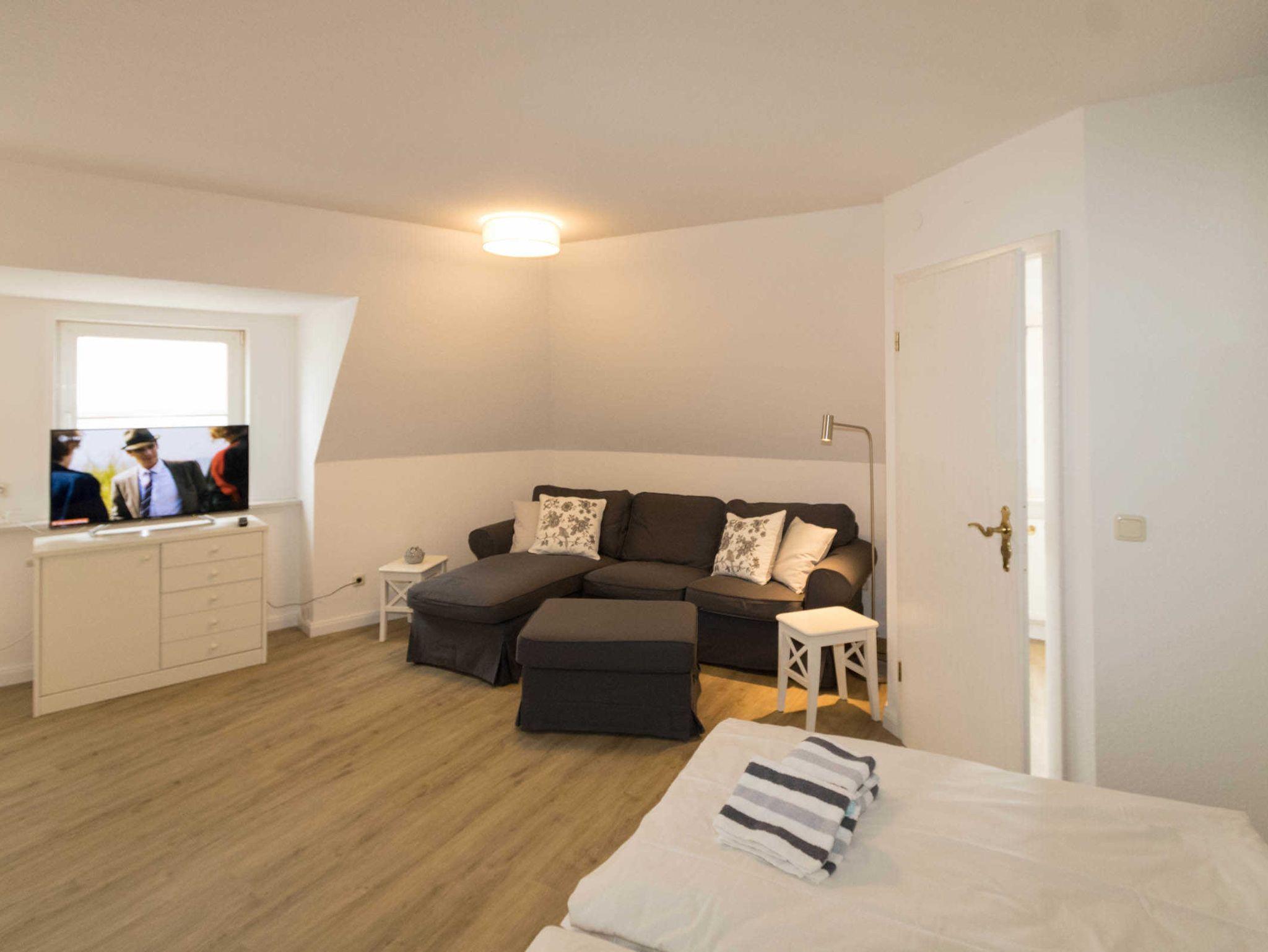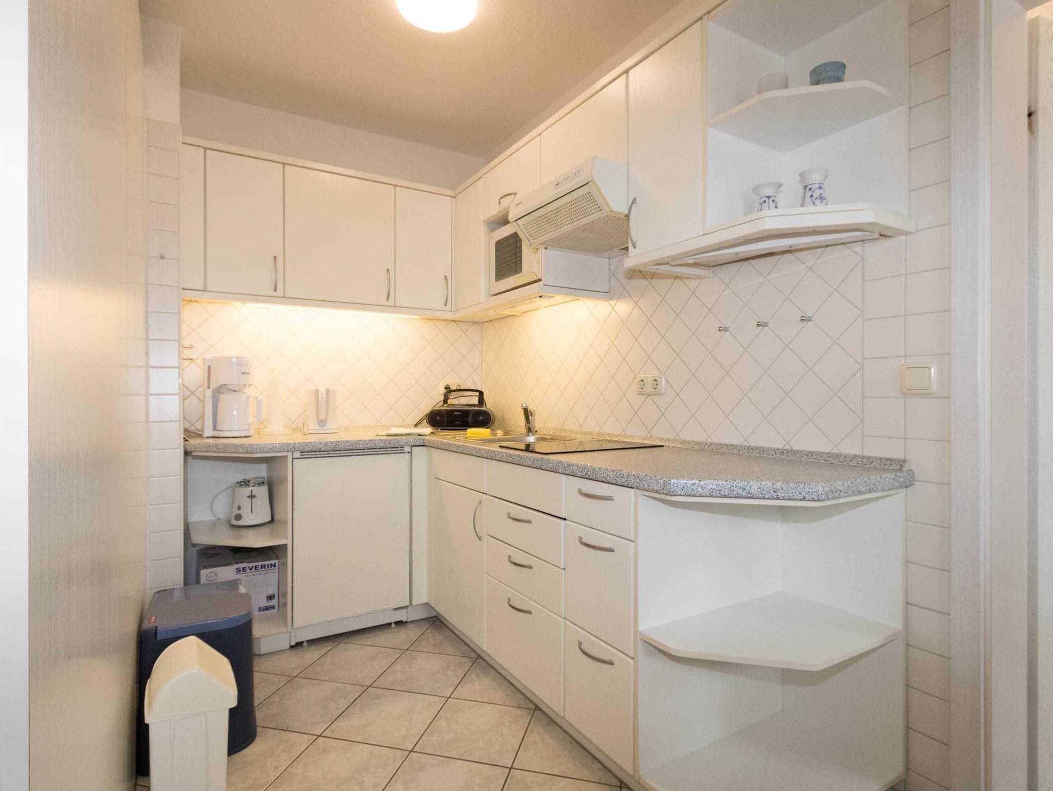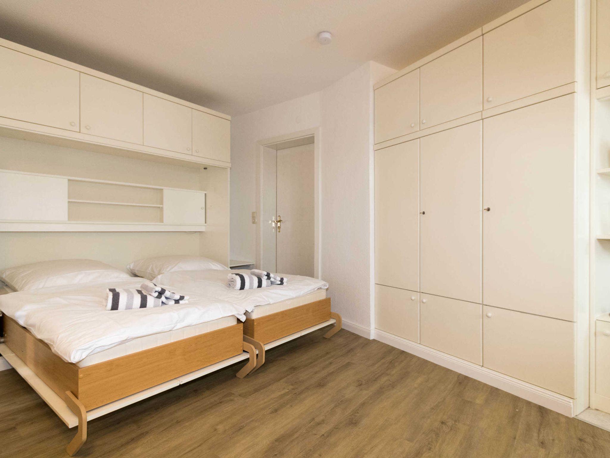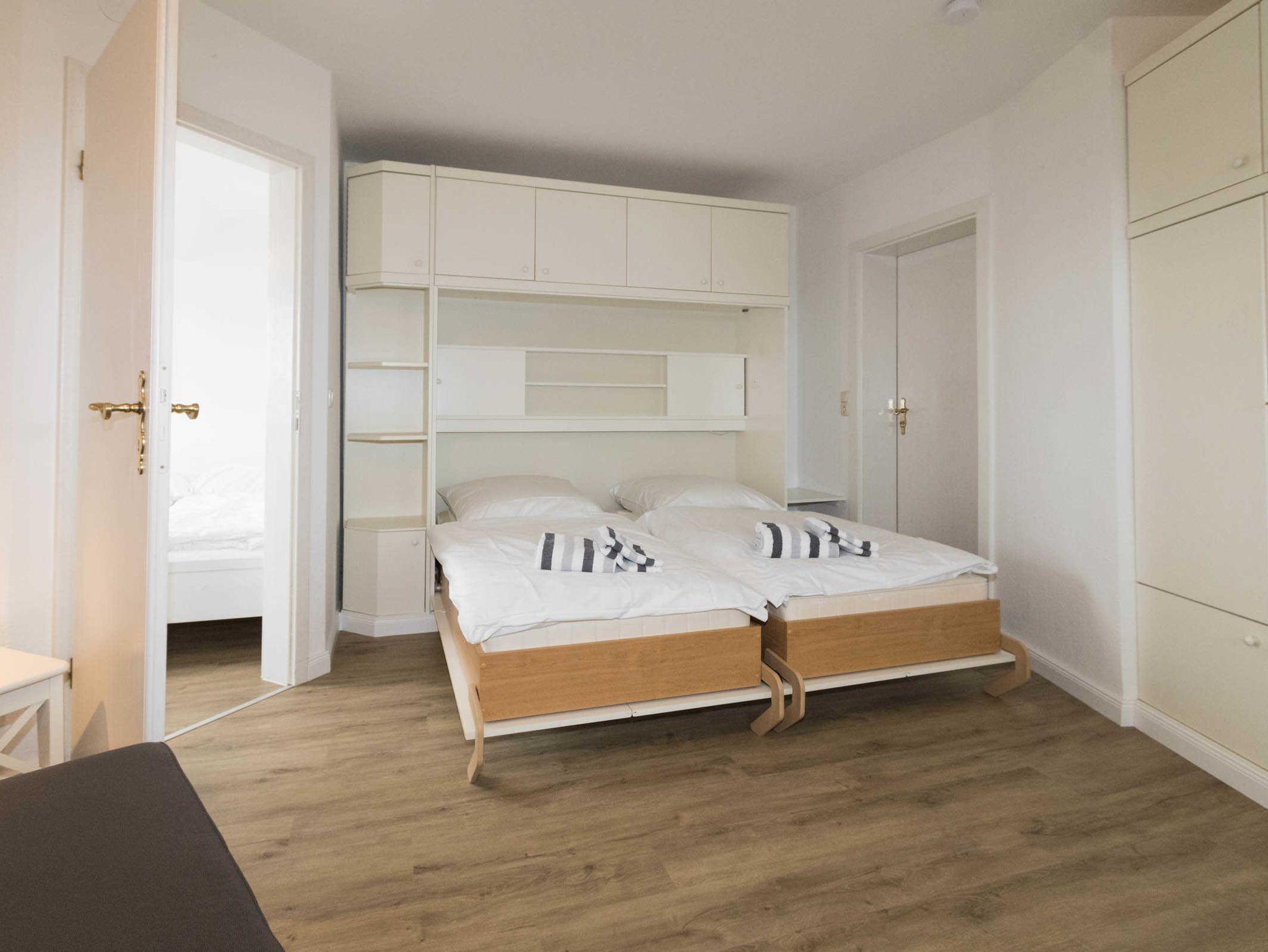 Die Wohnung 2 verfügt über einen kombinierten Wohn-Schlafraum mit einem Schrankbett. Die kleine Küchenzeile ist vom Wohnraum optisch abgetrennt und hat einen 2-Platten-Herd, Mikrowelle und Kühlschrank mit Gefrierfach. Das Schrankbett im Wohnbereich kann einzeln ausgeklappt werden. Der Esstisch ist für 4 Personen ausgerichtet. Zur Wohnung gehört noch ein weiteres kleines Zimmer mit 2 Einzelbetten, für die 3. und 4. Person.