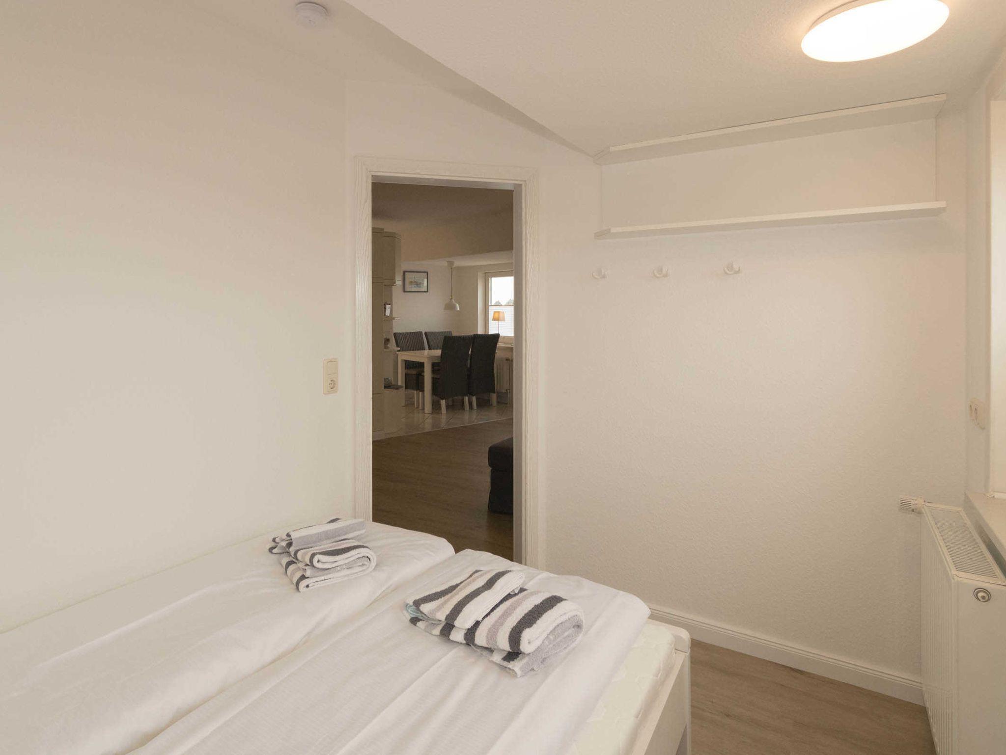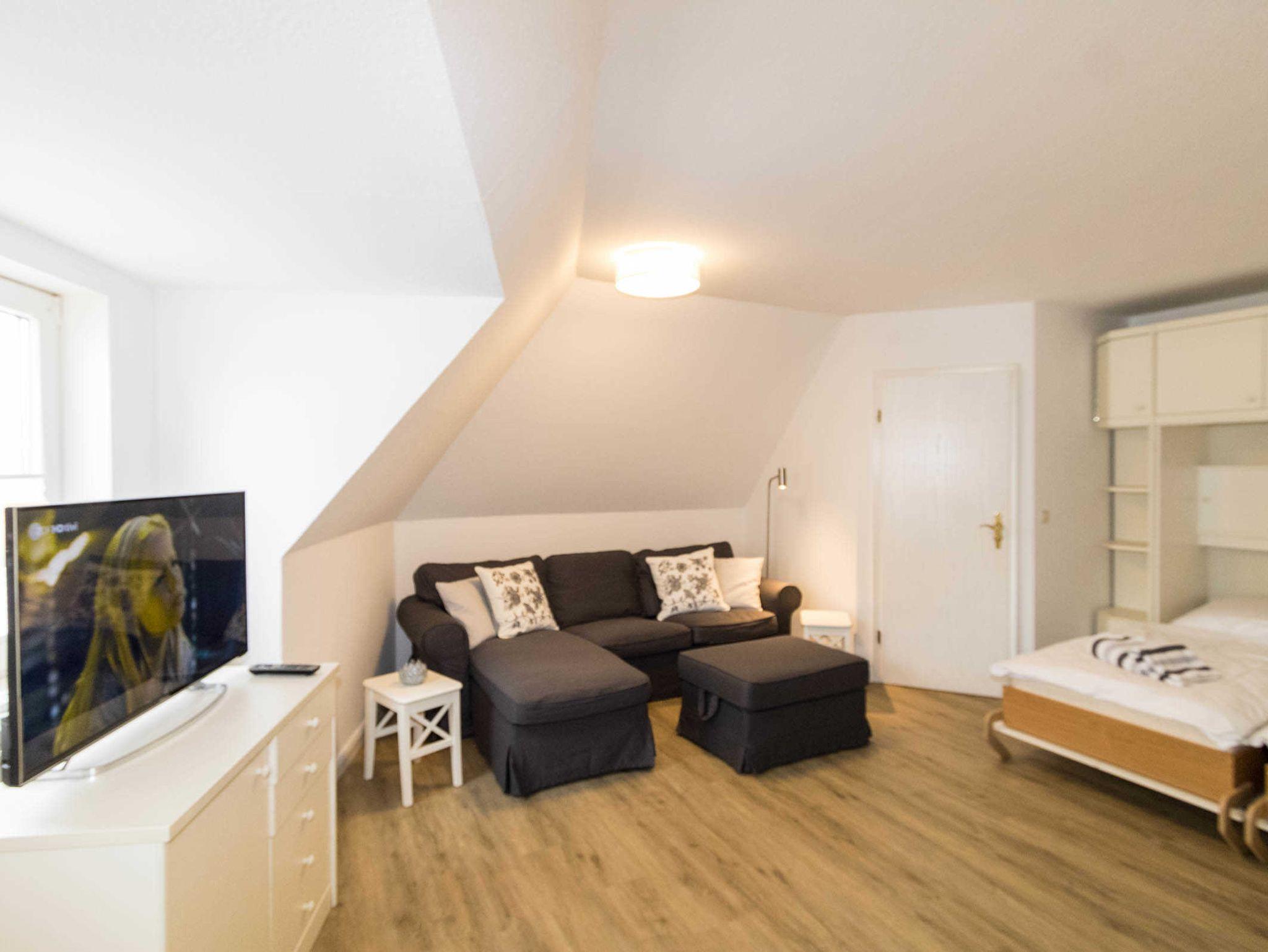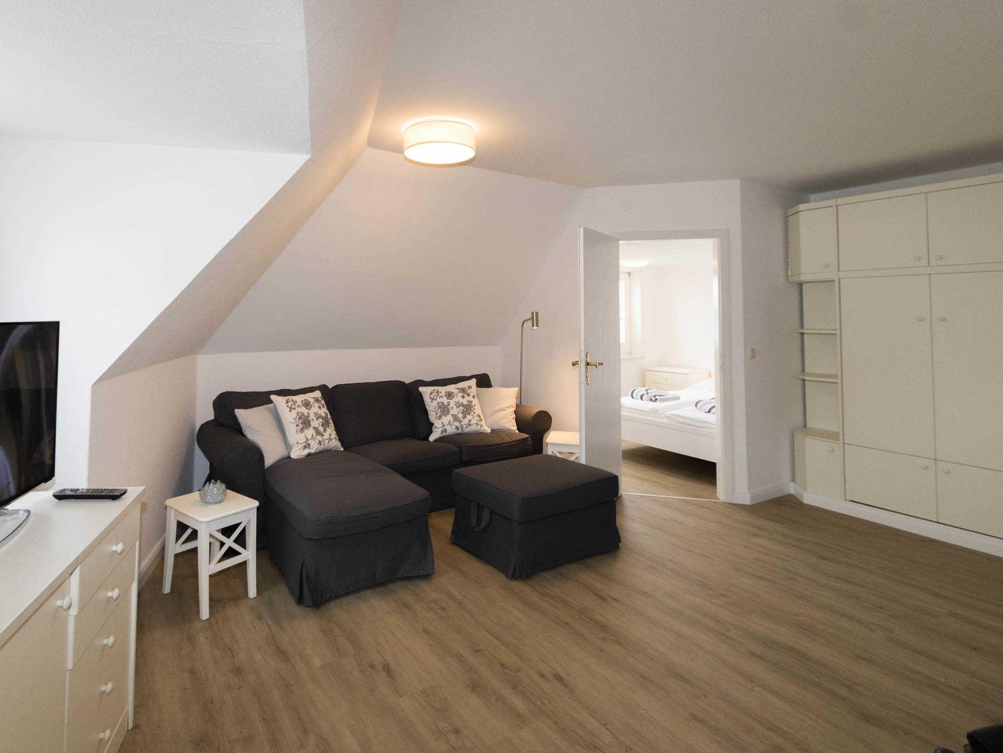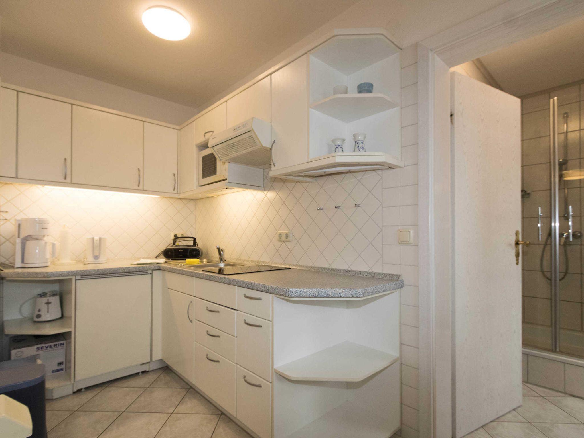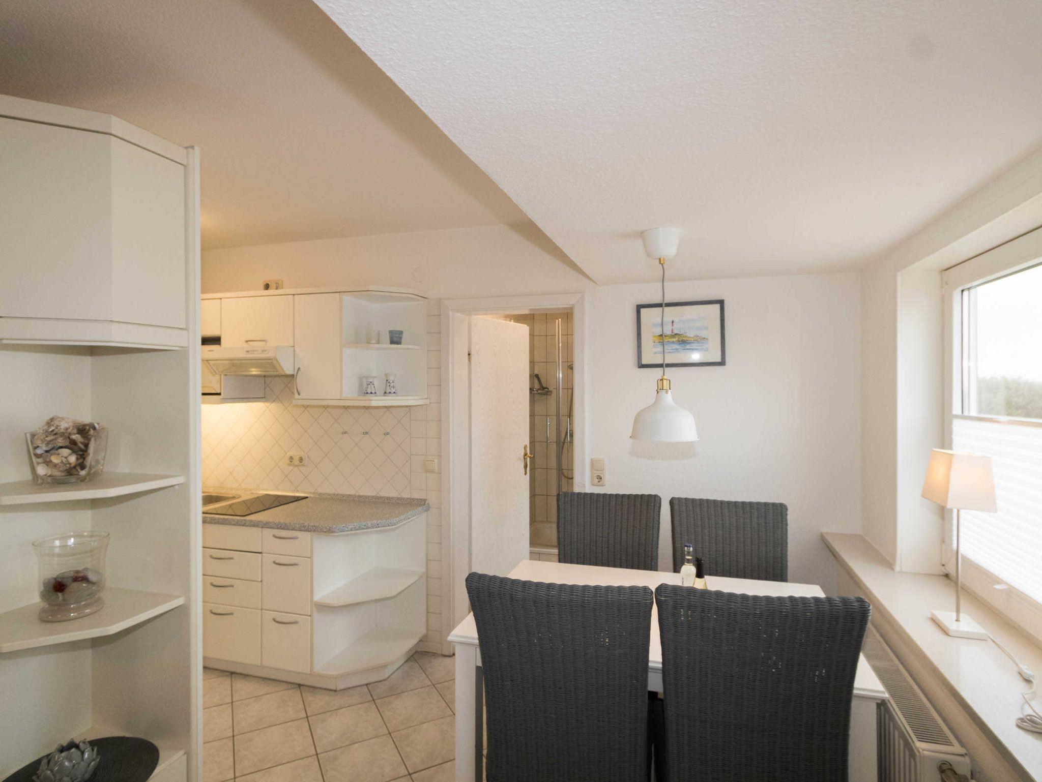 Die Wohnung 2 verfügt über einen kombinierten Wohn-Schlafraum mit einem Schrankbett. Die kleine Küchenzeile ist vom Wohnraum optisch abgetrennt und hat einen 2-Platten-Herd, Mikrowelle und Kühlschrank mit Gefrierfach. Das Schrankbett im Wohnbereich kann einzeln ausgeklappt werden. Der Esstisch ist für 4 Personen ausgerichtet. Zur Wohnung gehört noch ein weiteres kleines Zimmer mit 2 Einzelbetten, für die 3. und 4. Person.