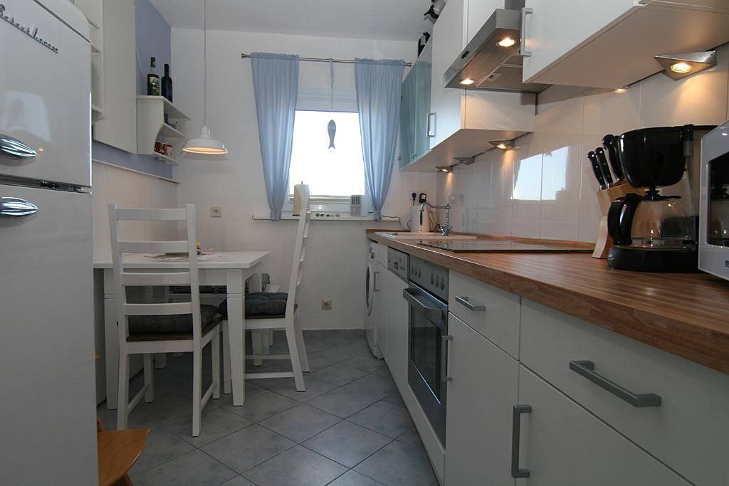 Das großzügige Wohnzimmer bietet eine gemütliche Sitzecke mit Blick auf dem Flatscreen-Fernseher sowie als zusätzliche Ausstattung einen DVD-Player. Hier befindet sich auch der Esstisch, der Platz für 4 Personen bietet. Die Wohnung verfügt über zwei Schlafzimmer, davon haben beide Schlafzimmer ein Doppelbett und Fernseher. Von dem zweiten Schlafzimmer gibt es einen Zugang zum Balkon Richtung Westen, der mit Balkonmöbeln ausgestattet ist. Die Küche ist mit einem Essplatz für 2 Personen ausgestattet und verfügt über Mikrowelle, Toaster, Kaffeemaschine, Waschmaschine, Geschirrspüler, 3-Sterne-Gefrierfach im Kühlschrank. Das moderne Duschbad rundet das Bild dieser hochwertigen Wohnung ab.