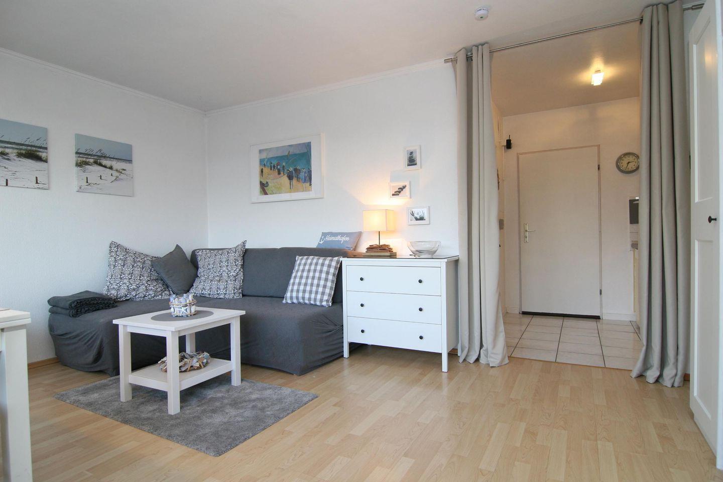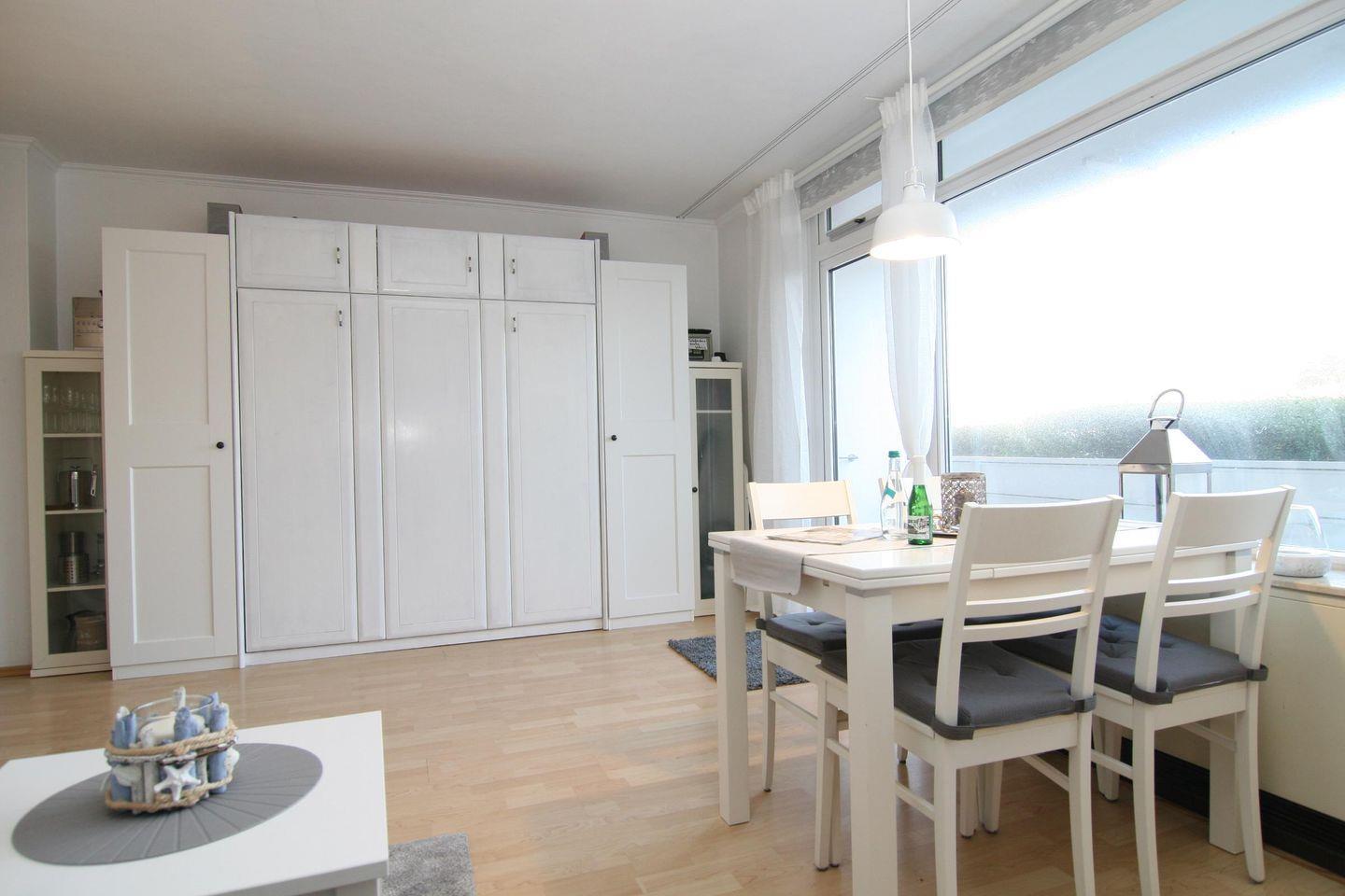 Diese Wohnung verfügt über ein großes, helles Wohnzimmer wo gleichzeitig ein Schrankbett zum Schlafen mit integriert ist. Eine großzügige Sofaecke mit angrenzendem Sitzbereich lässt keine Wünsche für einen schönen Urlaub offen. Von hier aus betreten Sie auch den Balkon, der nach Osten ausgerichtet ist. Den ganzen Morgen können Sie hier die Sonne geniessen. Eine Küchenzeile, mit sehr guter Ausstattung und das Duschbad, runden das Bild von einer modernen Ferienwohnung ab. Suchen Sie etwas Besonderes zu einem moderaten Preis, dann sind Sie hier genau richtig.
