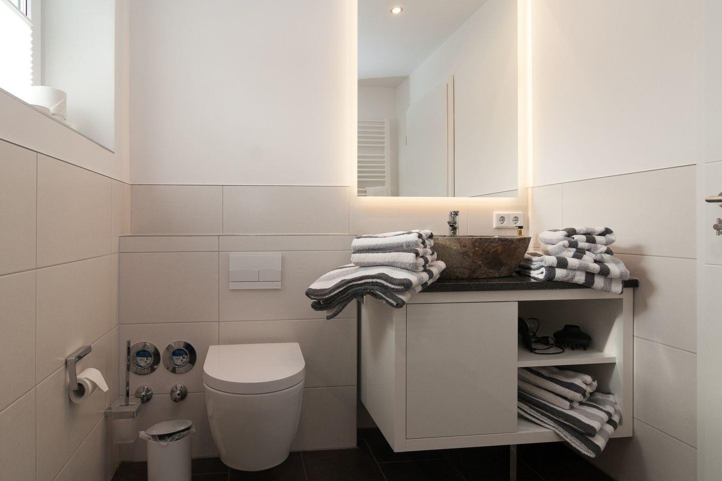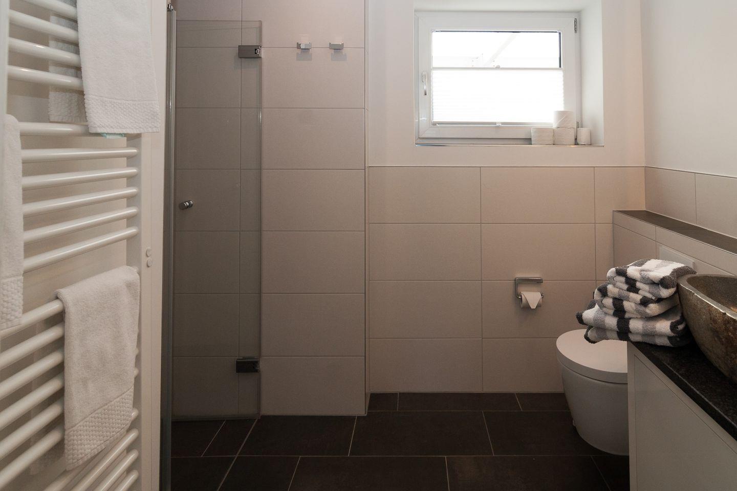 Nach Westen liegt das Schlafzimmer mit großem Doppelbett, Kleiderschrank, Kommode, TVSAT und Terrasse mit Holzboden und Gartenmöbeln, ein zweites Fenster liegt Richtung Norden. Direkt neben dem Schlafzimmer befindet sich das große, helle, hochwerig ausgestattte DuschbadWC mit großem Fenster Richtung Westen