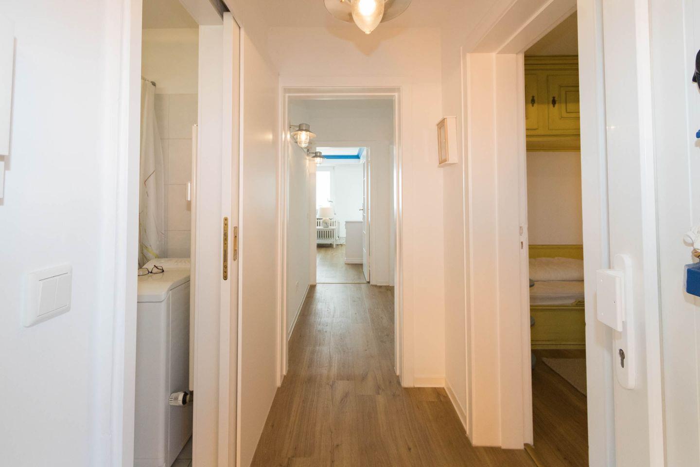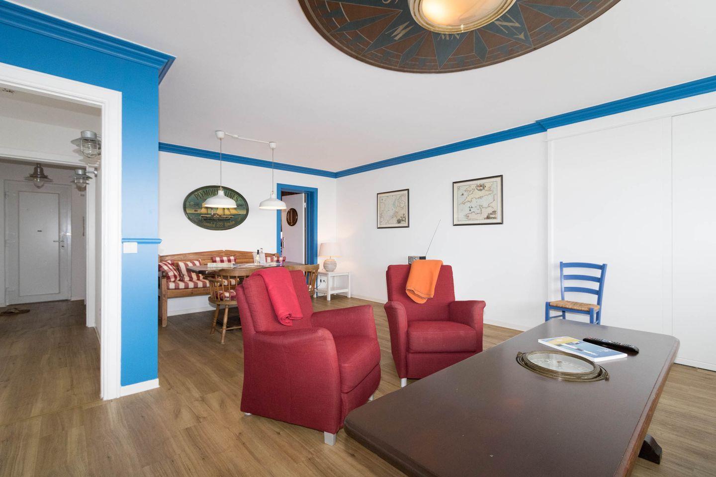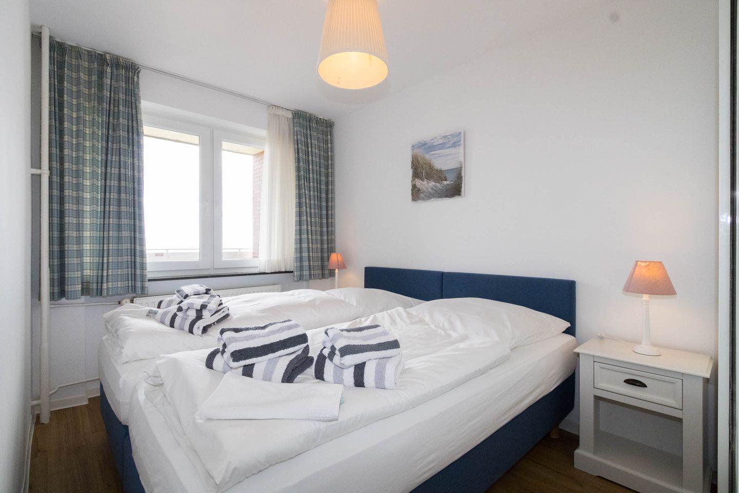 Zur Wohnung gehören zwei Schlafzimmer, eines ist mit Doppelbett und eines mit zwei einzelnen, eingebauten Kojenbetten eingerichtet. Das Duschbad verfügt über eine eigene Waschmaschine. Der Wohnraum bietet einen fantastischen Blick und hat eine Sitzecke direkt am Panoramafenster. Der Essplatz im Wohnbereich hat Platz für 6 Personen. Neben dem Flatscreen-Fernseher ist auch WLAN vorhanden. Vom Wohnbereich aus gelangen Sie auf den Ostbalkon, der mit Balkonmöbeln ausgestattet ist. Die Küche bietet alles, was man braucht, um gemütlich in der Ferienwohnung zu kochen