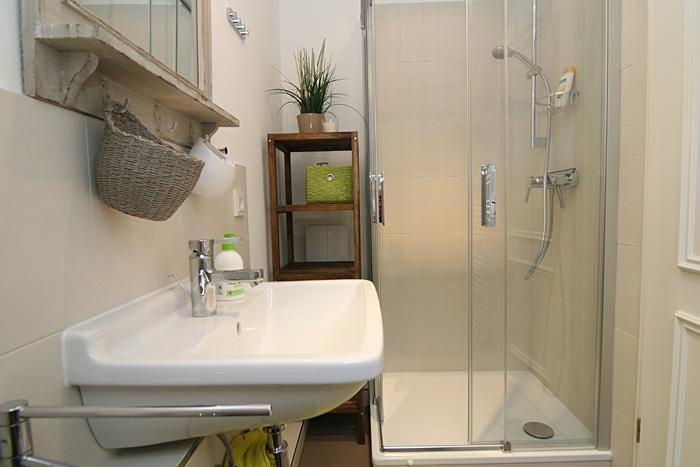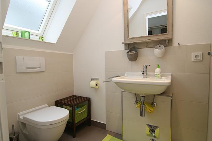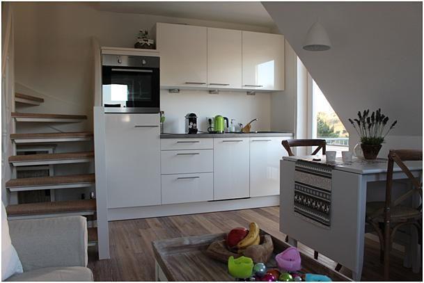 Gegenüber befindet das moderne Duschbad und geradeaus der komfortable Wohnraum mit Esstisch und Küchenzeile. Von dort geht es über die offene Treppe in das 2. Schlafzimmer unter dem Dach, mit Doppelbett, das Erwachsene wie auch Kinder lieben werden.
