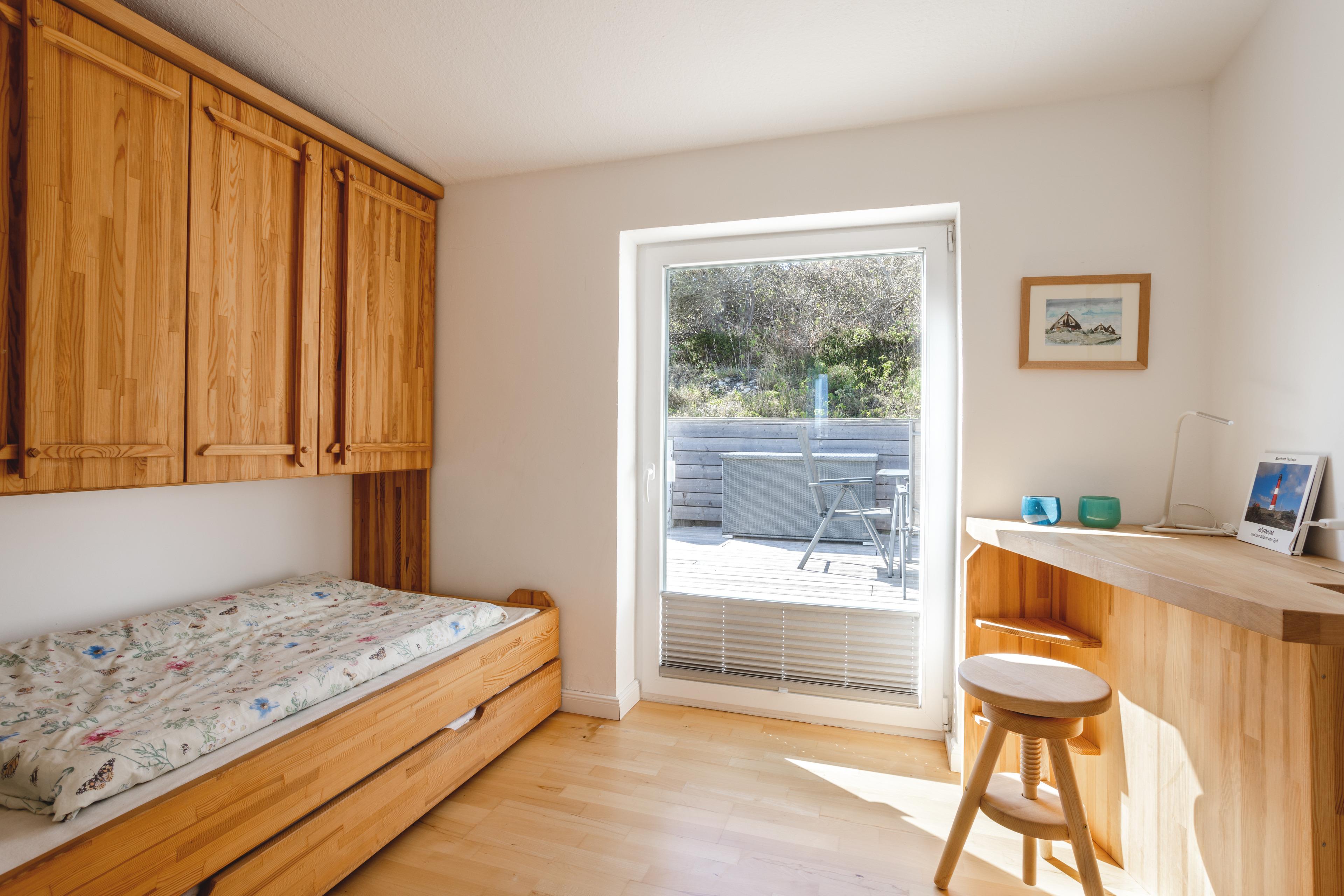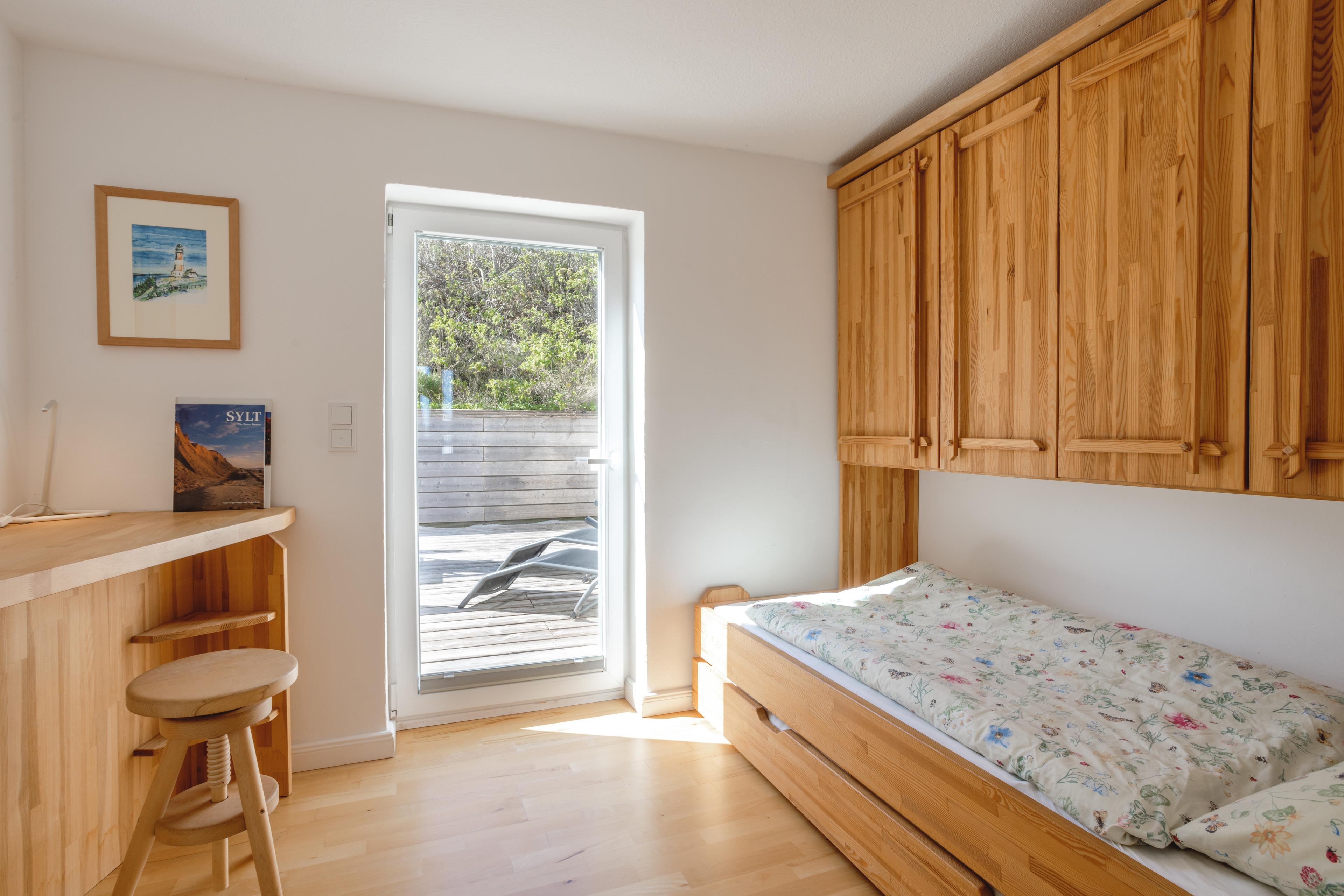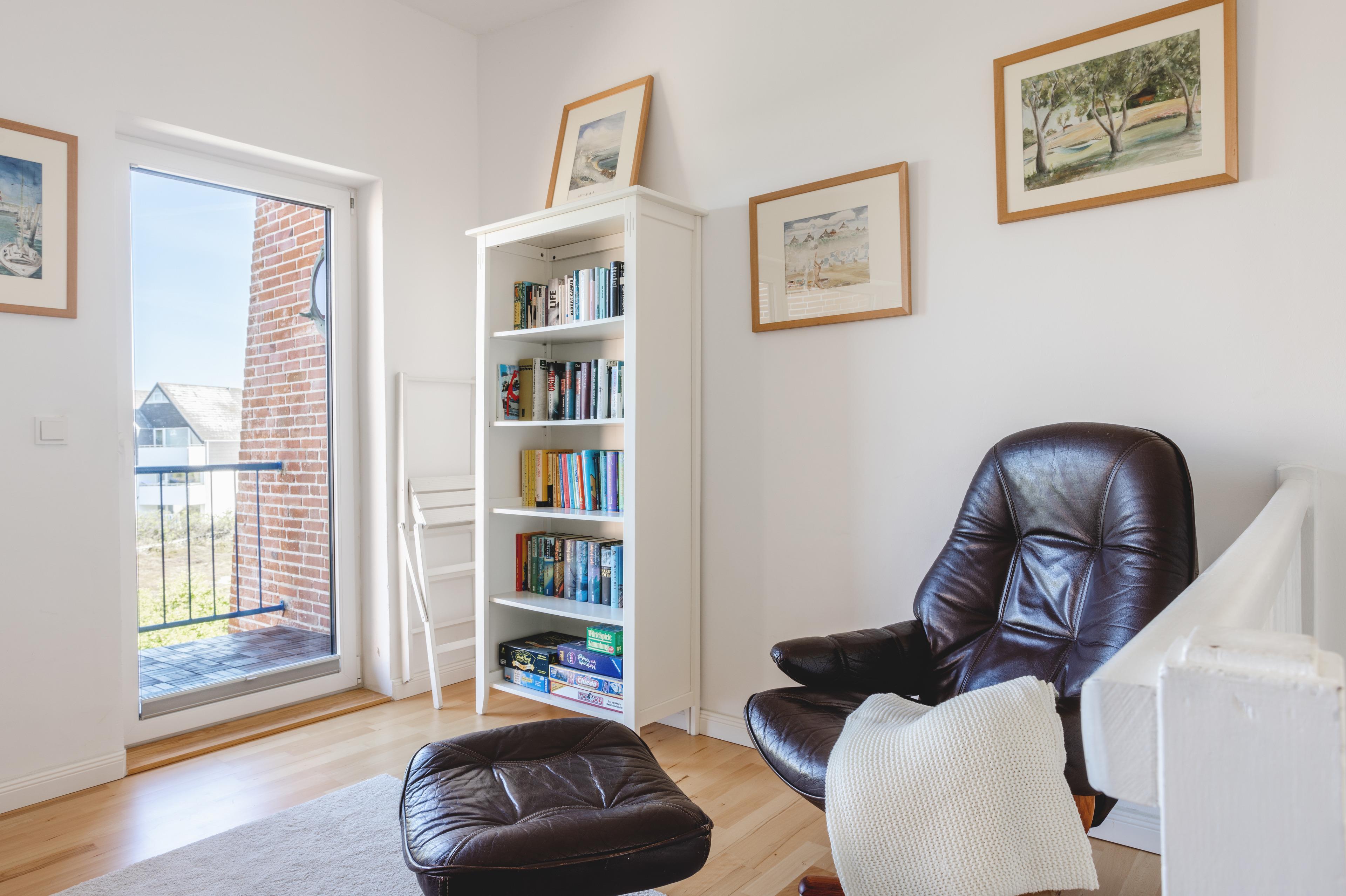 Das Haus besticht durch seine ruhige, zentrale Strandlage. Im Erdgeschoss gehen vom Flur aus ein neues, hochwertiges Duschbad mit WC und eine kleine aber vollausgestattete Küche ab. Gegenüber der Küche liegt das offene Esszimmer, hier können bis zu 6 Personen am großen Esstisch zusammensitzen. Über die Treppe gelangen Sie ins lichtdurchflutete Obergeschoss. Dort erwartet Sie eine bequeme Sitzgruppe, die sich zu einem vollwertigen Doppelbett ausklappen lässt. In der großen Bücherwand finden Sie persönlich ausgesuchte Literatur, oftmals mit Sylt-Bezug. Auch für Kinder haben wir von Harry Potter bis Astrid Lindgren eine reiche Auswahl an Büchern. Nicht nur für Regentage bieten wir außerdem eine kleine Auswahl an Gesellschaftsspielen und einen 65 Zoll Flachbildfernseher. Der 11qm große, überdachte Balkon bietet die Möglichkeit, auch bei schlechtem Wetter draußen sitzen zu können. Wlan und Festnetztelefon sind selbstverständlich vorhanden. Vom Wohn-/Schlafraum gehen noch zwei weitere kleine Schlafräume mit jeweils einem Bett ab, bei Bedarf kann noch ein Kinderbett pro Zimmer ausgezogen werden. Von den Schlafzimmern aus haben Sie Zugang zu der windgeschützten 40qm Südterrasse, die selbst bei strammeren Westwinden zum Sonnenbaden einlädt.