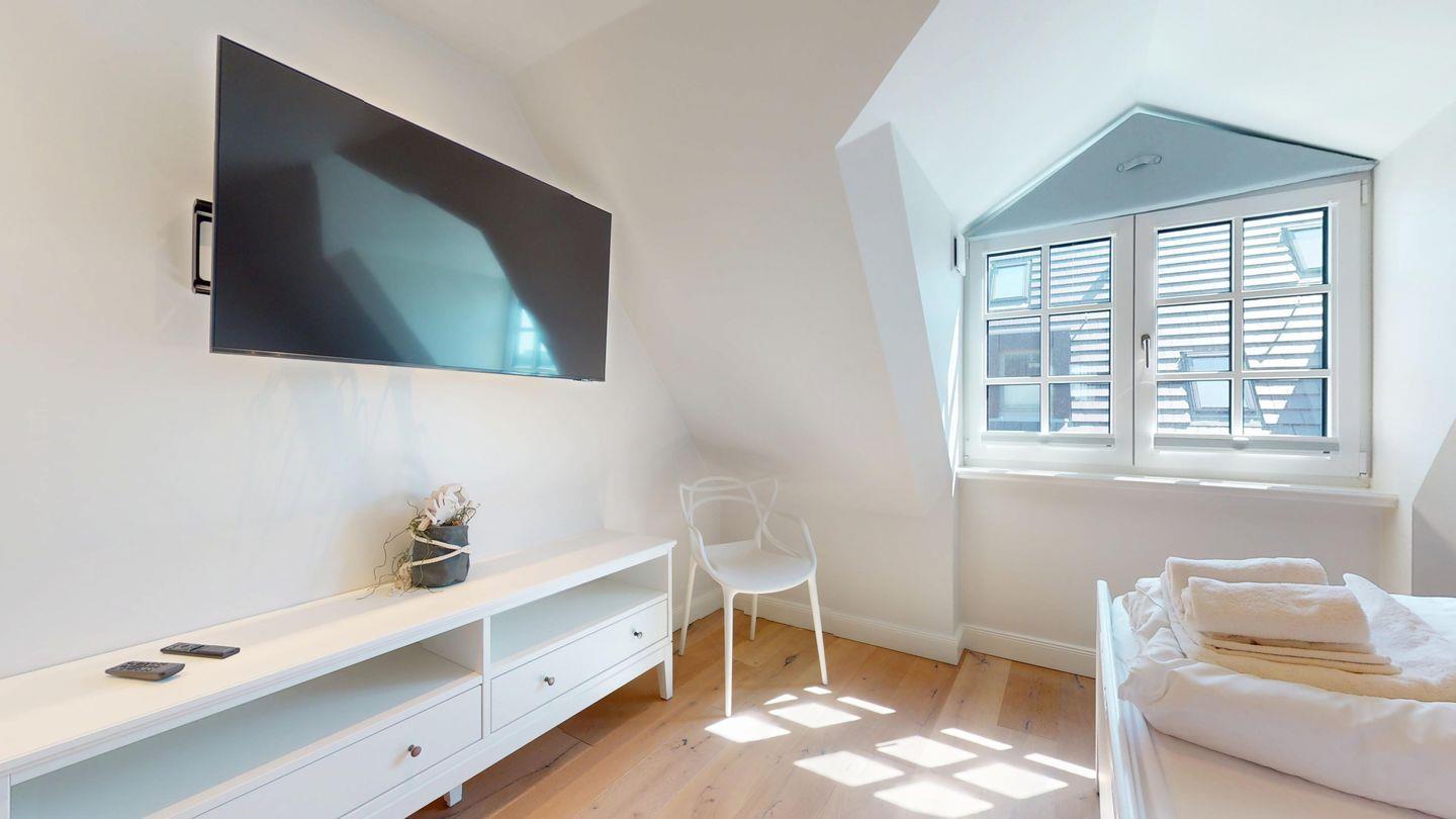 Im Untergeschoss erwartet Sie ein Schlafzimmer mit Doppelbett und Flatscreen-TV sowie Ihre private Sauna und ein modernes Duschbad. Im Obergeschoss befindet sich ein weiteres Doppelzimmer mit Flatscreen-TV und ein stilvolles Badezimmer mit freistehender Badewanne, Dusche und WC. Das Dachgeschoss bietet eine liebevoll gestaltete Nische mit kleinem Doppelbett, Flatscreen-TV und Schreibtisch – ein gemütlicher Rückzugsort für Kinder oder Gäste.