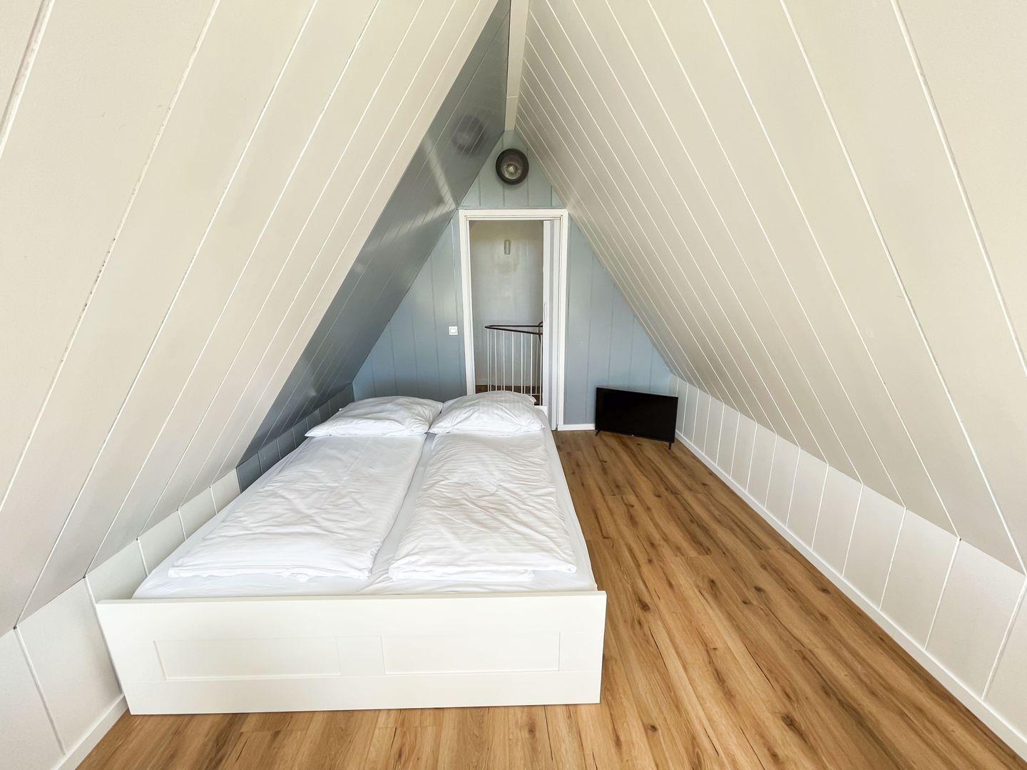 Über eine Wendeltreppe gelangen Sie in den offenen Schlafbereich unter dem Dach. Dort genießen Sie nicht nur ein bequemes Doppelbett und einen weiteren Fernseher, sondern auch einen wunderbaren Blick auf den Budersand-Golfplatz und die umgebende Natur.