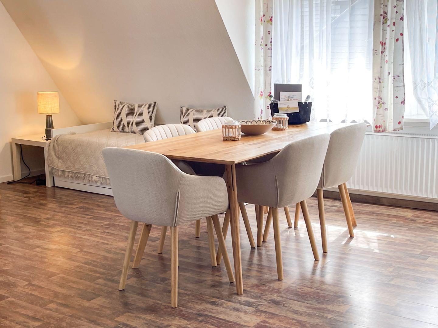 Die Wohnung ist schlicht, aber funktional eingerichtet – perfekt für Gäste, die Natur, Ruhe und Ursprünglichkeit schätzen. Im unteren Bereich erwartet Sie ein heller Wohnraum mit gemütlicher Sofaecke und Fernseher – ideal zum Entspannen nach einem Tag am Meer. Der angrenzende Essbereich lädt zu gemeinsamen Mahlzeiten oder geselligen Spieleabenden ein.