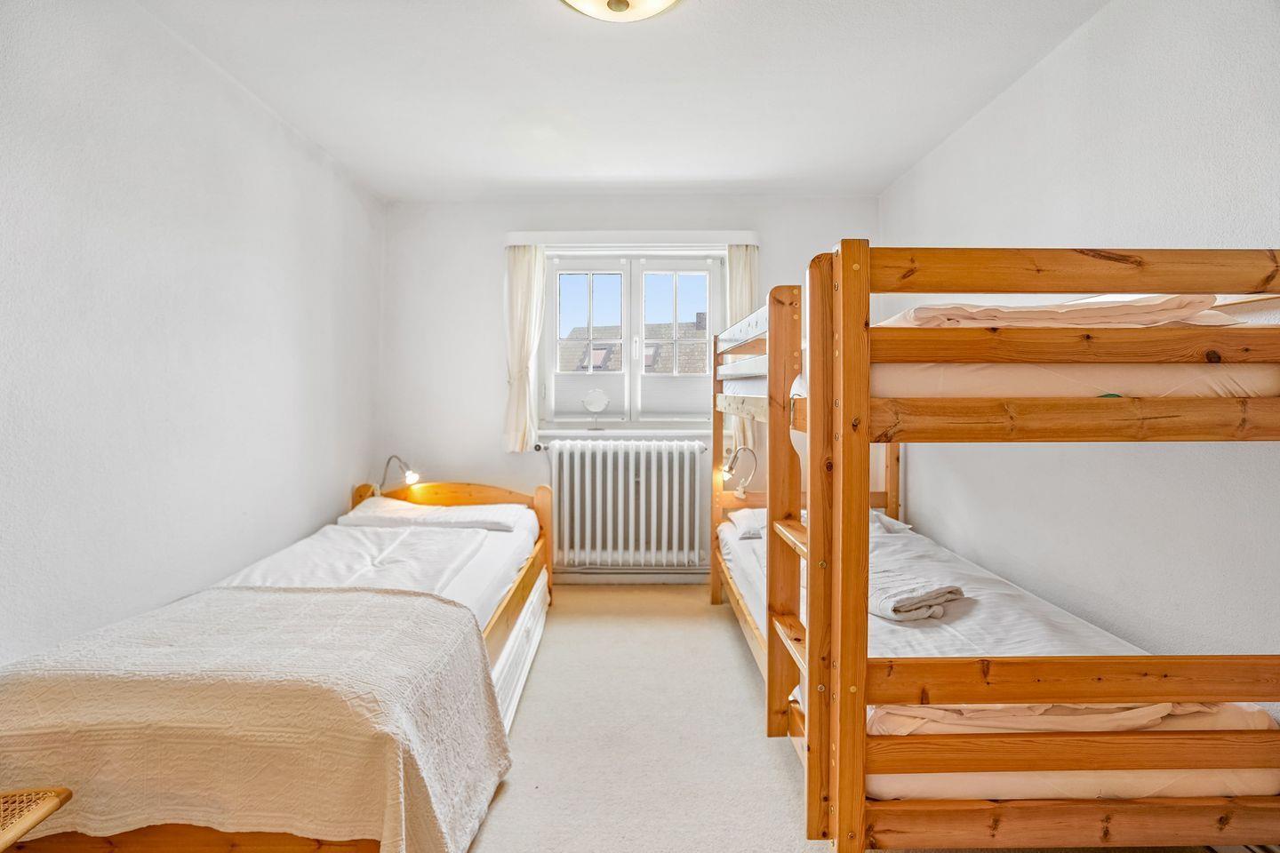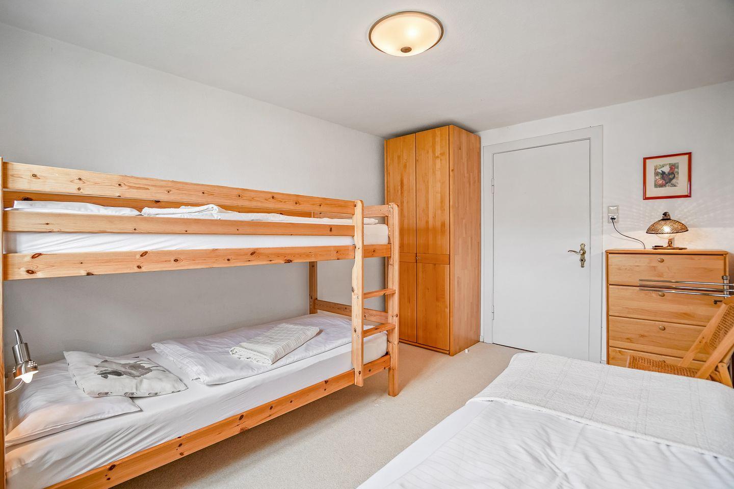 Im Obergeschoss befinden sich drei weitere Schlafzimmer: ein kleines Zimmer mit Einzelbett, ein größeres Zimmer mit Doppelstockbett und einem zusätzlichen Einzelbett sowie das Hauptschlafzimmer mit Doppelbett. Zudem gibt es hier ein weiteres Badezimmer mit Dusche.