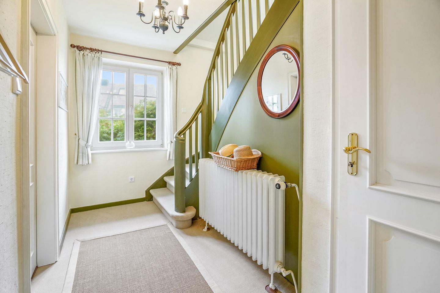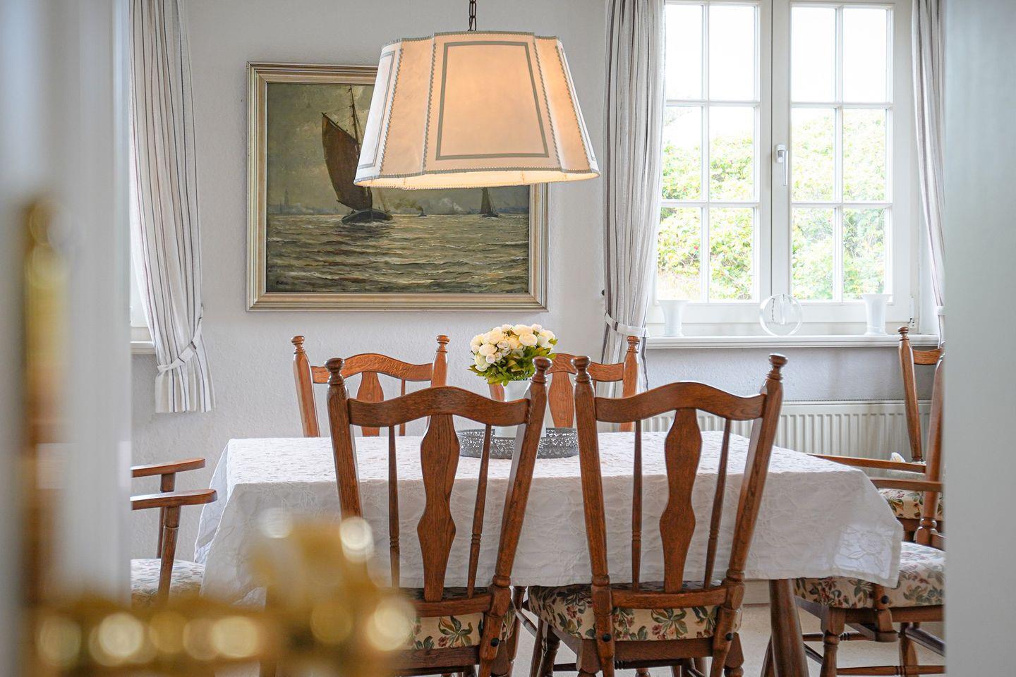 Im Erdgeschoss erwarten Sie ein Wohnzimmer mit Kamin, ein separates Esszimmer, eine gut ausgestattete Küche, zwei Schlafzimmer, ein Badezimmer mit Dusche sowie ein separates WC. Besonders schön ist der helle Wintergarten, von dem Sie direkt auf die Terrasse gelangen – ausgestattet mit zwei Strandkörben, perfekt zum Entspannen.