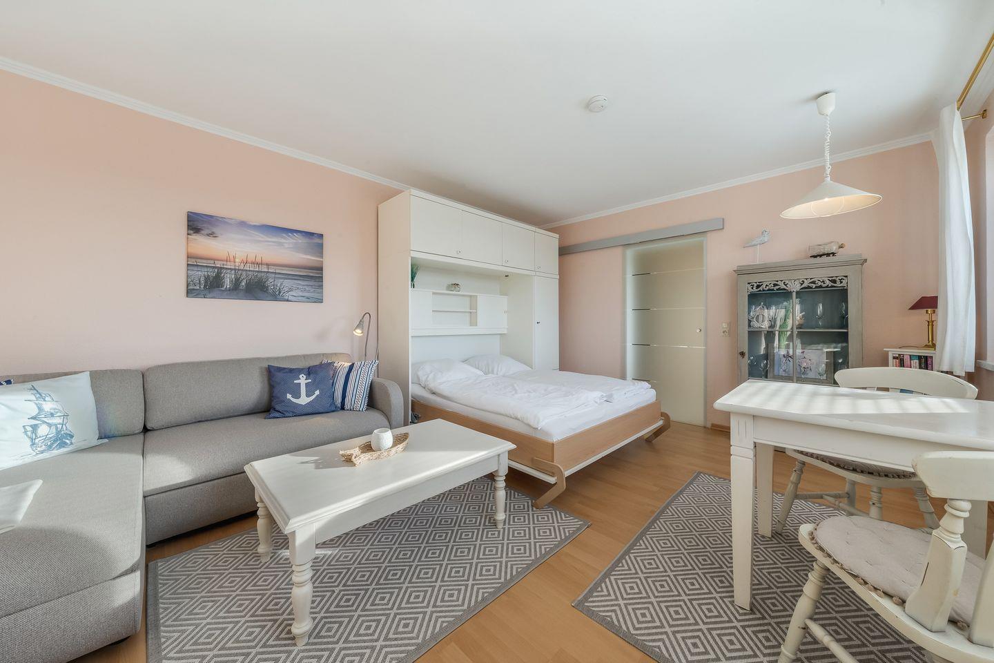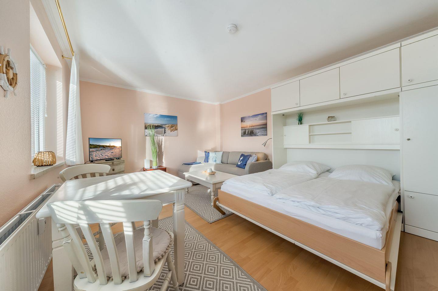 Gemütliches 1-Zimmer-Apartment in Hörnum auf Sylt, hell und freundlich eingerichtet, ideal für kleine Budgets mit gutem Komfort. Mit Schrankbett, Couchecke mit Smart-TV, Esstisch, separater Küche, Dusche/WC, WLAN und kostenfreiem PKW-Stellplatz. Strandnah, Bushaltestelle in der Nähe. Waschmaschine zur Gemeinschaftsnutzung.