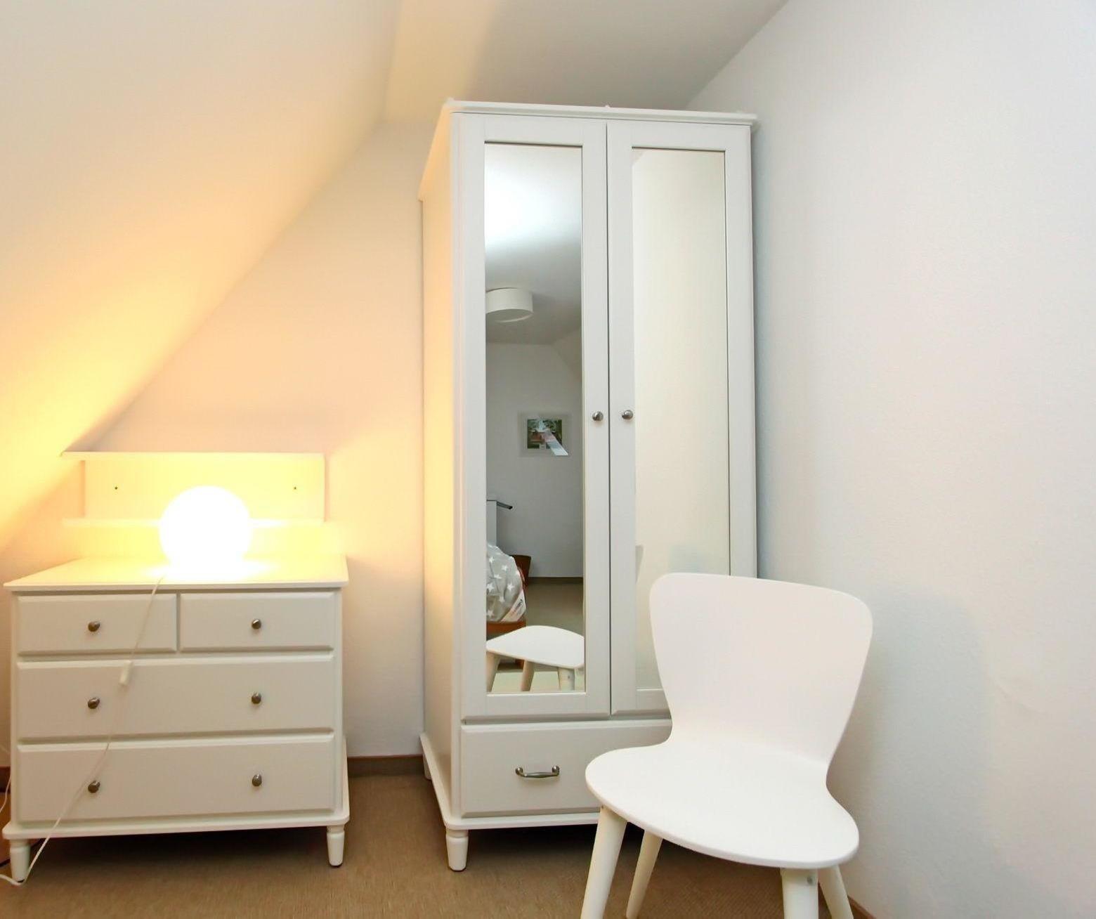 Kleiderschrank bietet ausreichend Fläche; über eine Holzwendeltreppe geht es ins DG: dort