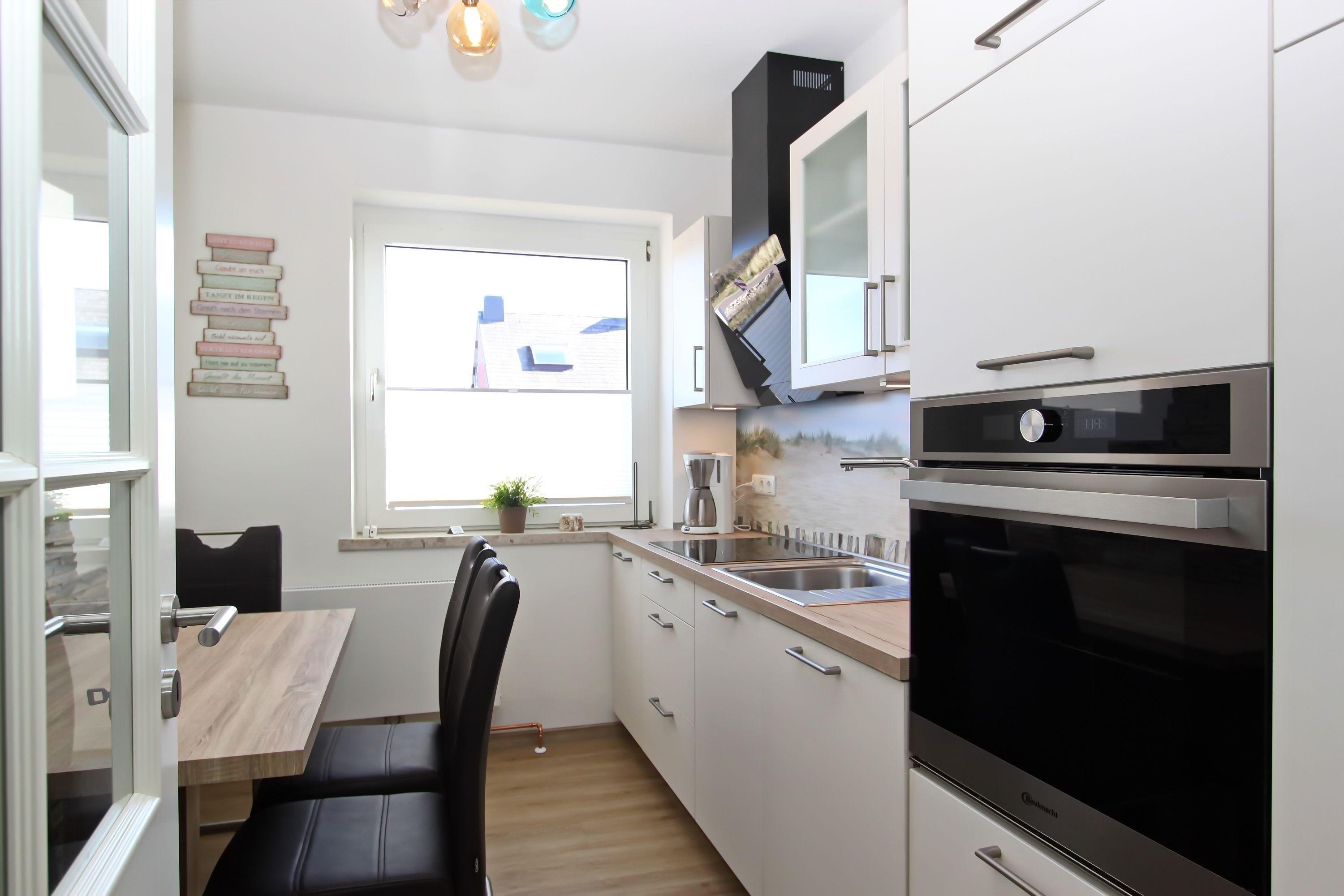 Die neu gestaltete Küche bietet Platz für einen Esstisch und eine moderne, sehr gut ausgestattete Küchenzeile. Neben einem Ceranfeld finden Sie hier auch einen Backofen, eine Mikrowelle und einen Geschirrspüler. Auch Küchenutensilien stehen in ausreichender Anzahl zur Verfügung.
