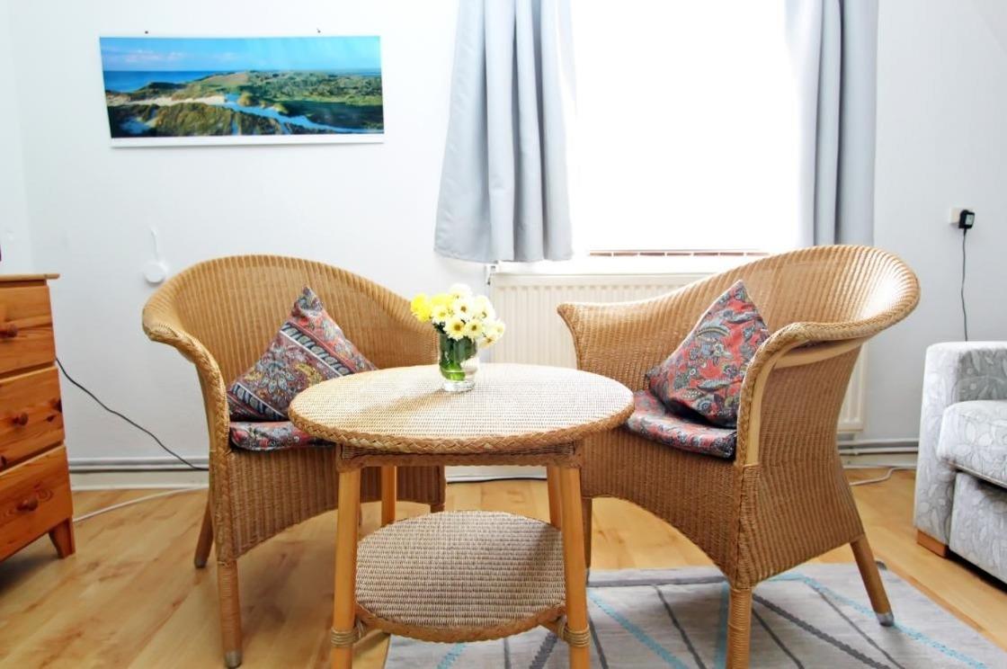 Die Wohnung ist ausgestattet mit einer Kochnische und einem kleinen Duschbad. Der Blick aus den Fenstern geht nach Osten auf die Dünenkette auf der Wattseite der Insel. Farb TB-Sat und Mikrowelle; eine Waschmaschine und ein Wäschetrockner steht den Gästen im Keller des Hauses gegen eine Gebühr zur Verfügung. Änderungen der Ausstattung bleibt vorbehalten.