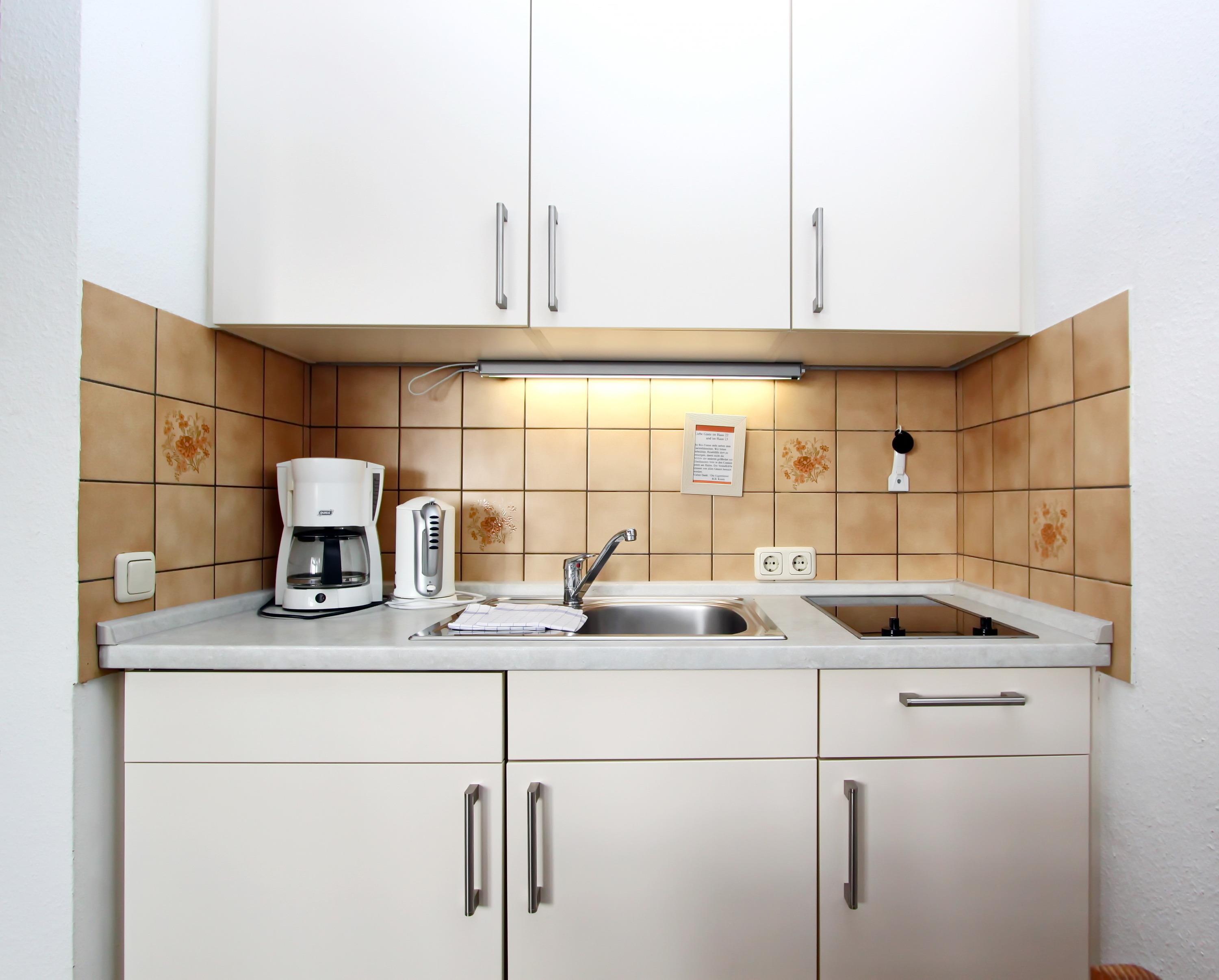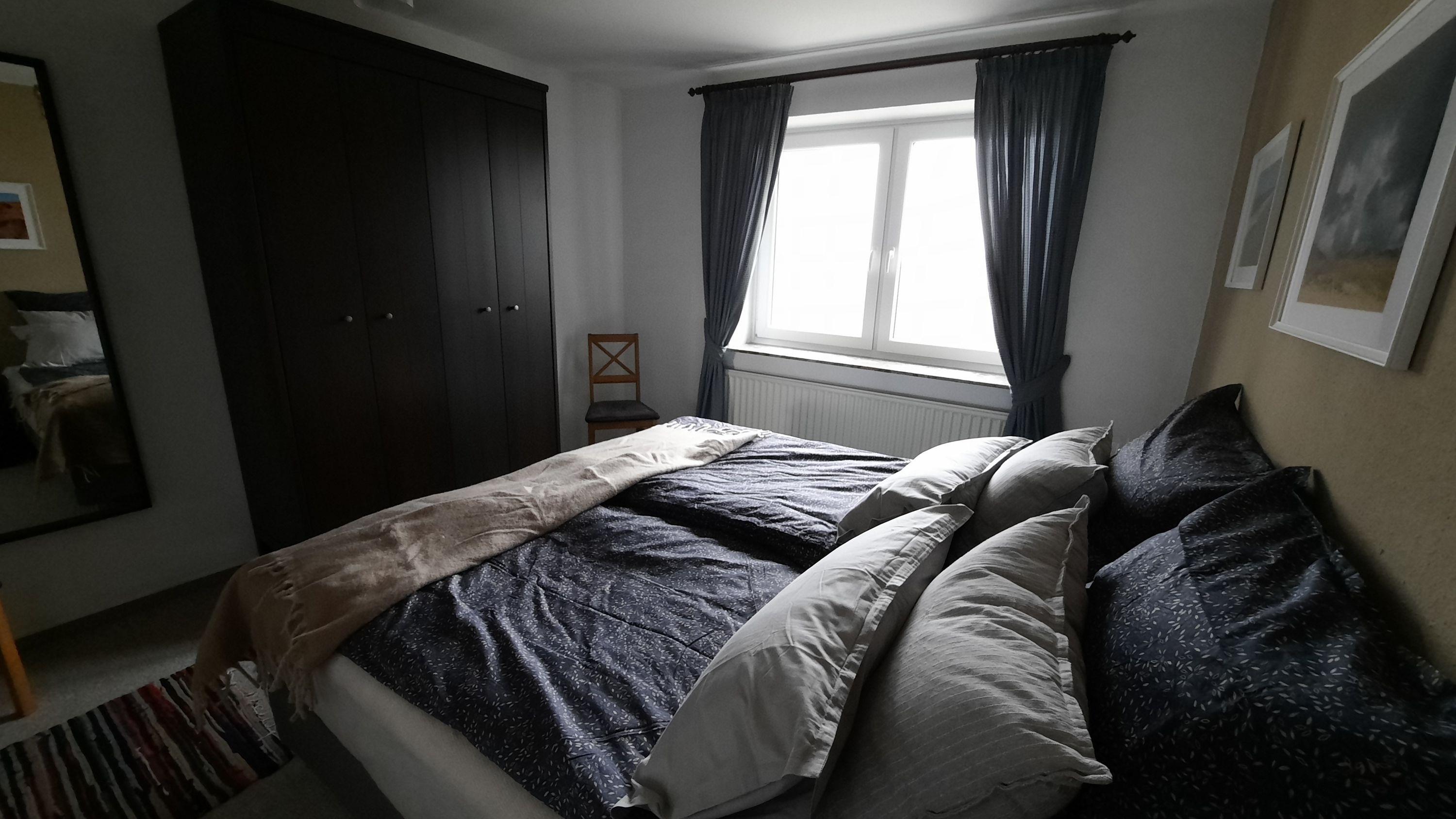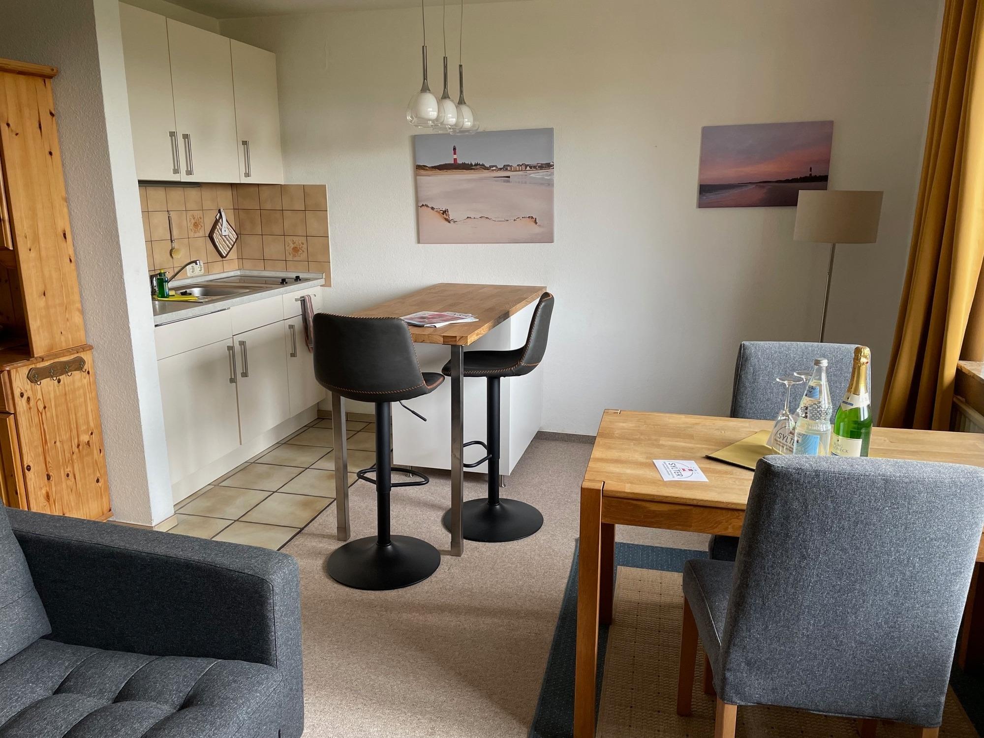 Diese kleine Ferienwohnung für zwei Personen im Haus Meerblick hat zwei getrennte Zimmer, davon ein neues Schlafzimmer mit Boxspringbett, und ein Wohnzimmer mit Küchenzeile.