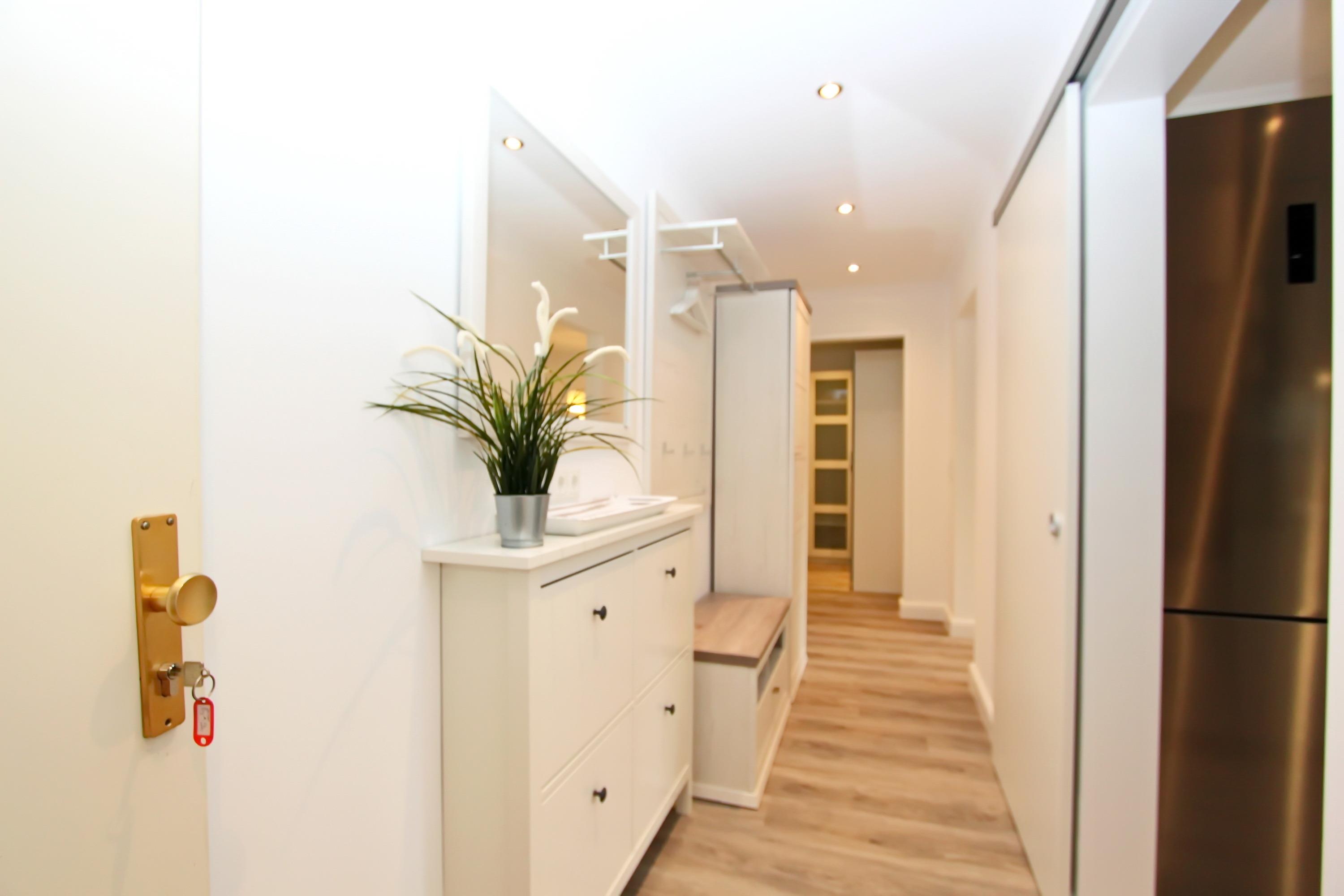 Flur mit Garderoben- u. Schuhschrank. Separate Einbauküche mit Induktionsherd, hoher Backofen, Mikrowelle, Geschirrspüler, Kühl- und Gefrierschrank sowie ein Esstisch mit 4 Stühlen. Duschbad/WC mit Regendusche und Handtuchheizung.
