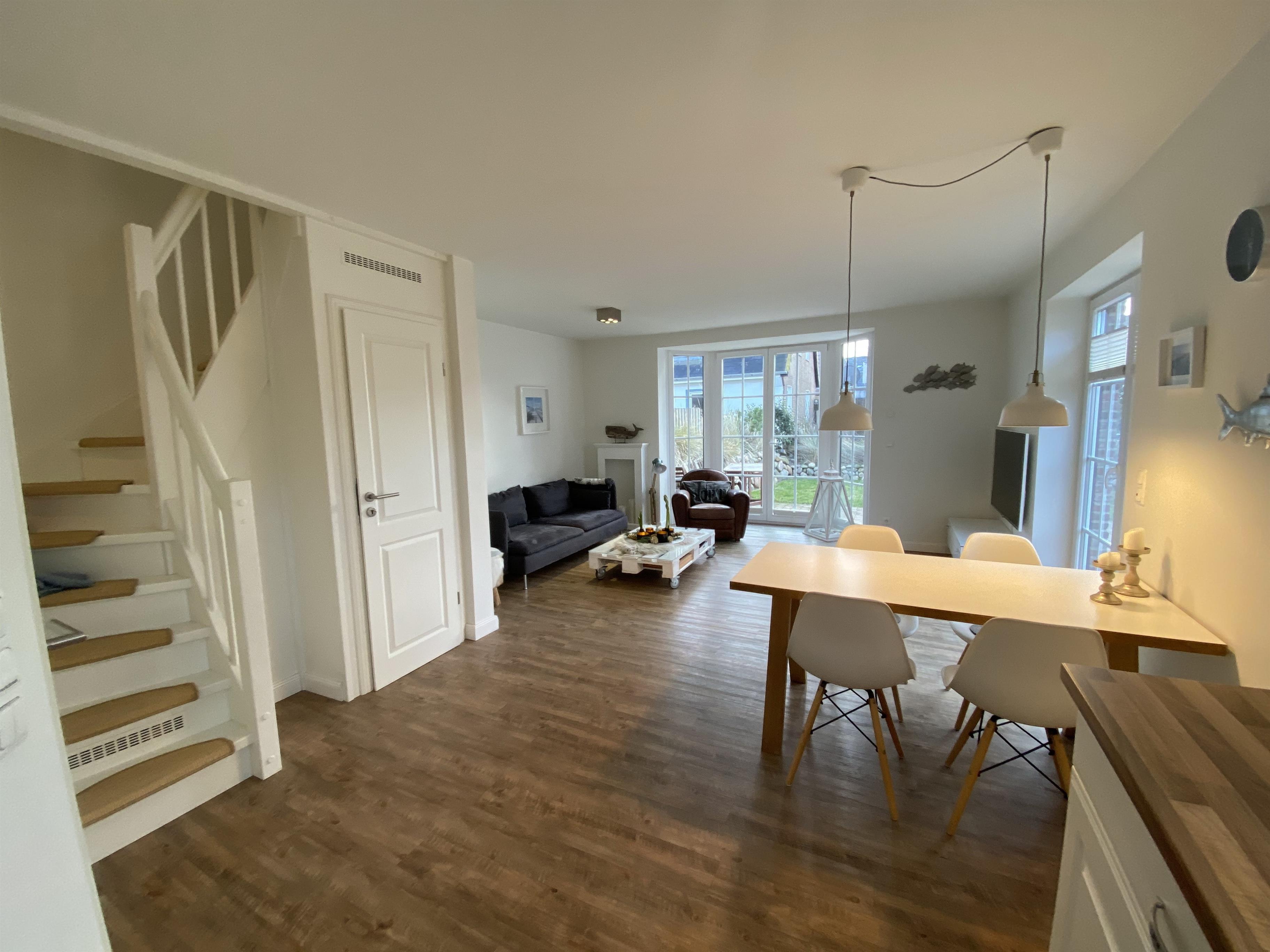 Das Endhausteil hat eine Größe von ca. 84 m² und bietet Platz für bis zu 6 Personen. Im EG befindet sich ein großer Wohnraum mit offener Einbauküche und Essplatz. Die gemütliche Couch und Ledersessel lädt zum Verweilen ein. In der Einbauküche befindet sich ein Backofen, Geschirrspüler, Kühlschrank mit Gefrierfach, Cerankochfeld, etc. Vom Wohnraum können Sie auf die Süd-/Westterrasse) gehen. Dort sind Terrassenmöbel und auch ein Strandkorb in dem Sie die Sonnenstunden genießen können. Eine Abseite unter der Treppe bietet ausreichend Stauraum für Ihr Gepäck. Im oberen Hausteil befinden sich drei Schlafräume. Ein Schlafzimmer mit einem Doppelbett (180 x 200 cm), eines mit einem französischen Doppelbett (140 x 200 cm) und ein weiterer Schlafraum mit einem französischen Doppelbett (160 x 200 cm) sowie Einbauschränke die ausreichend Platz bieten. Duschbad/WC. Alle Schlafräume haben einen TV-Anschluss. Im EG befindet sich noch ein Gäste-WC. Ein PKW-Stellplatz befindet sich direkt vor dem Haus. Die Tierhaltung ist gestattet! Nichtraucher Haus auf Sylt
