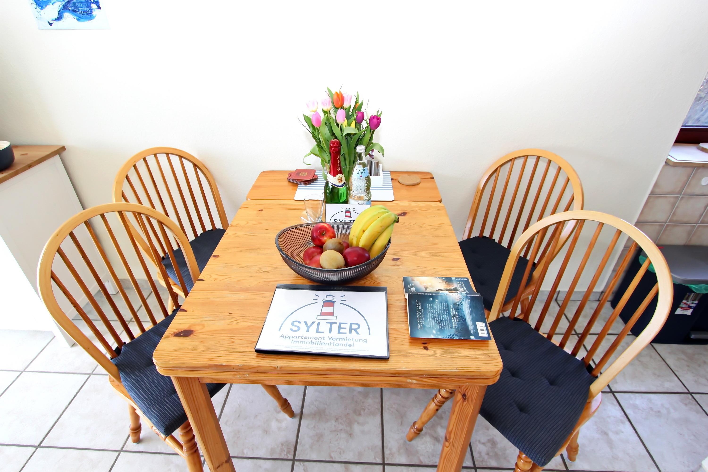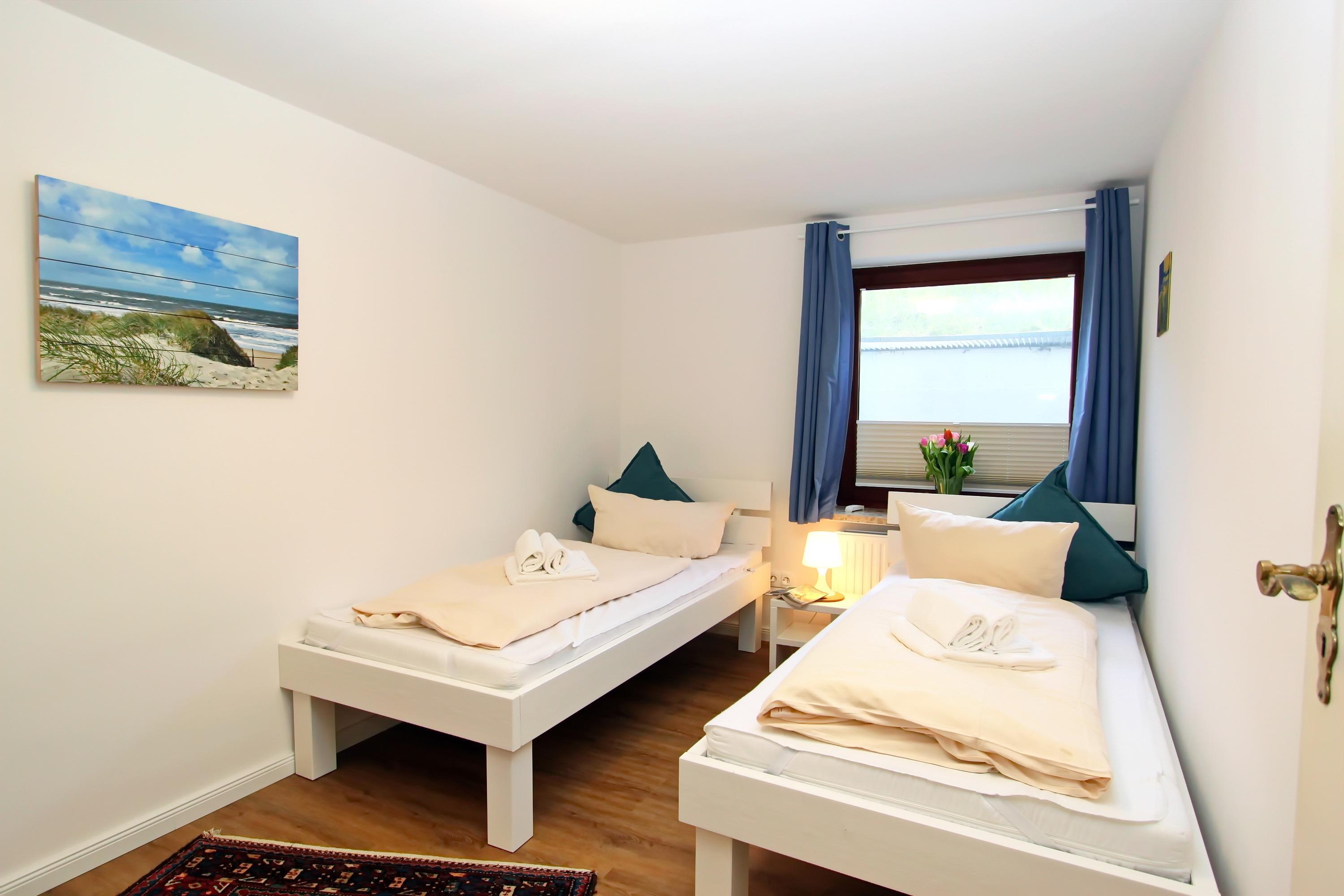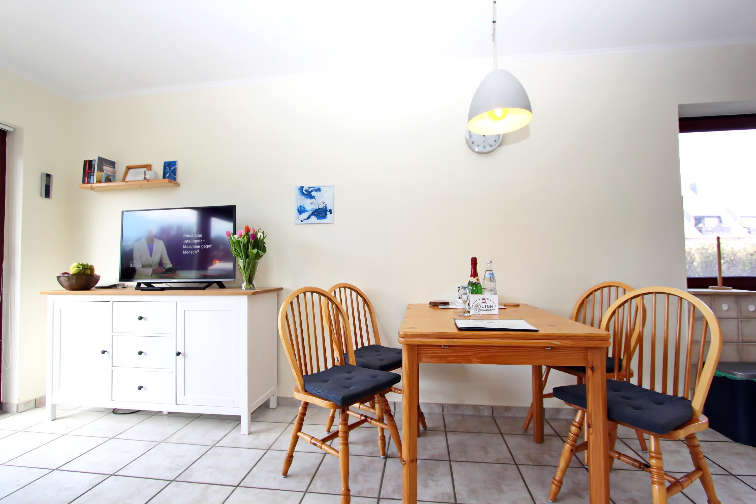 Teilrenovierung Ende 2022 (Änderungen der Ausstattung vorbehalten)!!! ganz ruhig gelegenes, modernes 3 Zimmer Appartement für bis zu 6 Personen im Herzen von Hörnum über EG/UG mit ca. 60m², Geschäfte des täglichen Bedarfs sind in unmittelbarer Nähe; Im EG befindet sich ein Wohnraum mit einem gemütlichen Ecksofa (mit Schlaffunktion) und einem Sessel sowie einem Couchtisch, Zugang zur Süd-/Westterrasse mit Blick ins Grüne und Terrassenmöbeln, CD-Player mit Webradio, DVD-Player, Brettspiele, Karten sowie ein Bügelbrett und -eisen sind ebenfalls vorhanden, Schrank, Smart-TV, Esstisch für 4-6 Personen, kleine offene Küche mit Ceranherd, Mikrowelle, Geschirrspüler, Kühlschrank mit Gefrierfach; ein separater Schlafraum mit Doppelbett und ausreichend Schrankfläche, Flur mit Garderobe. Über eine Holztreppe gelangt man ins UG. Dort befindet sich ein weiterer separater Schlafraum mit zwei Einzelbetten, Schrank, Tisch und zwei Stühlen; Duschbad/WC mit Fußbodenheizung. Im Nachbarhaus befindet sich der Wellnessbereich mit kostenlosem Schwimmbad (4m x 8m) und einer Münzsauna. Nichtraucher! Die Tierhaltung ist nicht gestattet! Ein separater Kfz-Stellplatz gehört ebenfalls dazu. Waschraum mit Münzwaschmaschine und -trockner befindet sich im Keller.