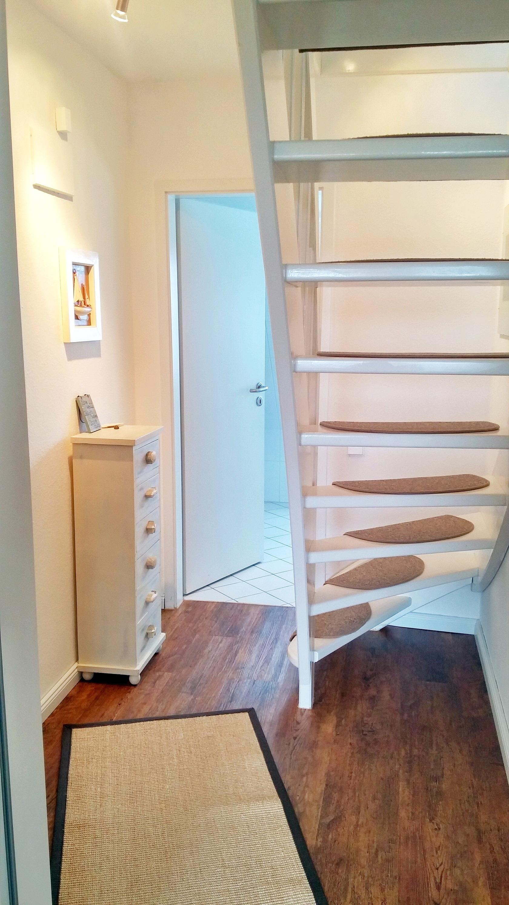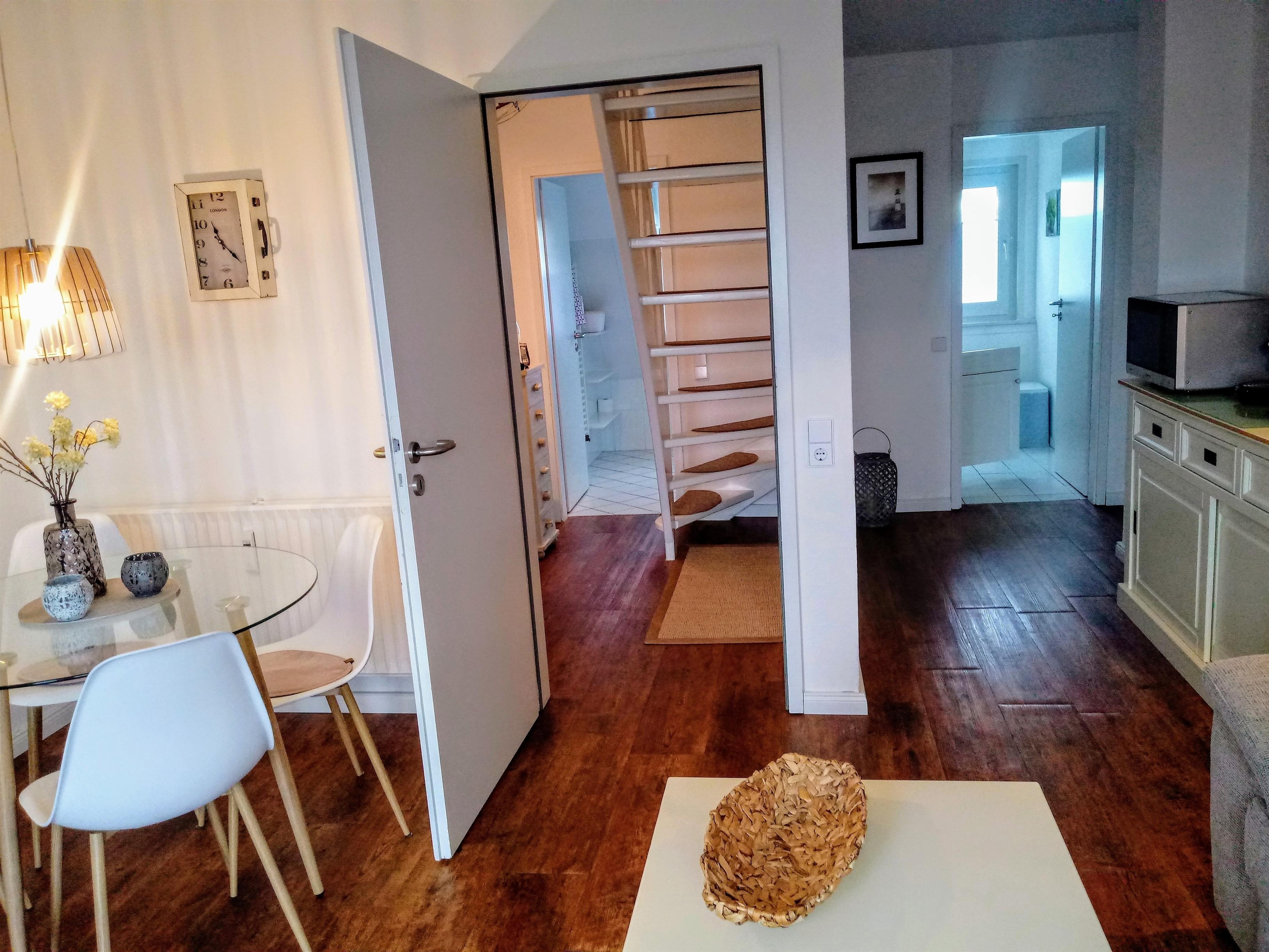 modernes 2 Zimmer Appartement mit ca. 48 m² über OG/DG in Hörnum-Nord; Im OG befindet sich ein Wohnraum mit einem Ecksofa, Tisch, Internet-Radio incl. CD-Funktion, Smart-TV, Glas-Esstisch mit 4 Stühlen im skandinavischen Design, Sideboard mit Mikrowelle, einer Nespresso-Kapselmaschine und Senseo Kaffeepadmaschine, Zugang zum Südbalkon mit Balkonmöbel von dem aus Sie einen fantastischen Blick Richtung Golfplatz und Leuchtturm haben. Separate Küche mit 2 Plattenherd, Kühlschrank sowie einen Eierkocher. Duschbad/WC mit Schminkspiegel. Flur mit Garderobe über den eine Wendeltreppe ins DG führt. Dort befindet sich ein Schlafraum mit Doppelbett (zwei einzelne Matratzen), Nachttisch, Sideboard mit kleinem TV und ein Kleiderschrank. Kostenloser Internetzugang via WLAN.