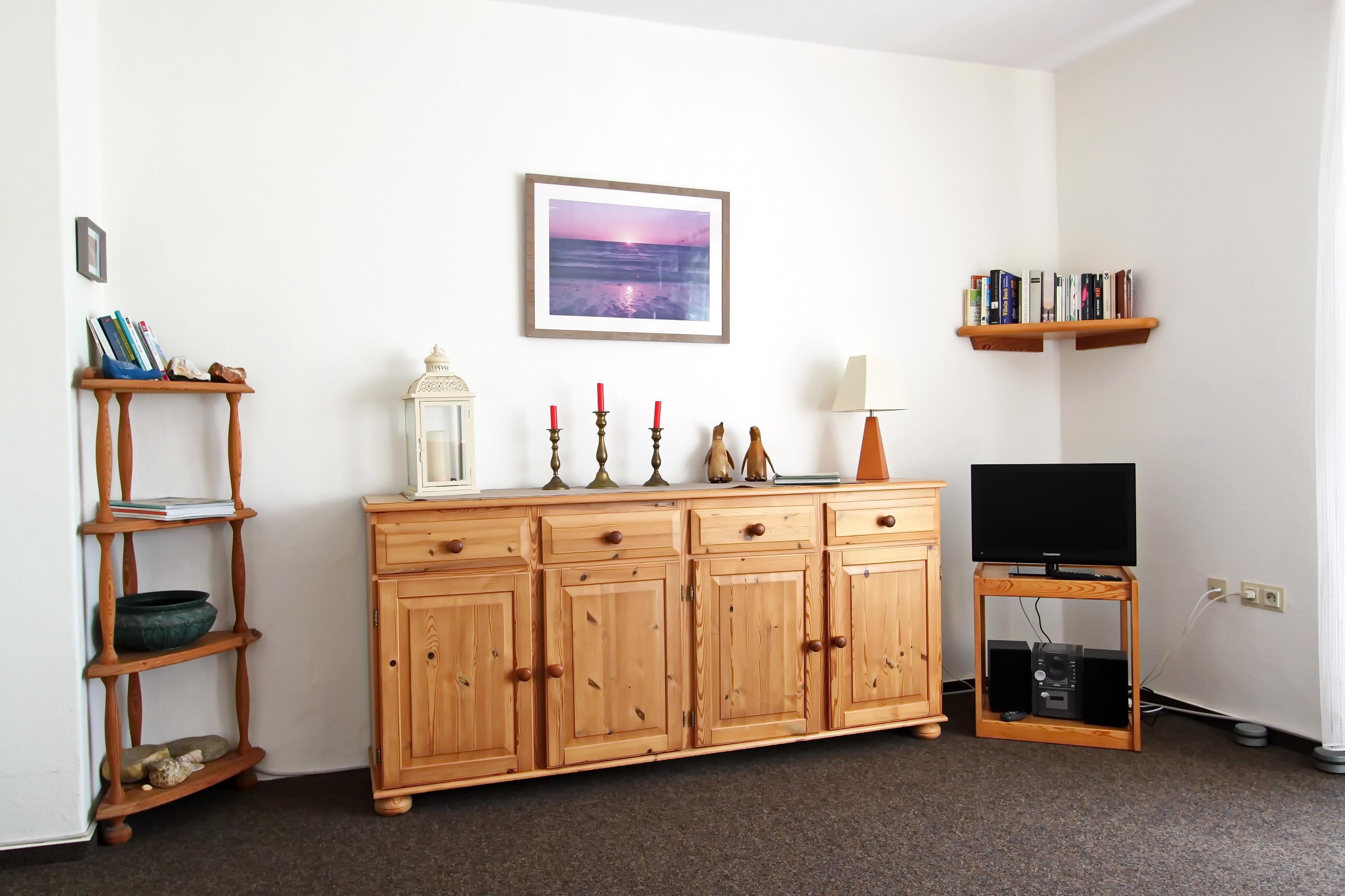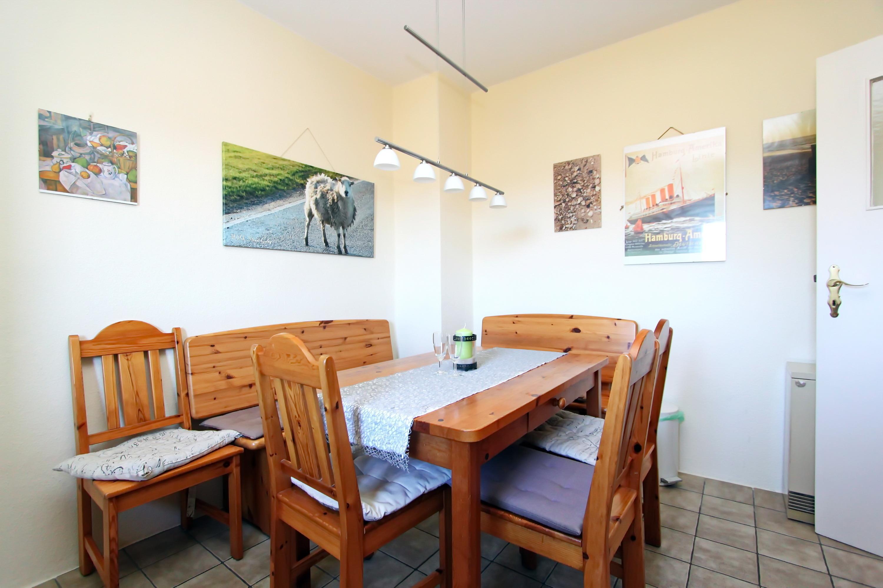 2 Zimmer Appartement im Herzen von Hörnum im 1.OG mit ca. 55m² für bis zu 4 Personen; ein Wohnraum mit Doppelschlafcouch, 2 Sessel, Tisch, Sideboard, Sat-TV, Zugang zum Südbalkon; ein separater Schlafraum mit Doppelbett und Kleiderschrank; Wannenbad/WC; Flur mit Garderobe; anrufbarer Festnetzanschluss; separate Einbauküche mit Ceranherd, Backofen, Mikrowelle, Kühlschrank mit kleinem Gefrierfach, Eckbank, Tisch und Stühle bieten ausreichend Platz zum Essen und Klönen. Ein Kinderreisebett ist im Appartement vorhanden. Zum Appartement gehört ein PKW-Stellplatz. Das Rauchen sowie die Tierhaltung sind nicht gestattet!