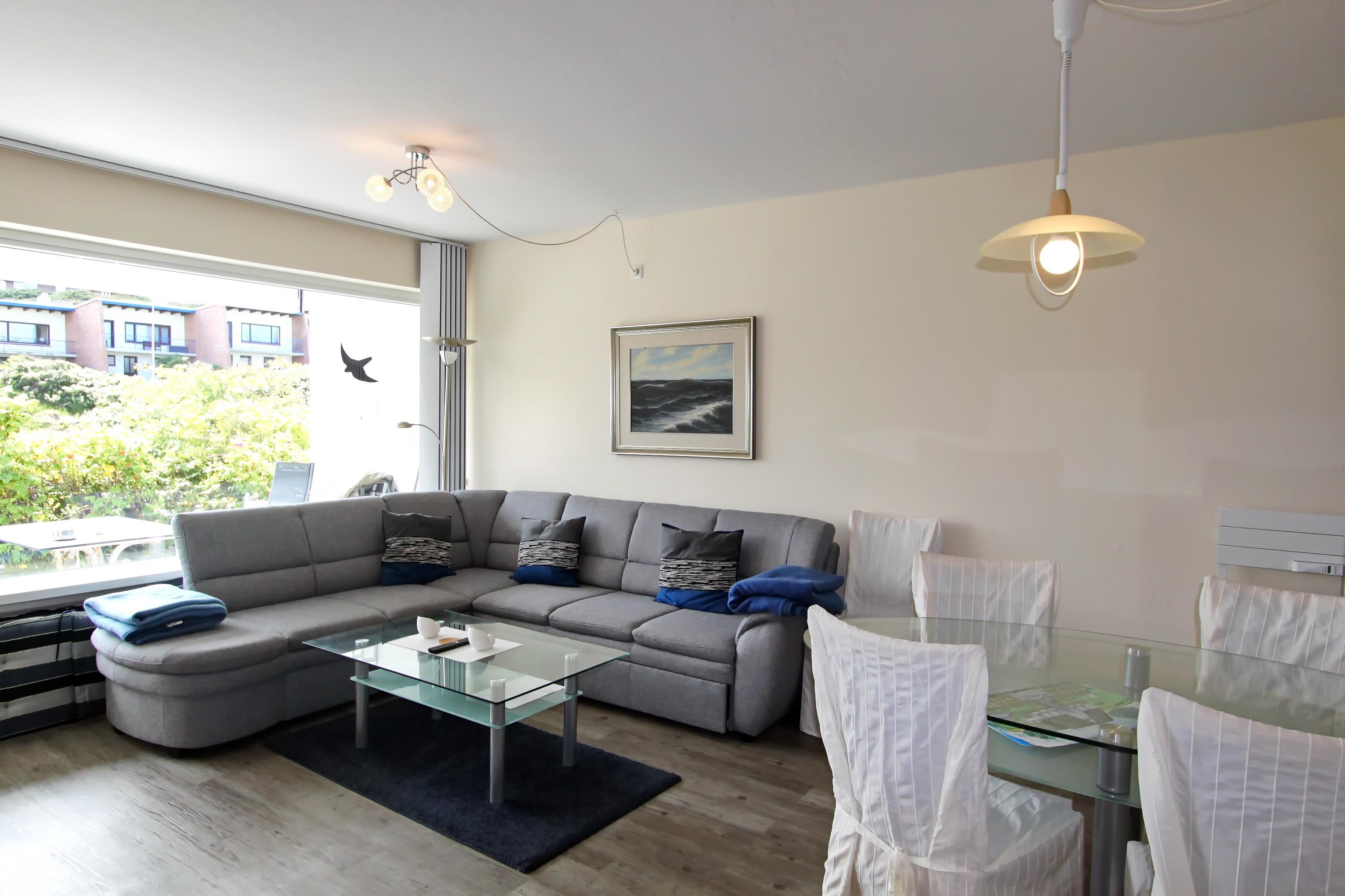 ebenerdig, mit ca. 55qm. Im hellen Wohnraum ist eine große, gemütliche Sofaecke, ein Glastisch, eine Kompaktanlage mit Radio u. CD-Player, ein Glasschrank mit SAT-Flat-TV sowie ein Essplatz für 4 Personen. Sie haben einen direkten Zugang zur Südterrasse mit Terrassenmöbel. Die kleine offene Küche mit Ceranfeld, Geschirrspüler, Kühlschrank mit Gefrierfach, Mikrowelle, Kaffeemaschine, Wasserkocher und Toaster bietet alles, um sich selbst zu versorgen.