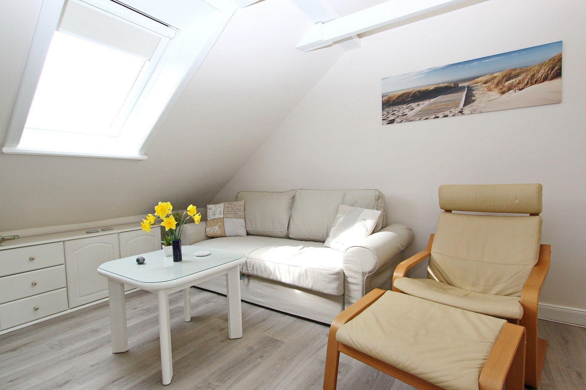 In 2016 kernsaniertes 2 Zimmer DG Appartement im Ortskern von Hörnum mit ca. 35m² für bis 3-4 Personen; ein Wohnraum mit einer neuen Schlafcouch, Tisch, Relax-Sessel zum Entspannen, Esstisch mit 4 Stühlen, offene Einbauküche mit Cerankochfeld, Backofen, Kühlschrank mit Gefrierfach und Geschirrspüler, Sat-Flat-TV, Sideboard, Kommode, separater Schlafraum mit Doppelbett und Kleiderschrank; Flur mit Garderobe und Bank, Duschbad/WC. Das Rauchen ist nicht gestattet! Ein PKW-Stellplatz (Nr. 9) gehört zum Appartement. Im Keller befindet sich eine Waschküche mit Münzwaschmaschine und Münztrockner. WLAN und Festnetzanschluss kostenlos vorhanden. Für die Internetnutzung ist eine Nutzungsvereinbarung zu unterschreiben.