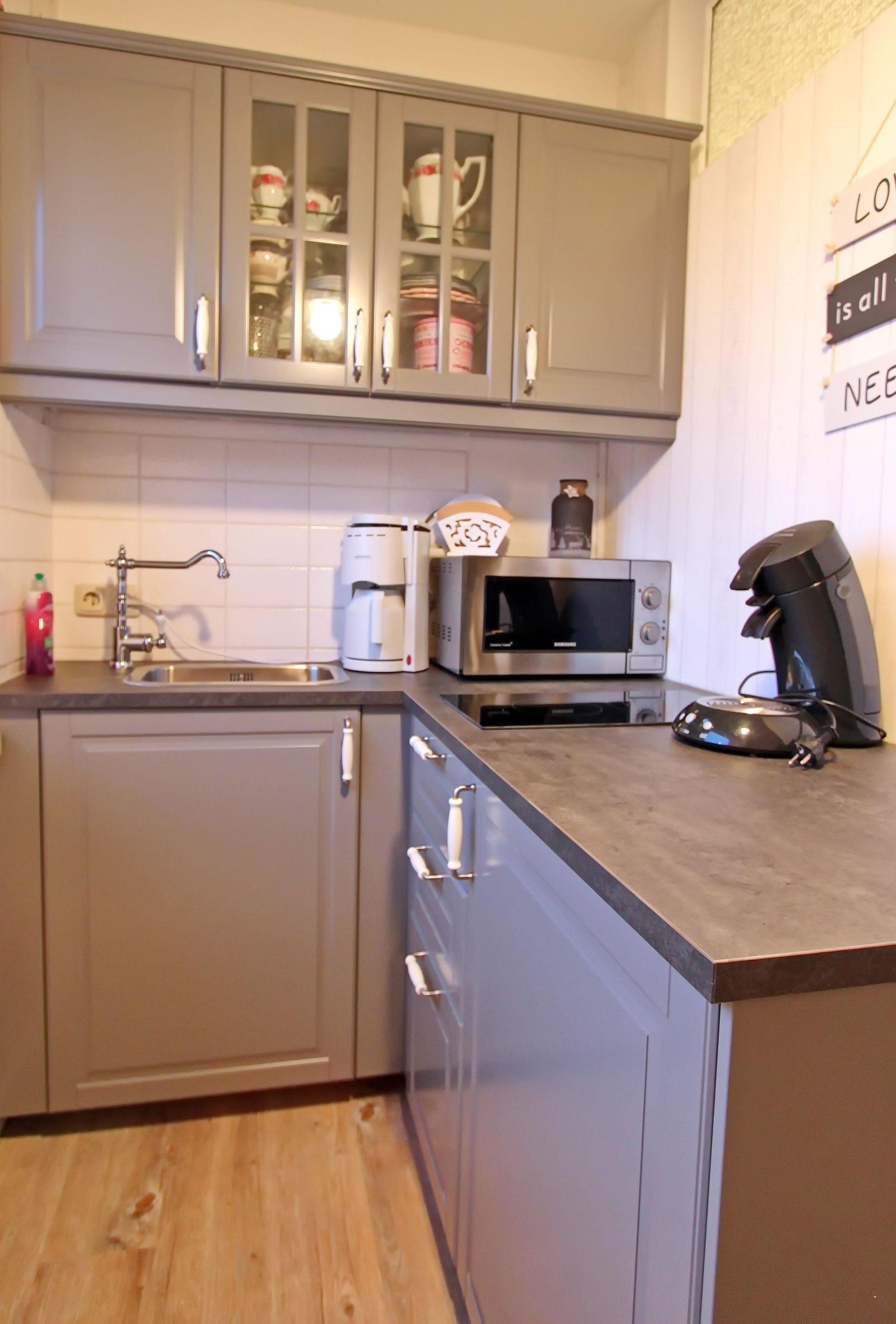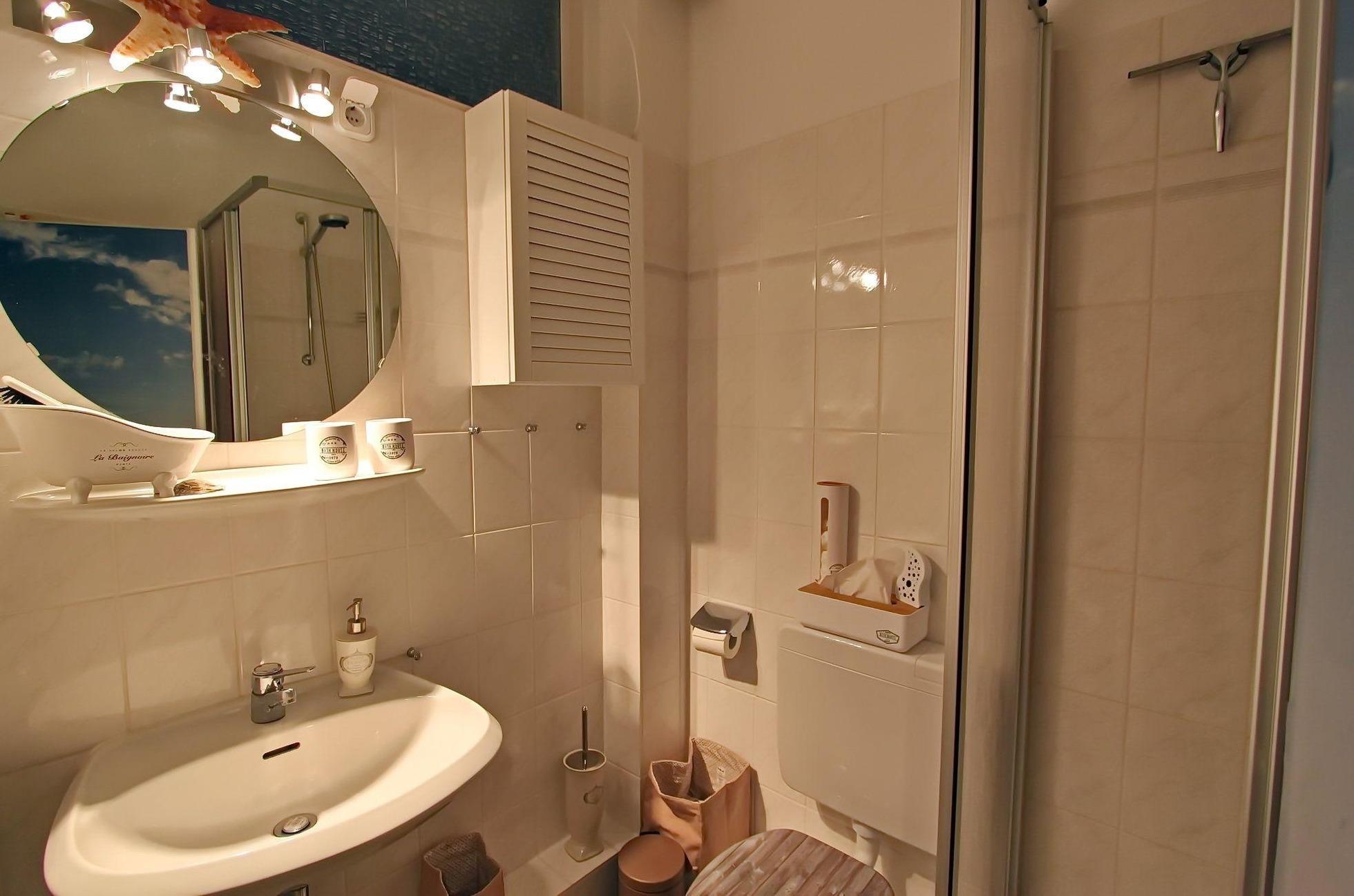 Die kleine Einbauküche verfügt über ein Cerankochfeld, Mikrowelle mit Grillfunktion, Kühlschrank mit kleinem Gefrierfach und allen Utensilien, die Sie benötigen, um sich selbst zu versorgen. An einem Esstisch mit zwei Stühlen können Sie Ihre Mahlzeiten einnehmen. Der Flur ist mit einer Garderobe und einem großen Einbauschrank eingerichtet, der genug Stauraum bietet. Von dort gelangen Sie in das Duschbad mit WC. Im kompletten Appartement wurde Designfußbodenbelag verlegt. Viele, aufeinander abgestimmte, maritime Accessoires runden das Gesamtbild ab. Ein PKW-Stellplatz (Nr. 21) vor dem Haus gehört ebenfalls dazu. Sie haben im Wirtschaftsraum die Möglichkeit, Ihre Wäsche zu waschen und ggf. zu trockenen (mit Münzzähler).