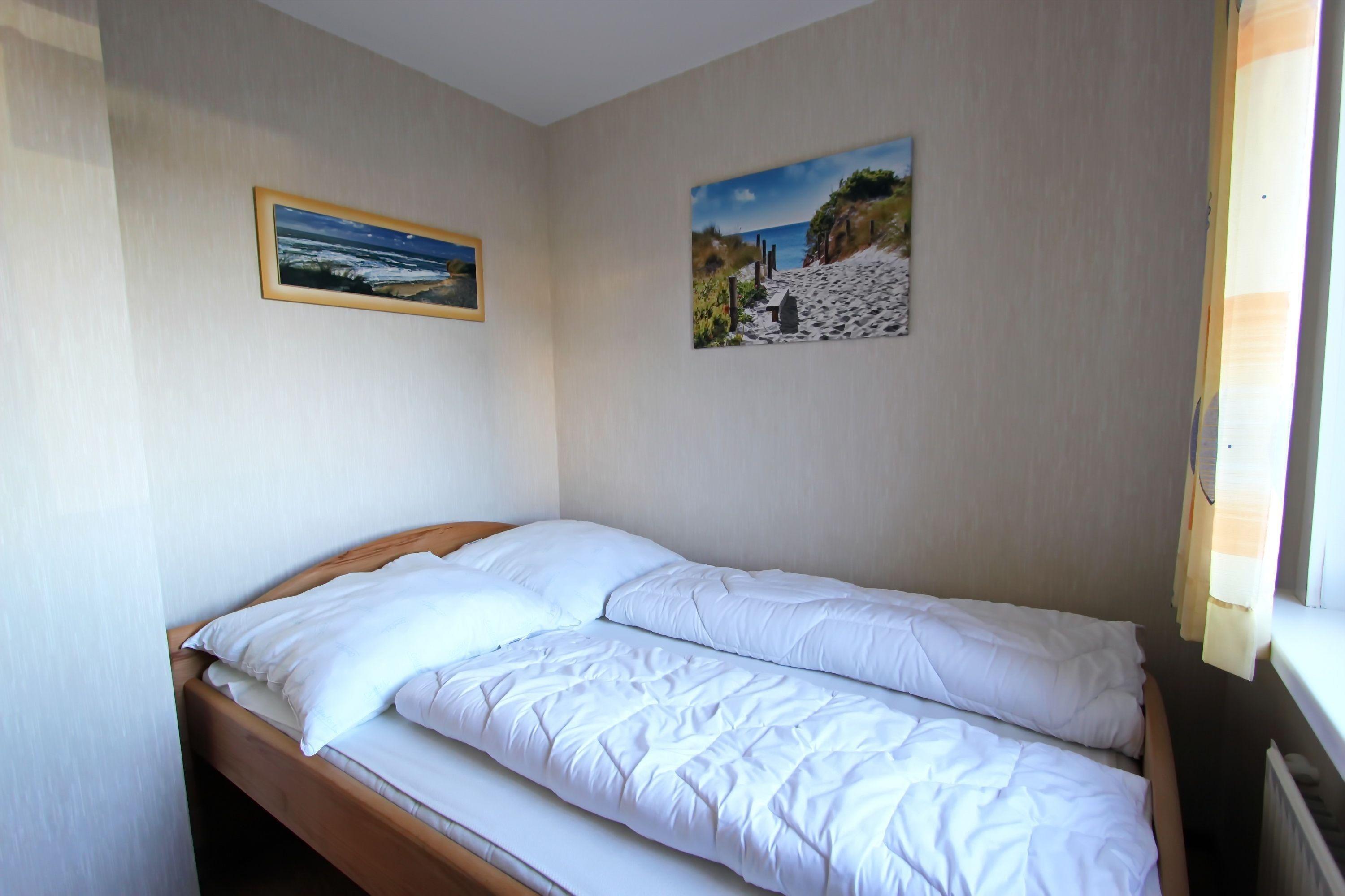 Im kleinen Zimmer befindet sich ein Doppelbett, ca 1,40 m breit, Ablageflächen, sowie ein