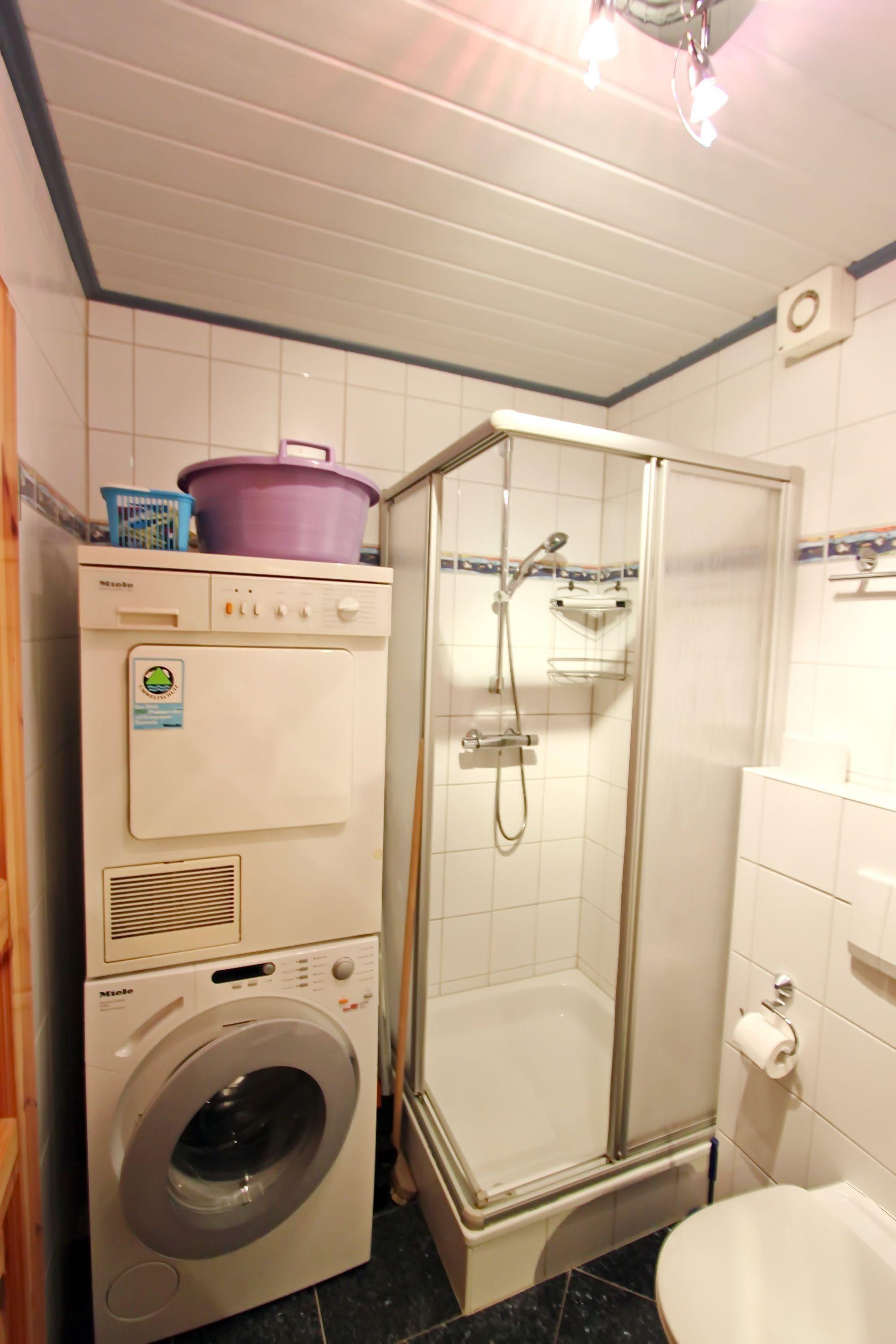 Waschmaschine und Kondenstrockner! Fußboden Granit, Wände gefliest, Decke vertäfelt (weiß).