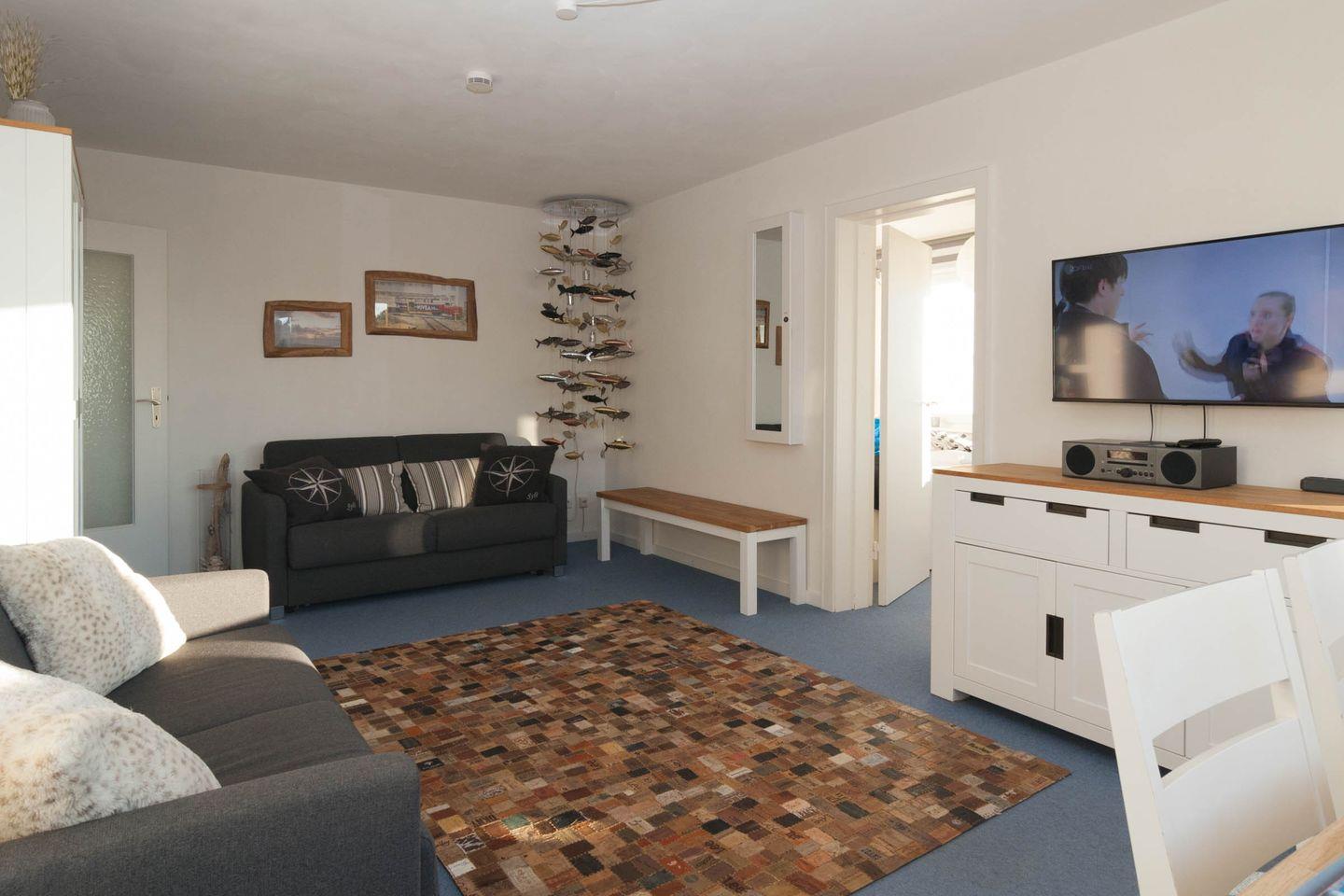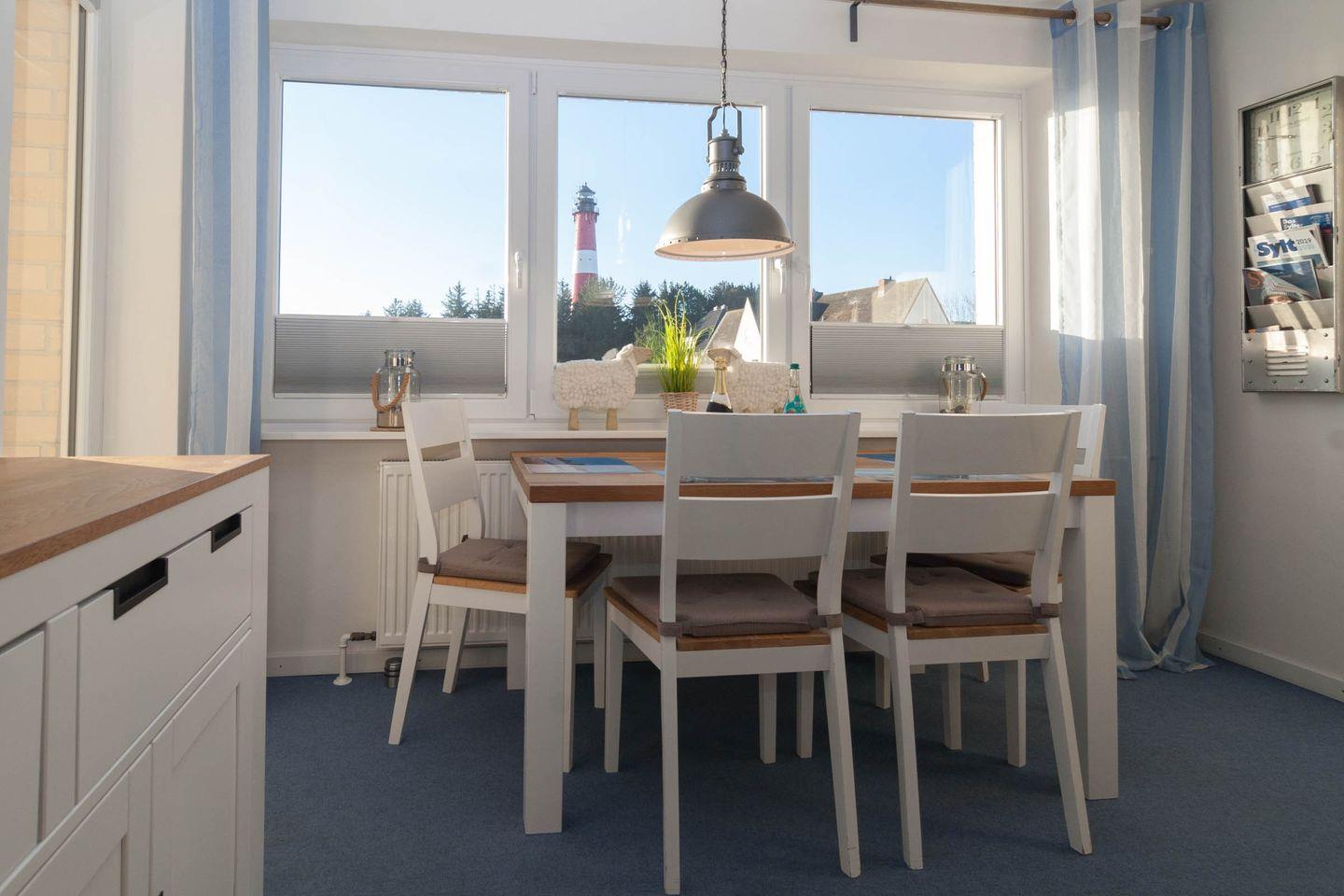 Diese Ferienwohnung mit Meerblick und Balkon ist für 4 Personen ausgestattet. Sie verfügt im Wohnbereich über 1 Schlafsofa was sich leicht ausklappen lässt. Das Schlafzimmer befindet sich mit dem Blick zum Oststrand im Nachbarzimmer. Vom Wohnzimmer / Esszimmer aus haben Sie einen fantastischen Blick auf die Ostseite, Südspitze und den Leuchtturm von Hörnum. Zur Wohnung gehört ein Duschbad und eine sep. kleine Küche, die mit allem ausgestattet ist, was man im Urlaub braucht.