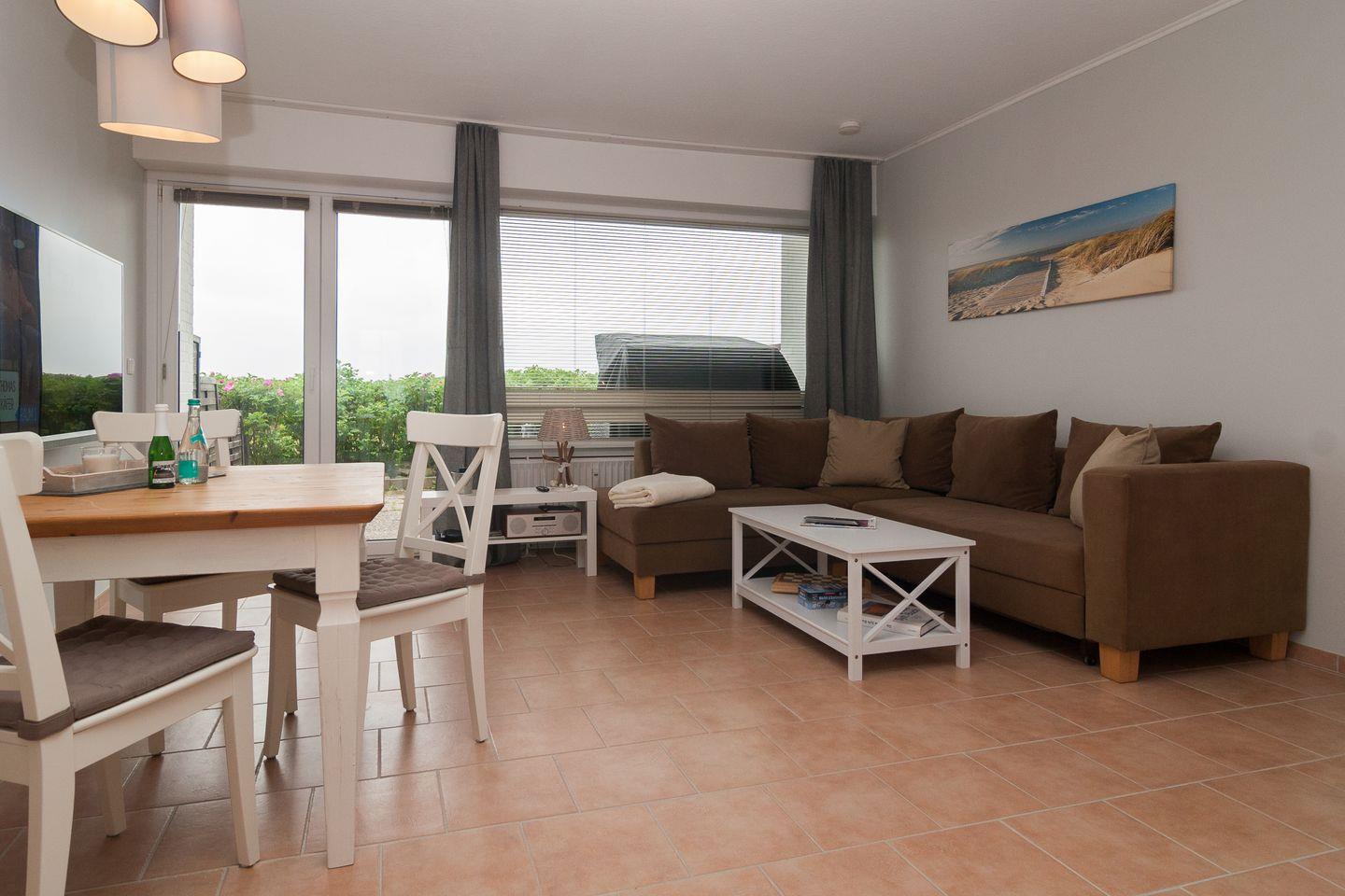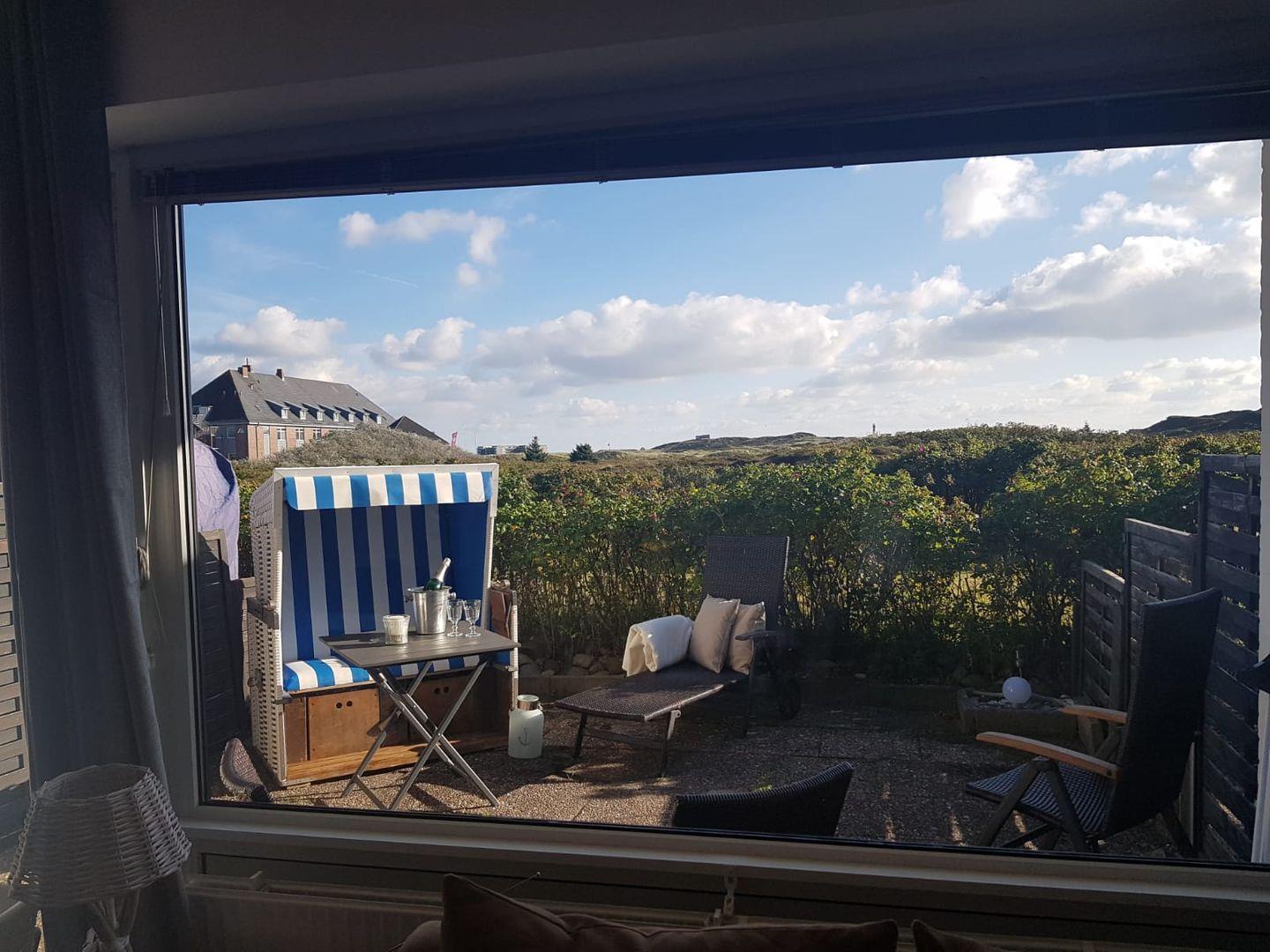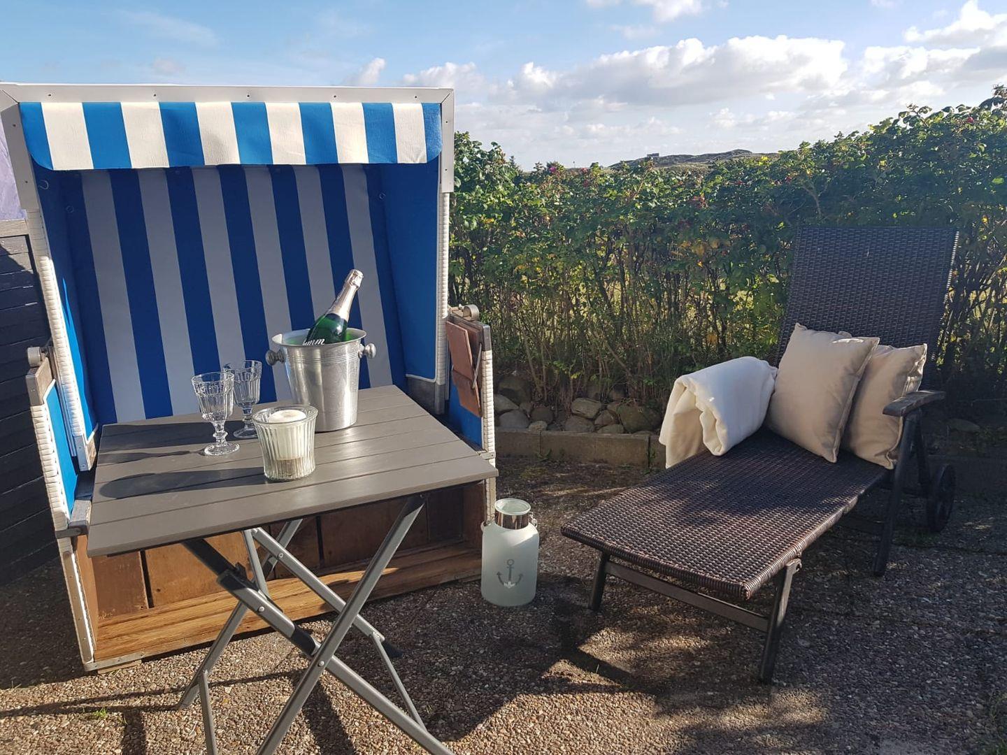Moderne, helle Ferienwohnung in Hörnum mit Süd-Terrasse und Strandkorb, ideal für entspannte Tage am Meer.
