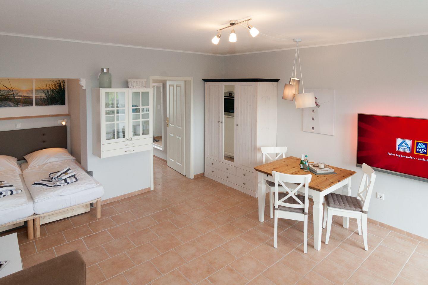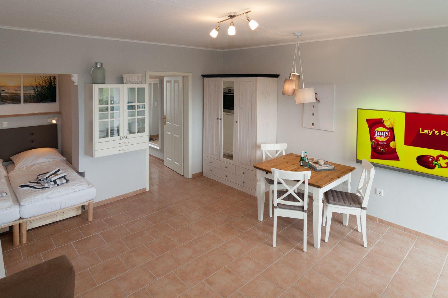 Moderne und helle Ferienwohnung mit einem Duschbad und einer separaten Küchenzeile. Im Wohnraum befinden sich eine gemütliche Sofaecke mit Flachbildschirm und einem gemütlichen Essbereich. Vom Doppelbett können Sie auch die abendlichen Nachrichten im Fernsehen genießen.
