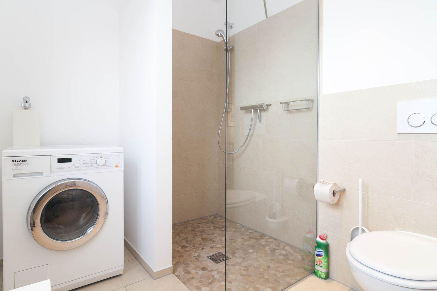 Das Haus bietet im Erdgeschoss eine moderne offene Küche mit Essbereich und Wohnbereich. Von hier aus kommen Sie in den Gartenbereich. Ein modernes Duschbad mit eigener Waschmaschine befindet sich ebenfalls im Erdgeschoss.