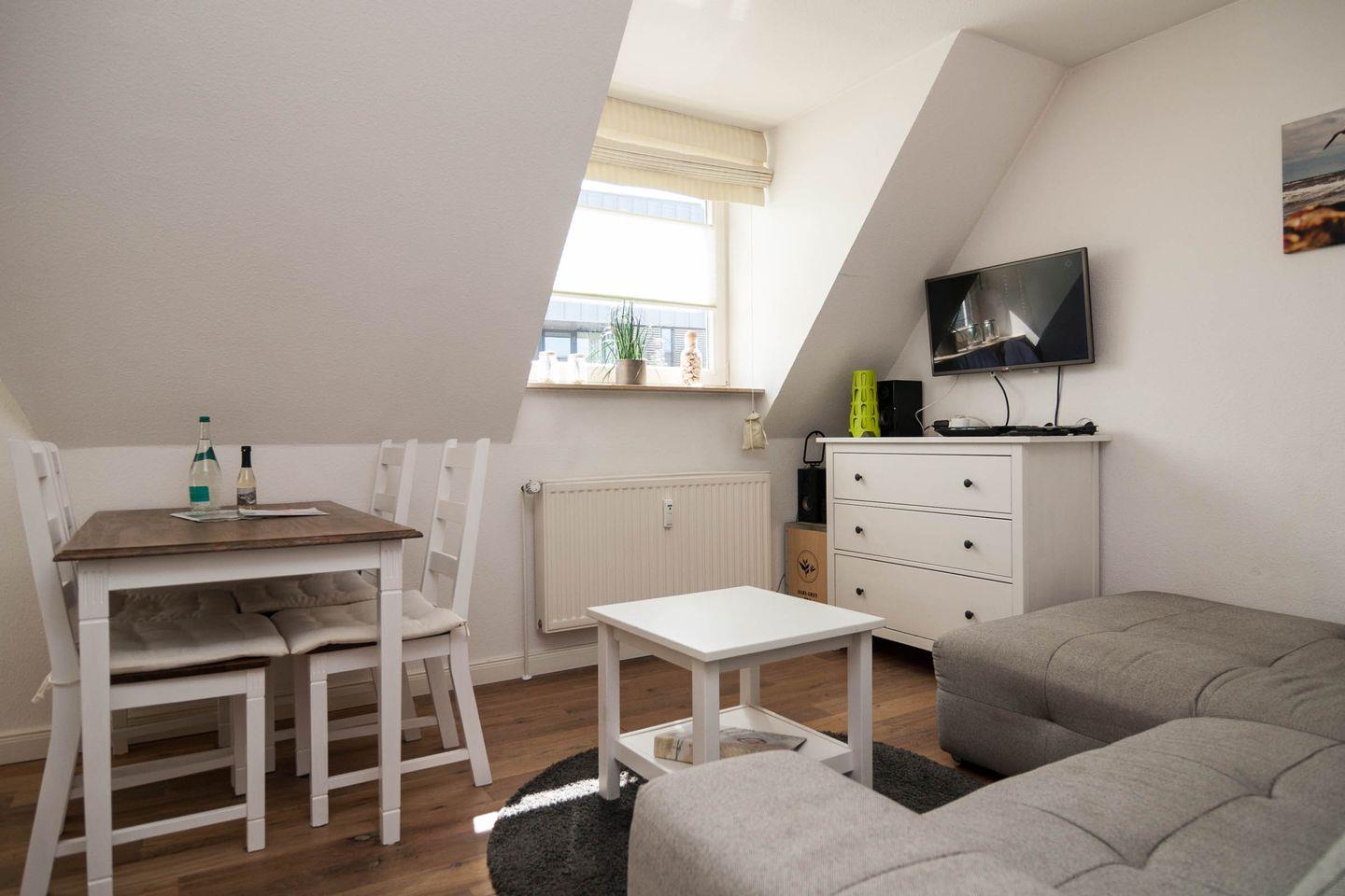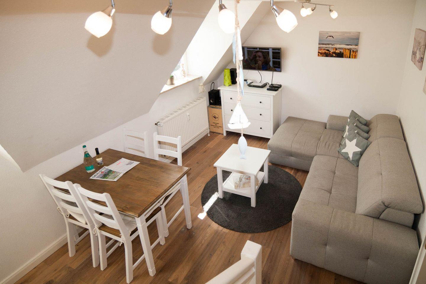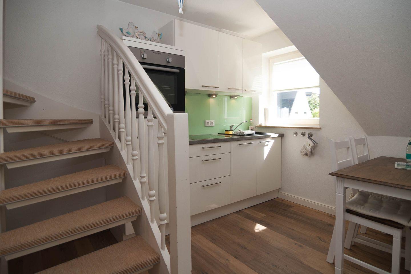 Gegenüber befindet das moderne Duschbad und geradeaus der komfortable Wohnraum mit Esstisch und Küchenzeile. Von dort geht es über die offene Treppe in das 2. Schlafzimmer unter dem Dach, mit Doppelbett, das Erwachsene wie auch Kinder lieben werden.