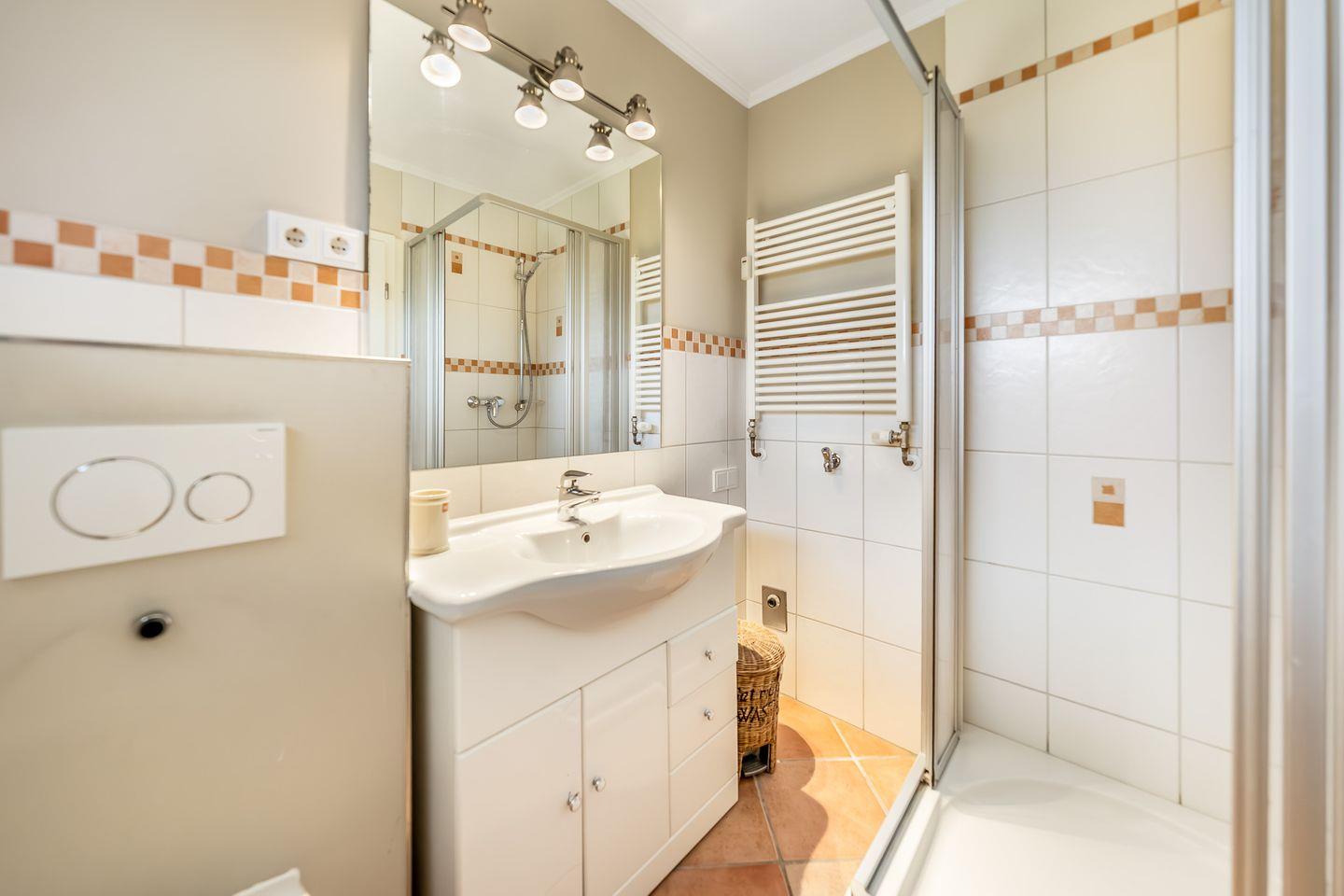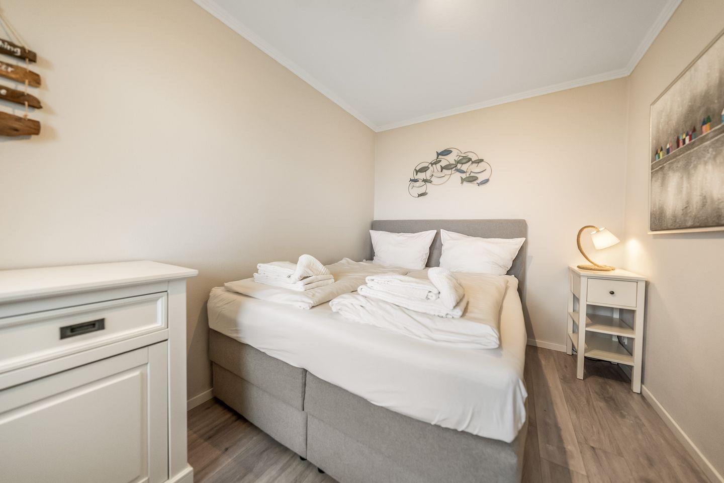Auch das zweite Schlafzimmer ist hell eingerichtet und verfügt über ein Doppelbett sowie einem Kleiderschrank. Das Badezimmer verfügt über eine