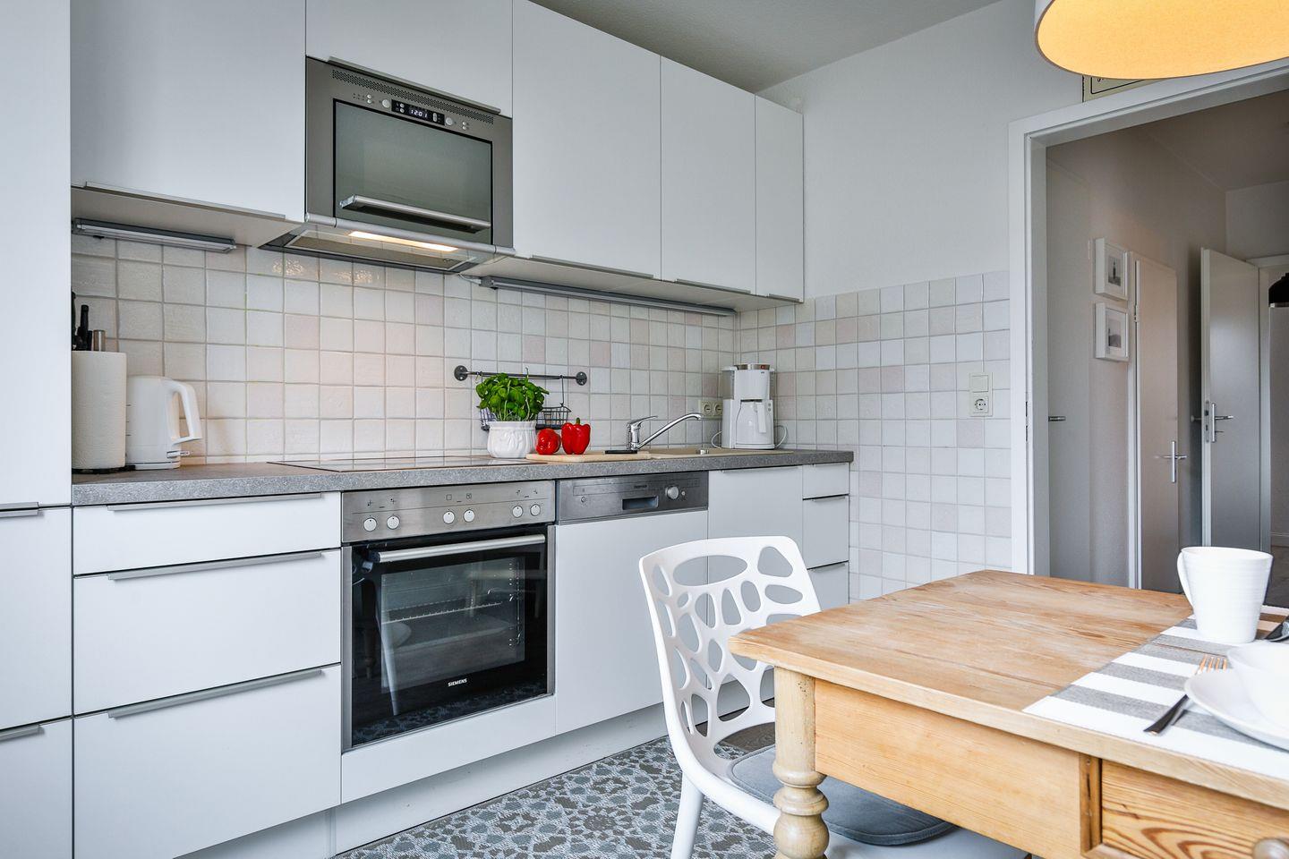 Küche mit Backofen, Mikrowelle, Spülmaschine und gemütlichem Sitzbereich. Das