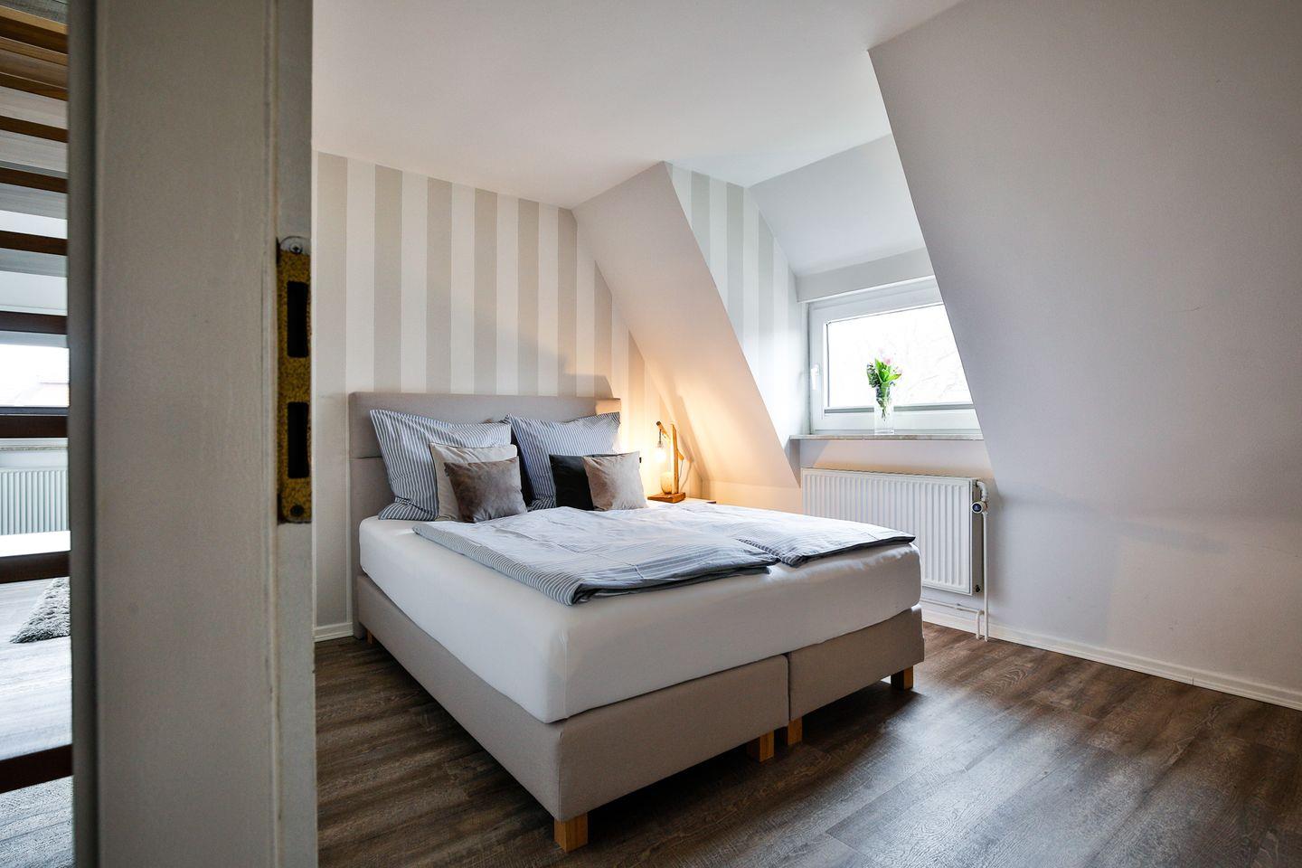 gemütliche Schlafzimmer mit Doppel-Boxspringbett, Stauraum und Smart-TV auf Sie