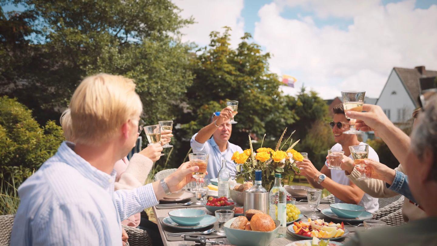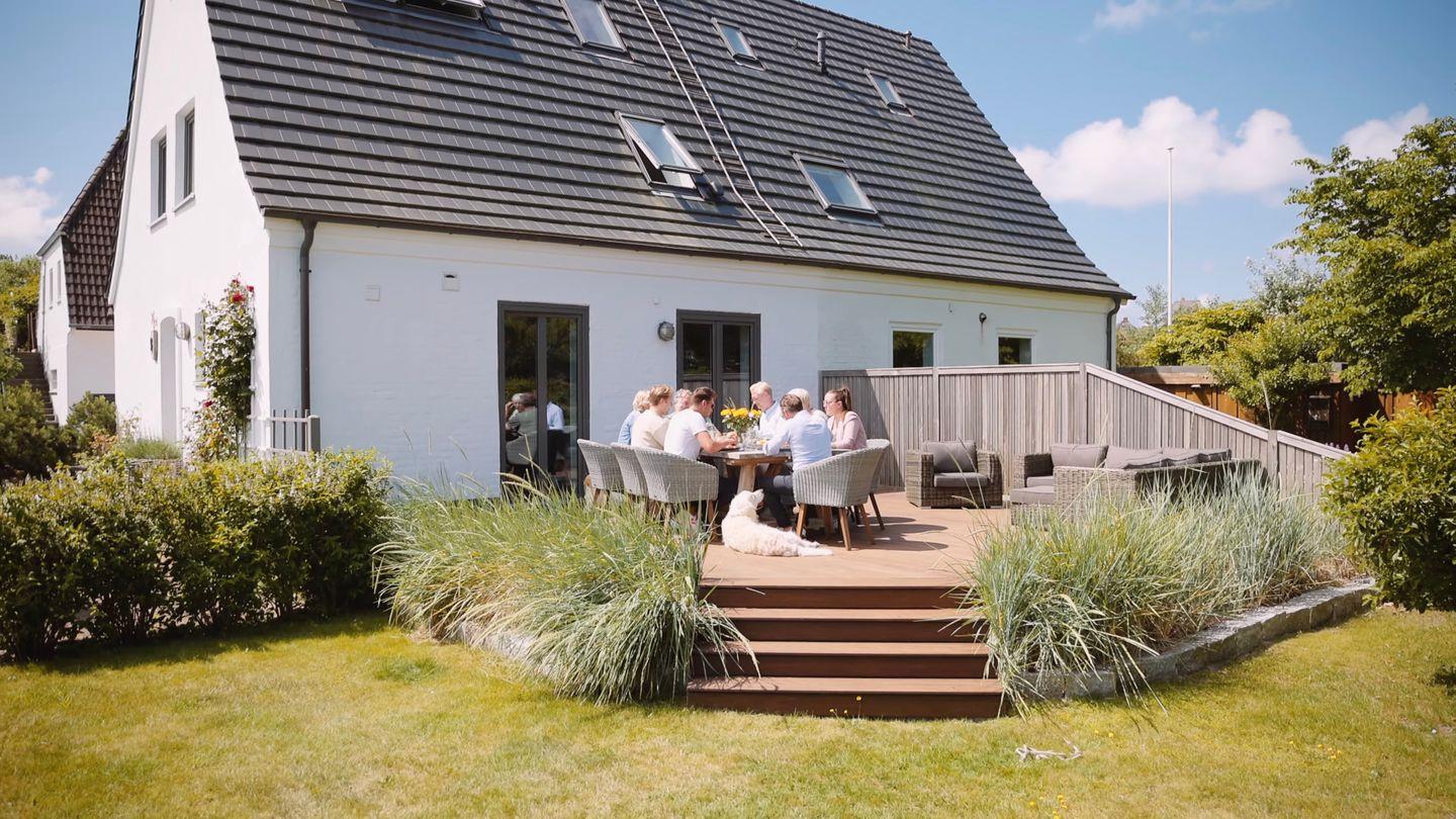 Terrasse ist mit einem großen Tisch, Lounge-Ecke, Sonnenliege und Strandkorb