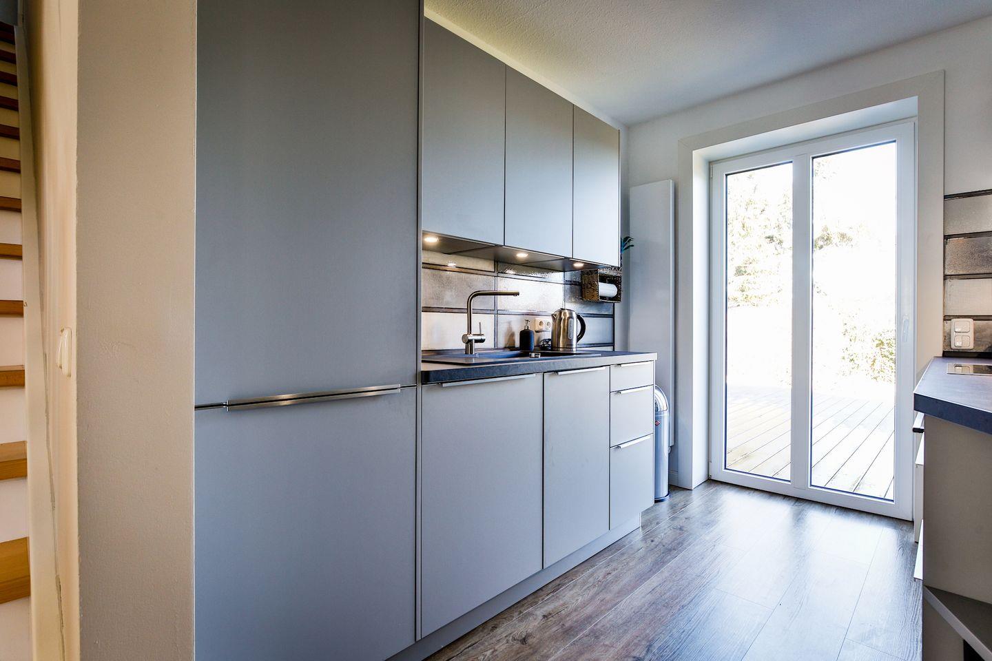 moderne, offene Küche mit einem weiteren Terrassenzugang. Die großzügige