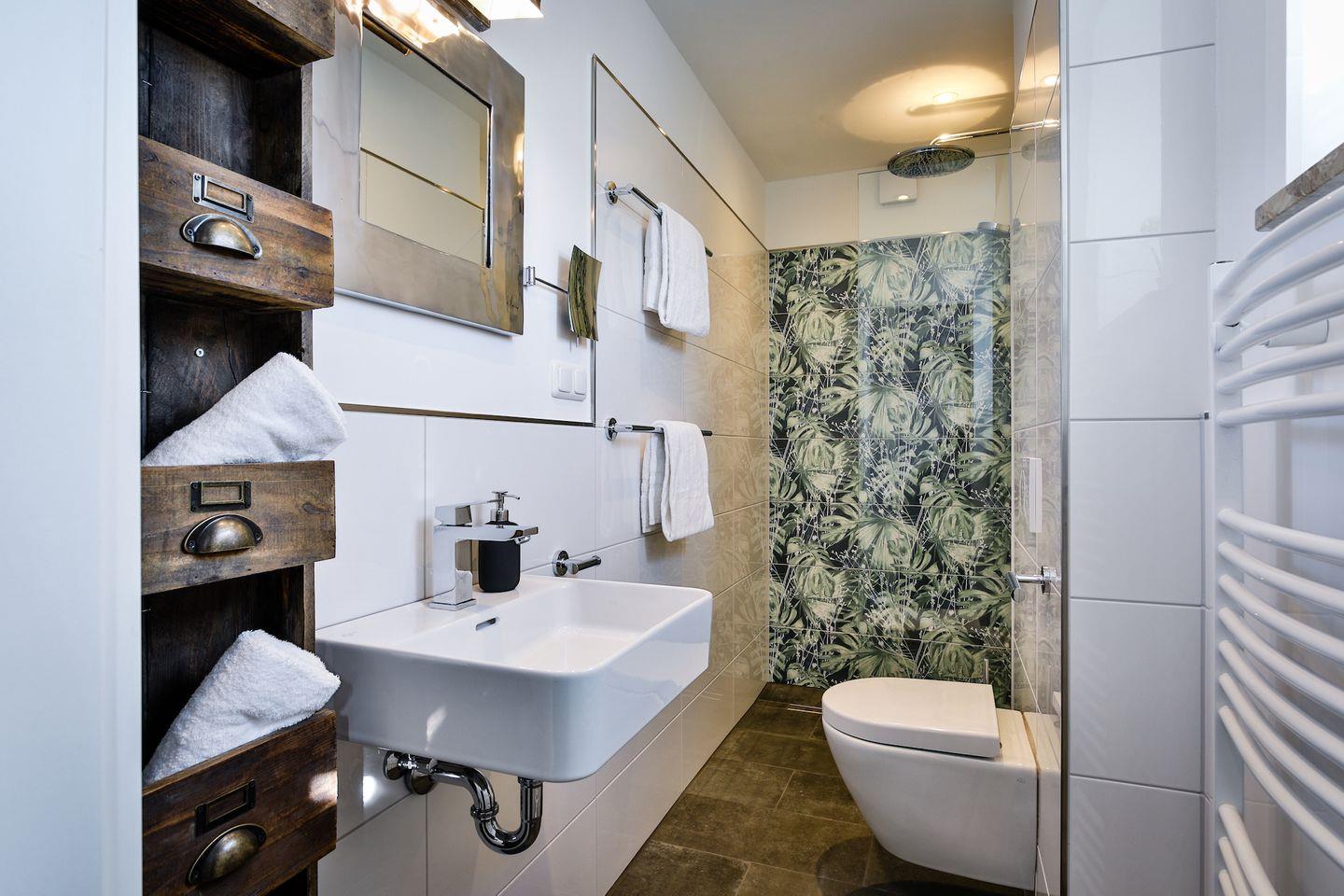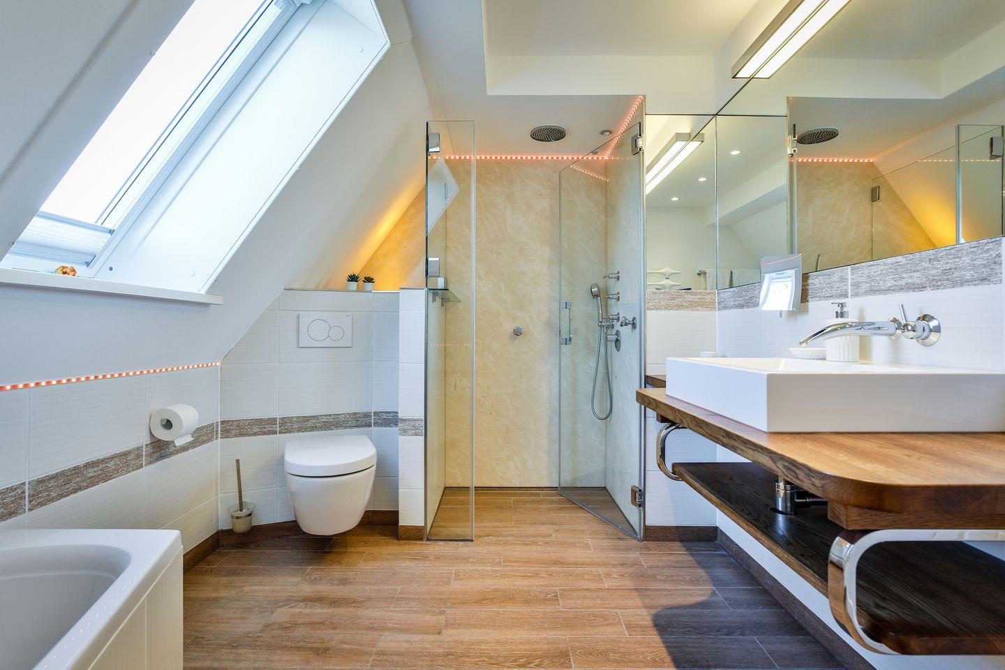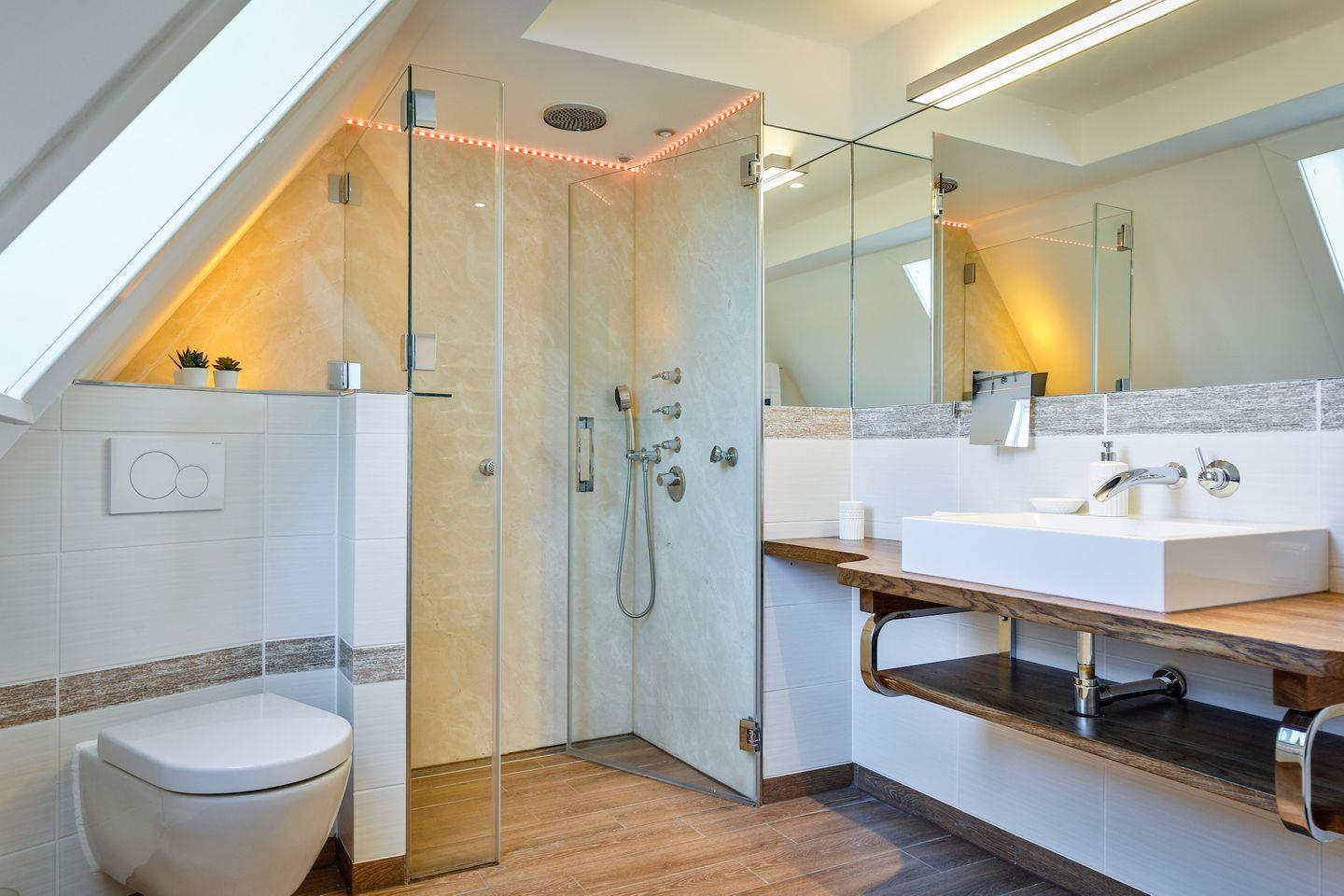 bodentiefer Dusche, Toilette und modernem Waschtisch befindet sich ebenfalls in