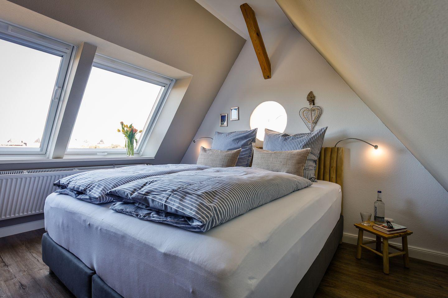 großzügiges, lichtdurchflutetes Schlafzimmer mit Doppel-Boxspringbett,
