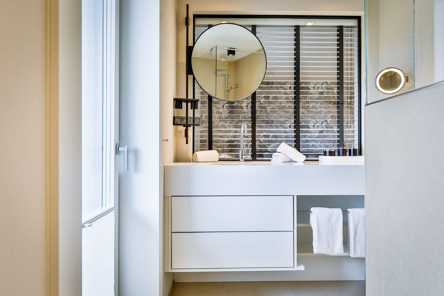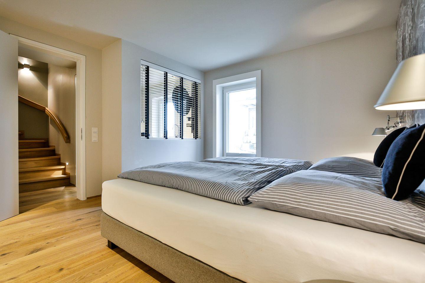Die beiden Schlafzimmer im Warftgeschoss verfügen jeweils über ein Duschbad en