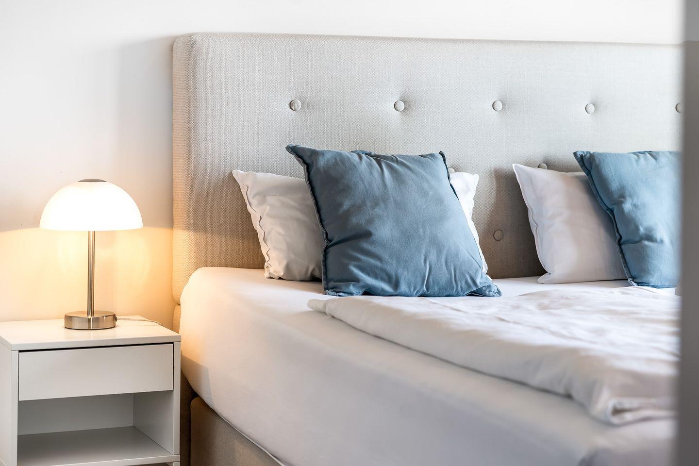 Das gemütliche Schlafzimmer bietet einen schönen Ausblick auf die Ostseite Hörnums. Es ist mit einem Boxspringbett und einem Schrank eingerichtet.
