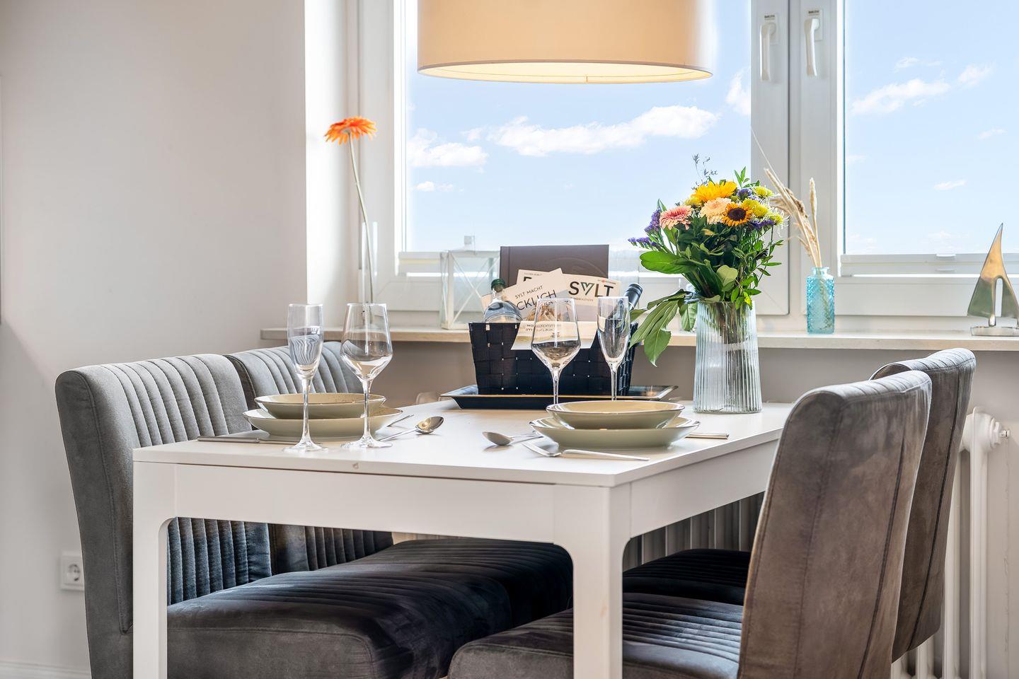 Der helle, modern gestaltete Wohnbereich ist mit einem gemütlichen Sofa ausgestattet, das auch als Schlafcouch genutzt werden kann. Eine Essecke und eine gut ausgestattete Küchenzeile sind ebenfalls vorhanden. Auf dem Südbalkon mit Sitzgelegenheiten können Sie Ihren morgendlichen Kaffee im Sonnenschein genießen. Vom Sofa aus haben Sie einen traumhaften Blick über den Golfplatz bis hin zum Hörnumer Hafen und bei guter Sicht sogar bis zu den Inseln Föhr und Amrum.