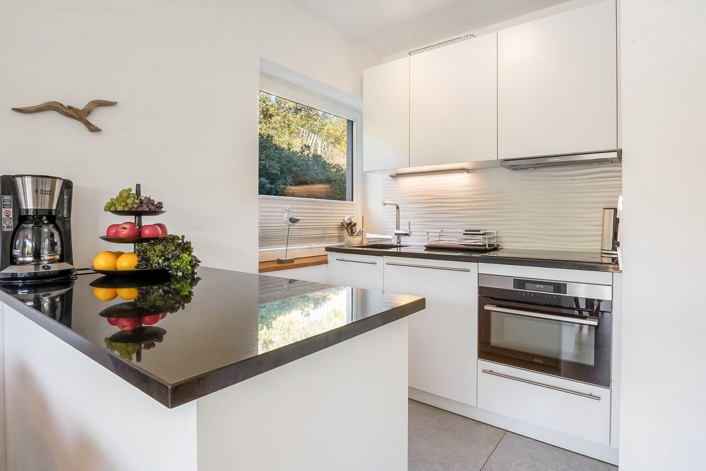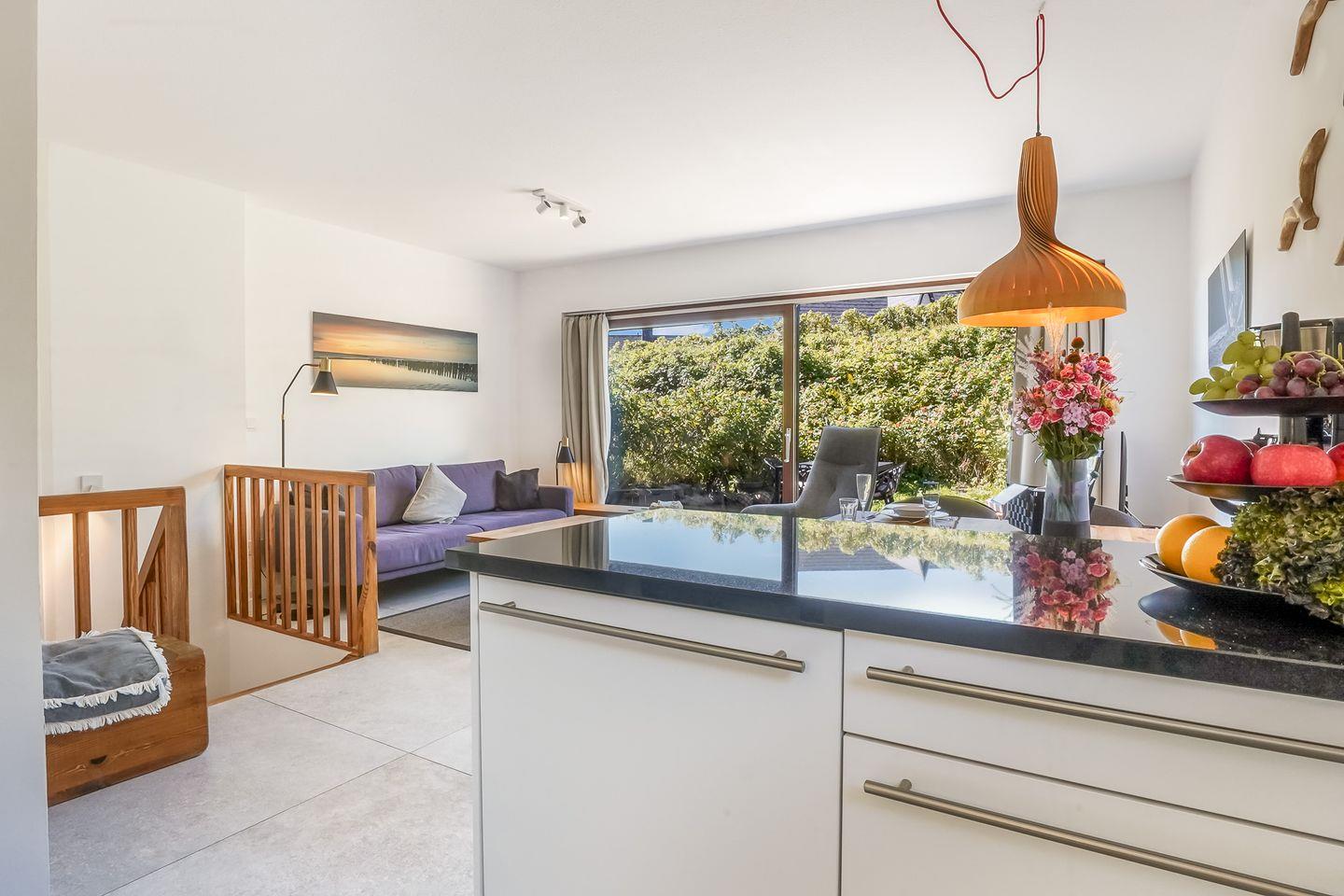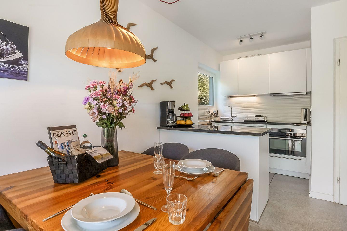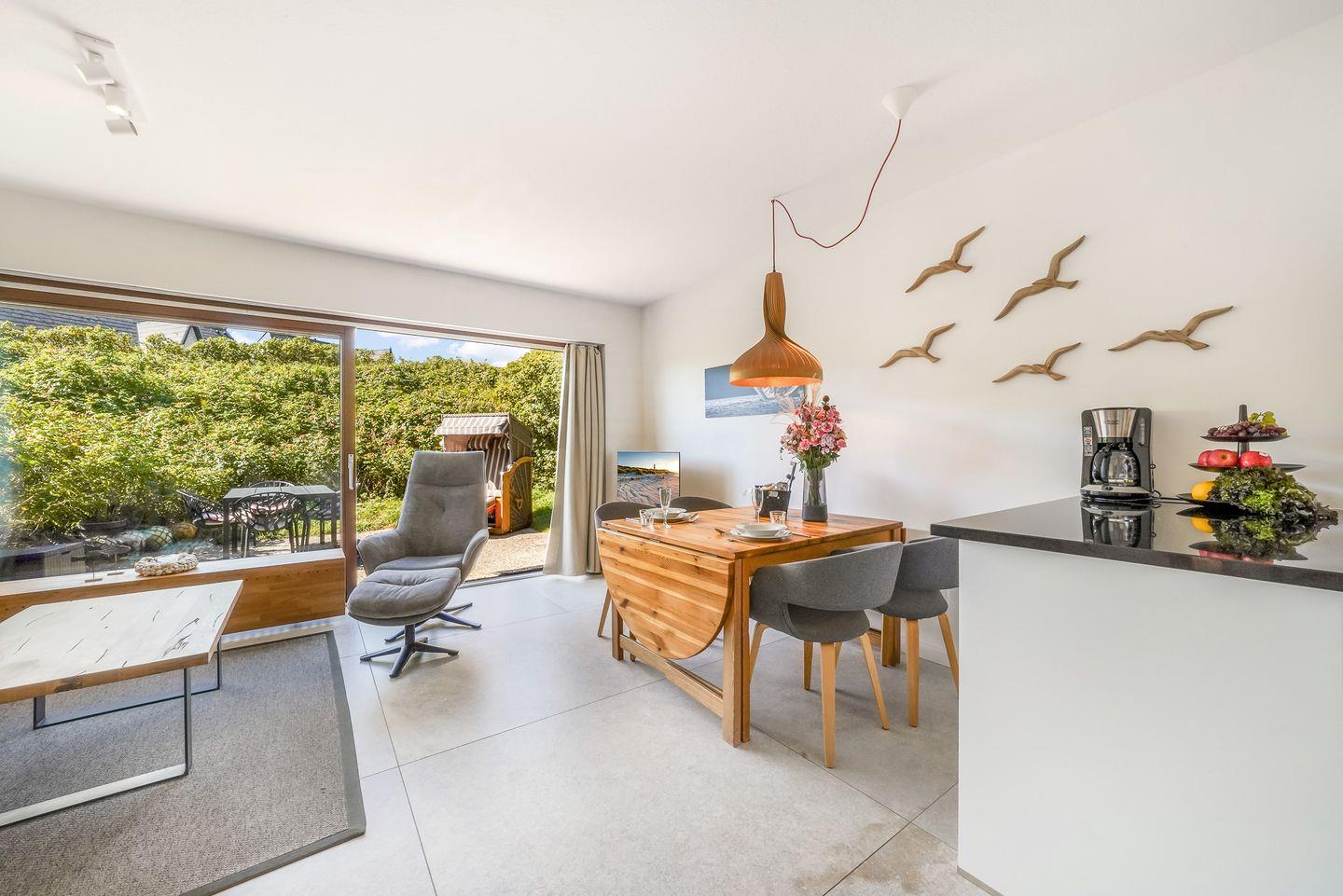 Im modernen, eleganten Stil bietet unsere Ferienwohnung Ihnen jeglichen Komfort. Die ruhig gelegene Terrasse ist Richtung Süd-West ausgerichtet, so dass Sie die Sonne von morgens bis abends geniessen können. Sie ist mit einem Strandkorb und Gartenmöbeln ausgestattet und liegt windgeschützt inmitten von Sylter Rosen. Sollte es stürmen oder regnen, gehen Sie eine Treppe tiefer direkt im Haus im Bademantel in das Schwimmbad oder schwitzen in der Sauna. Die Wohnung verfügt über einen Eingangsbereich mit Garderobe, 2 Schlafzimmer mit je 2 Doppelbetten und ein modernes Duschbad. Das Kernstück der Wohnung ist der gemütliche, großzügige Wohnbereich mit offener, hochwertiger Küche, die keine Wünsche offen lässt. Aufgrund der Kücheninsel, wird Ihnen genügend Platz für ausgiebige Kochabende mit Familie & Freunden geboten.