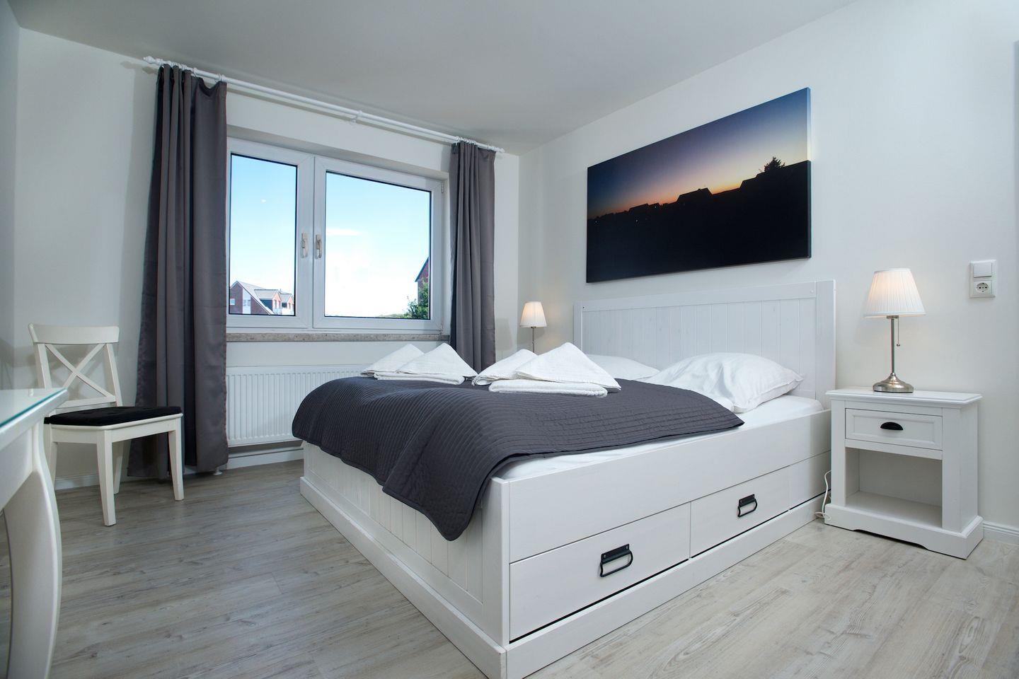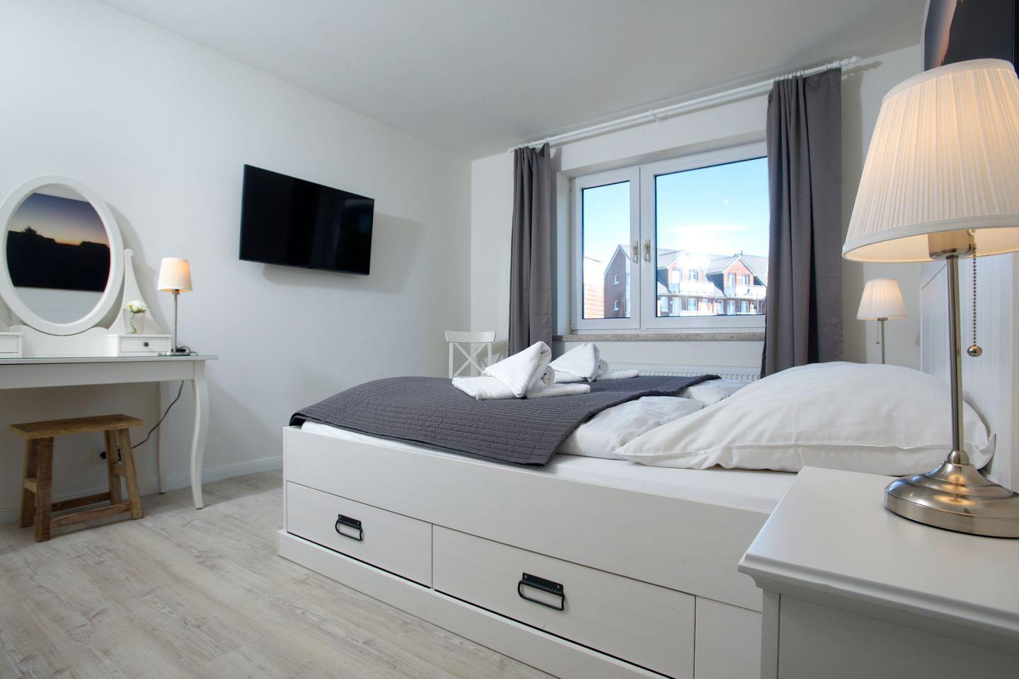Wohn- und Schlafzimmer der Wohnung verfügen über einen Flachbildfernseher und ein WLAN-Zugang ist selbstverständlich vorhanden. Ein Auto-Stellplatz liegt direkt neben dem Eingang zur Wohnung. Die moderne und stilvolle Ausstattung der Wohnung macht sie zu einem idealen Ausgangspunkt für einen erholsamen Urlaub in Hörnum.