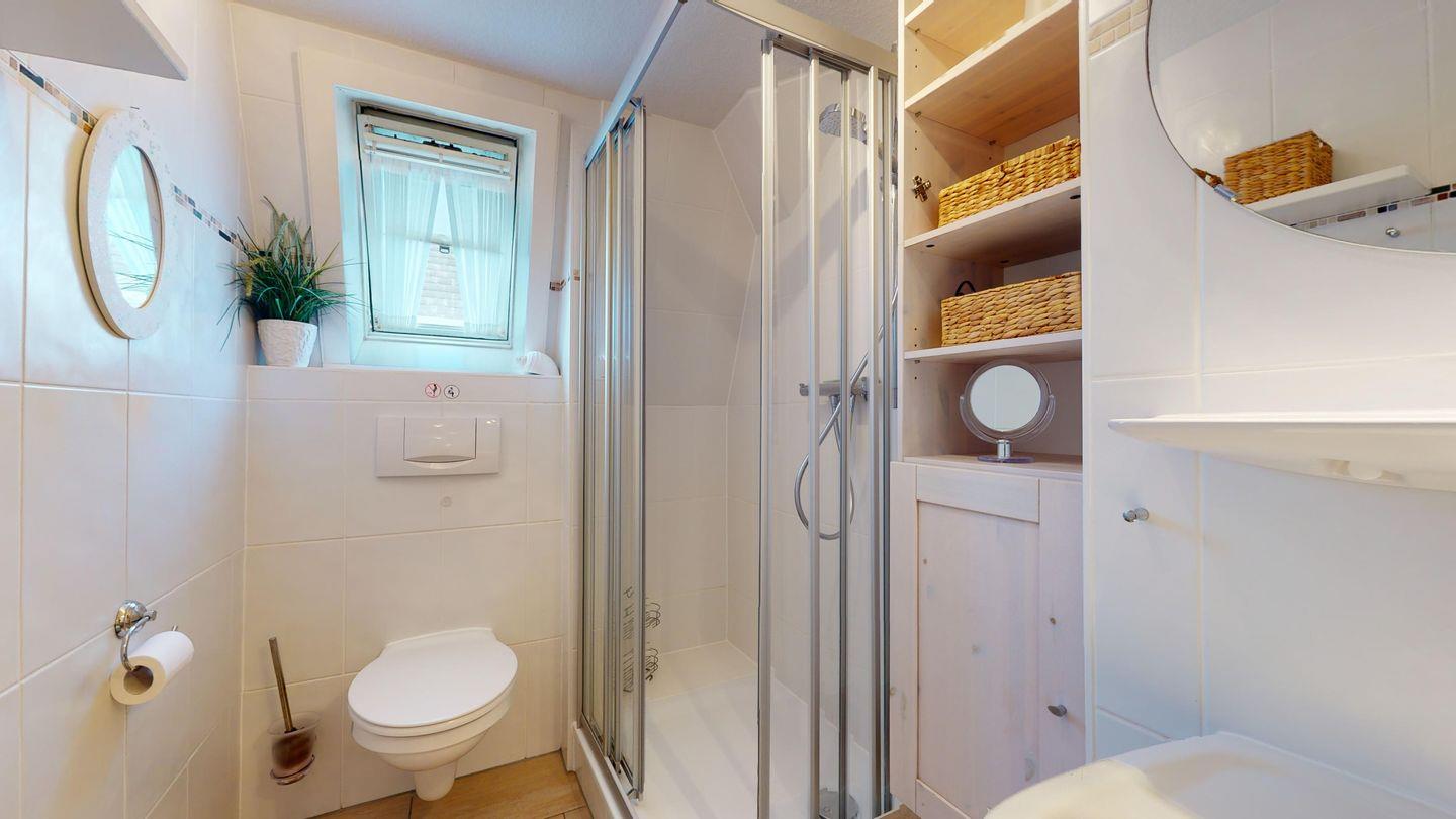 Das Tageslichtbad ist mit einer Dusche sowie einem WC und einem Waschtisch ausgestattet.