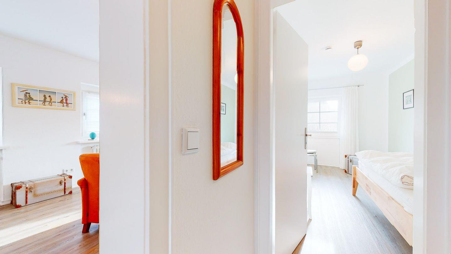 Ferner befinden sich zwei Schlafzimmer mit Einzelbetten und ein geräumiges Badezimmer in der Ferienwohnung. Neben Paaren auch ideal für Freund:Innen, die gemeinsam ihren Urlaub verbringen möchten.