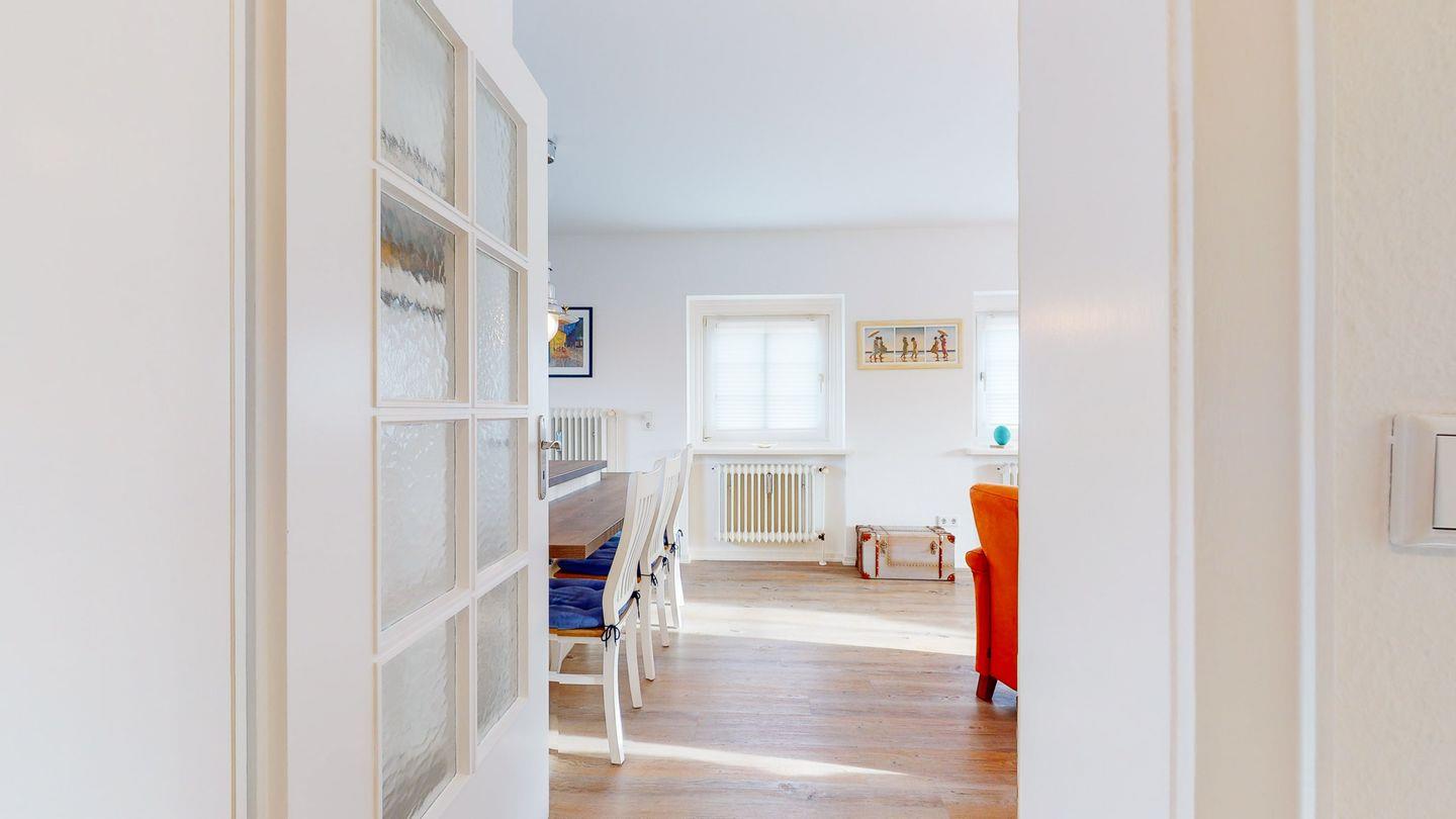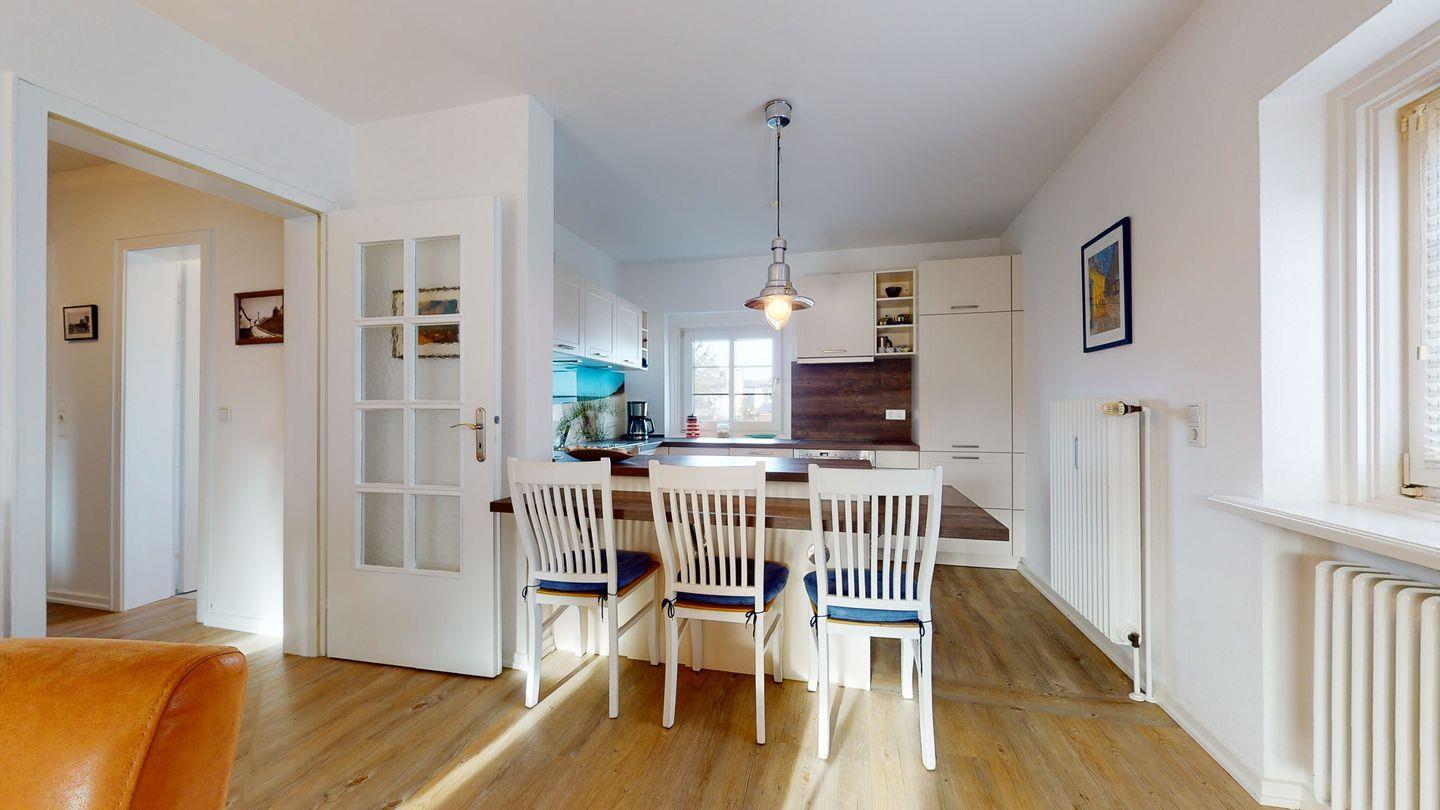 Die Wohnung selbst verfügt über eine offene Küche mit Thekenteil. Im geräumigen Wohnzimmer kann man es sich in den Abendstunden gemütlich machen.