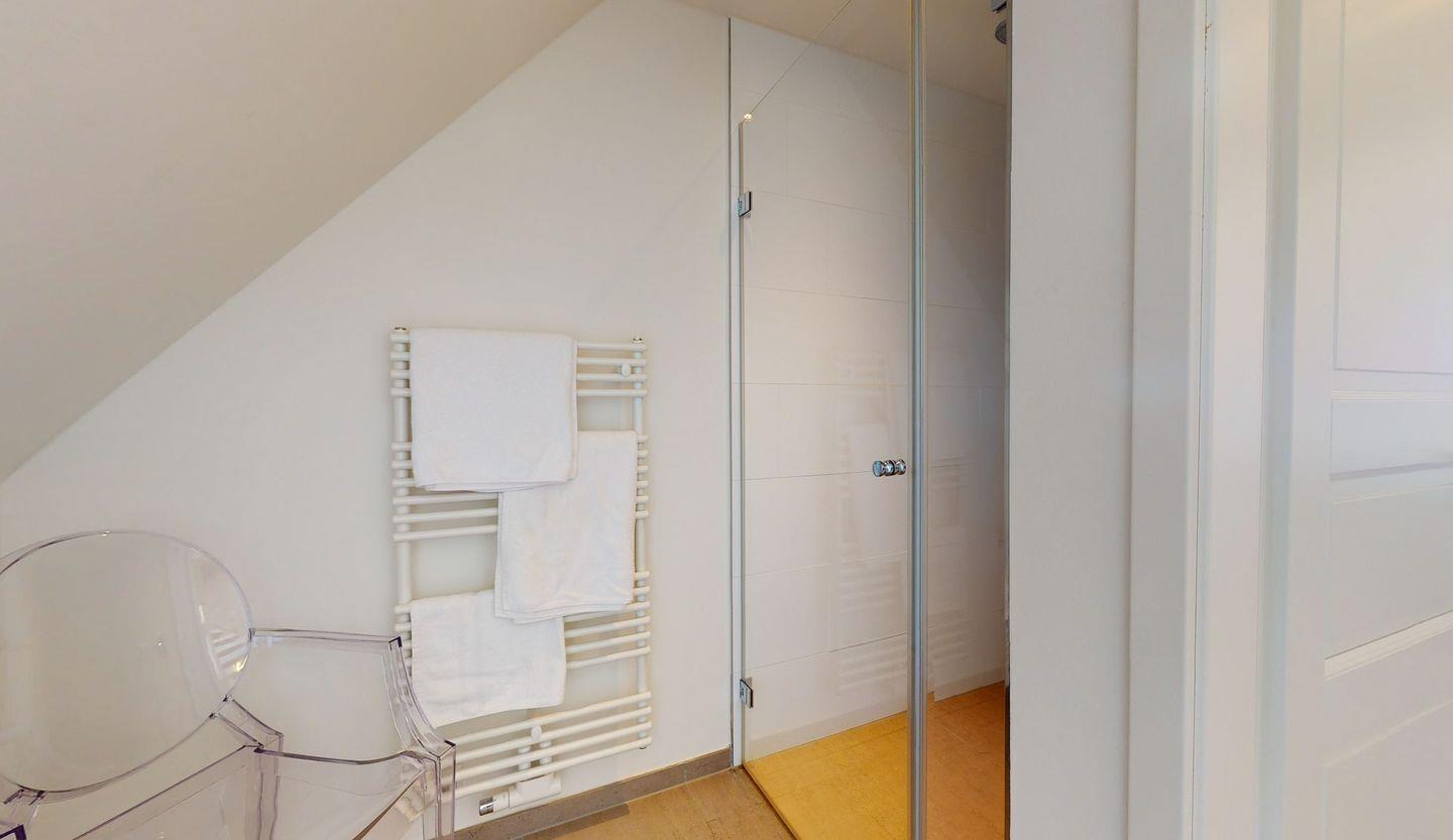 Das Innere der Wohnung präsentiert sich in modernem Design, das Eleganz und Komfort in perfektem Einklang vereint. Der Holzdielenboden verleiht dem Raum eine warme und gemütliche Atmosphäre, während das Badezimmer mit hochwertigen Natursteinfliesen überzeugt, die eine zeitlose Eleganz ausstrahlen.