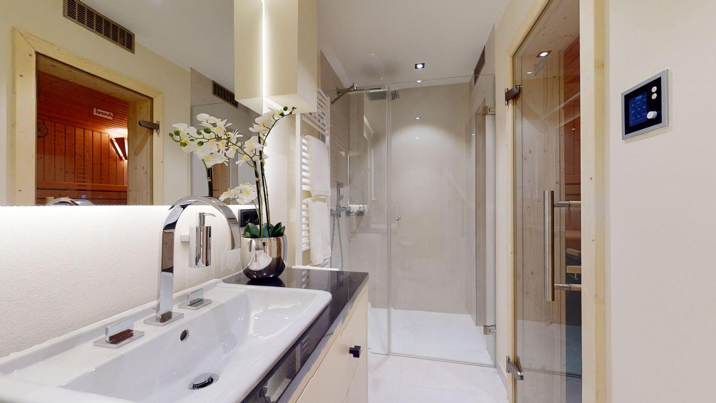 Das moderne Badezimmer ist mit einer Regendusche und einer privaten Sauna ausgestattet – für entspannte Wellness-Momente in Ihrem eigenen Urlaubsdomizil.